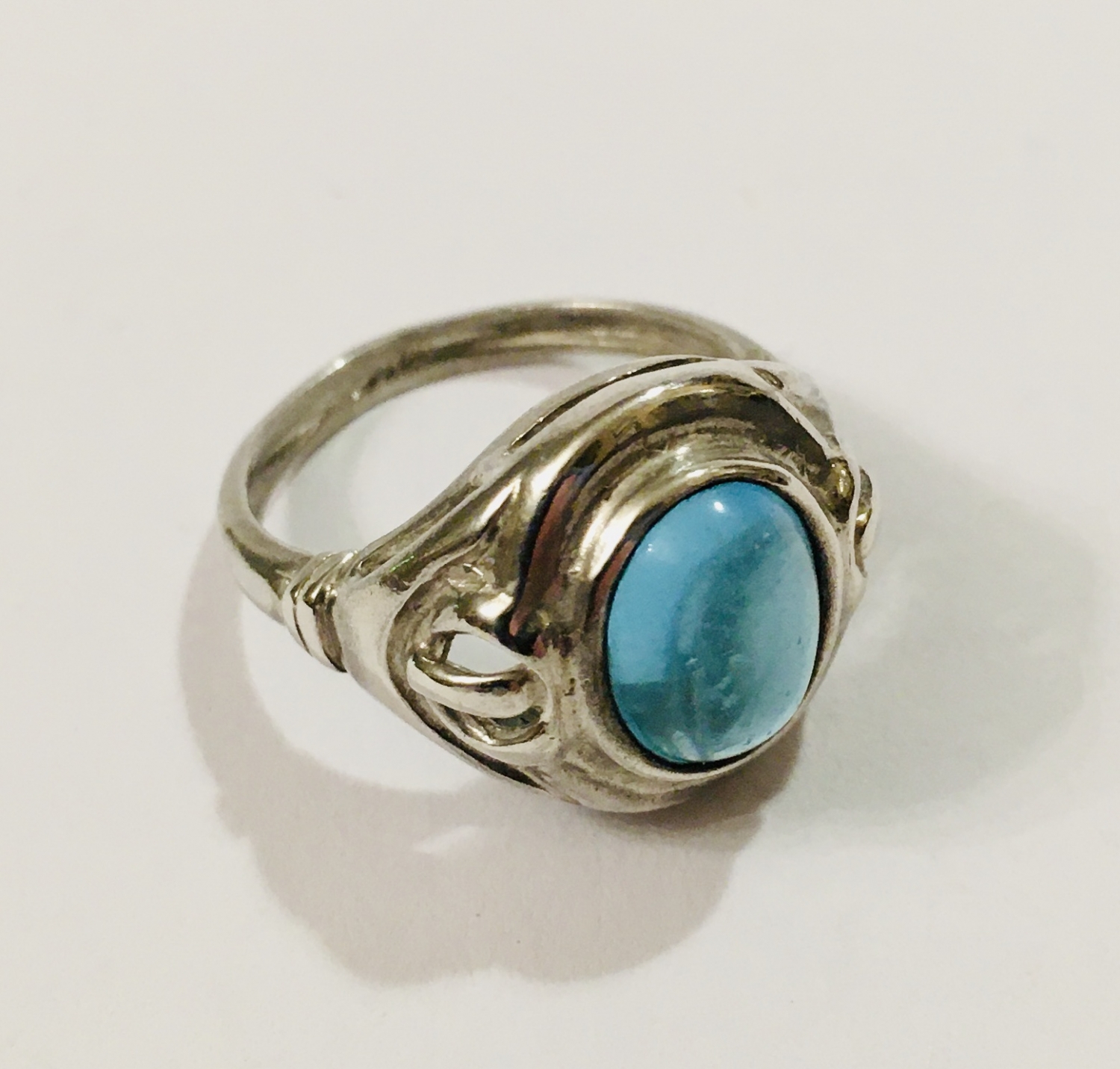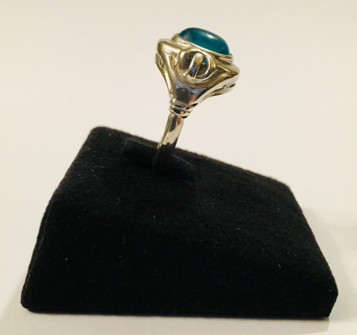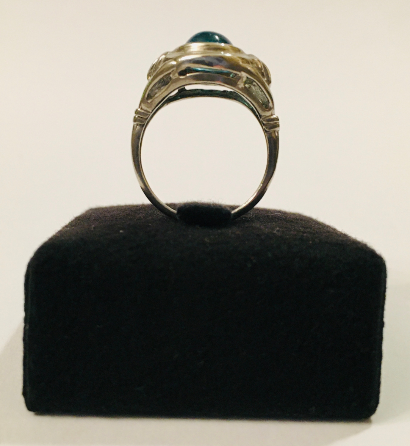 Osobitý stříbrný prsten s robusnější hlavicí osazenou přírodním topazem ve tvaru oválné mugle. Hlavice na několika místech odlehčena zdobnými otvory. Vkusný a nápadný šperk. Zhotoveno ze stříbra o ryzosti 925/1000; nově opatřeno puncem S-61 (kozlík 2) z vnitřní strany. Hmotnost je 3,88 g. Velikost prstenu je 56. Délka hlavice je 14 mm. Ve velmi dobrém stavu.