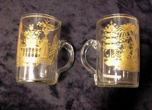 Unikátní pár skleněných půllitrů s rytým zlaceným nápisem ”Zur Ehre Gottes” a inkrustovaným zdobením pamletami a rozvilinami. Nepoškozeno. Artefakt z 1. třetiny 19. století, gravírovaný, rok 1818-Čechy. Srovnatelné celý pár!