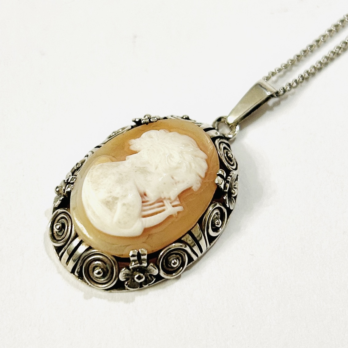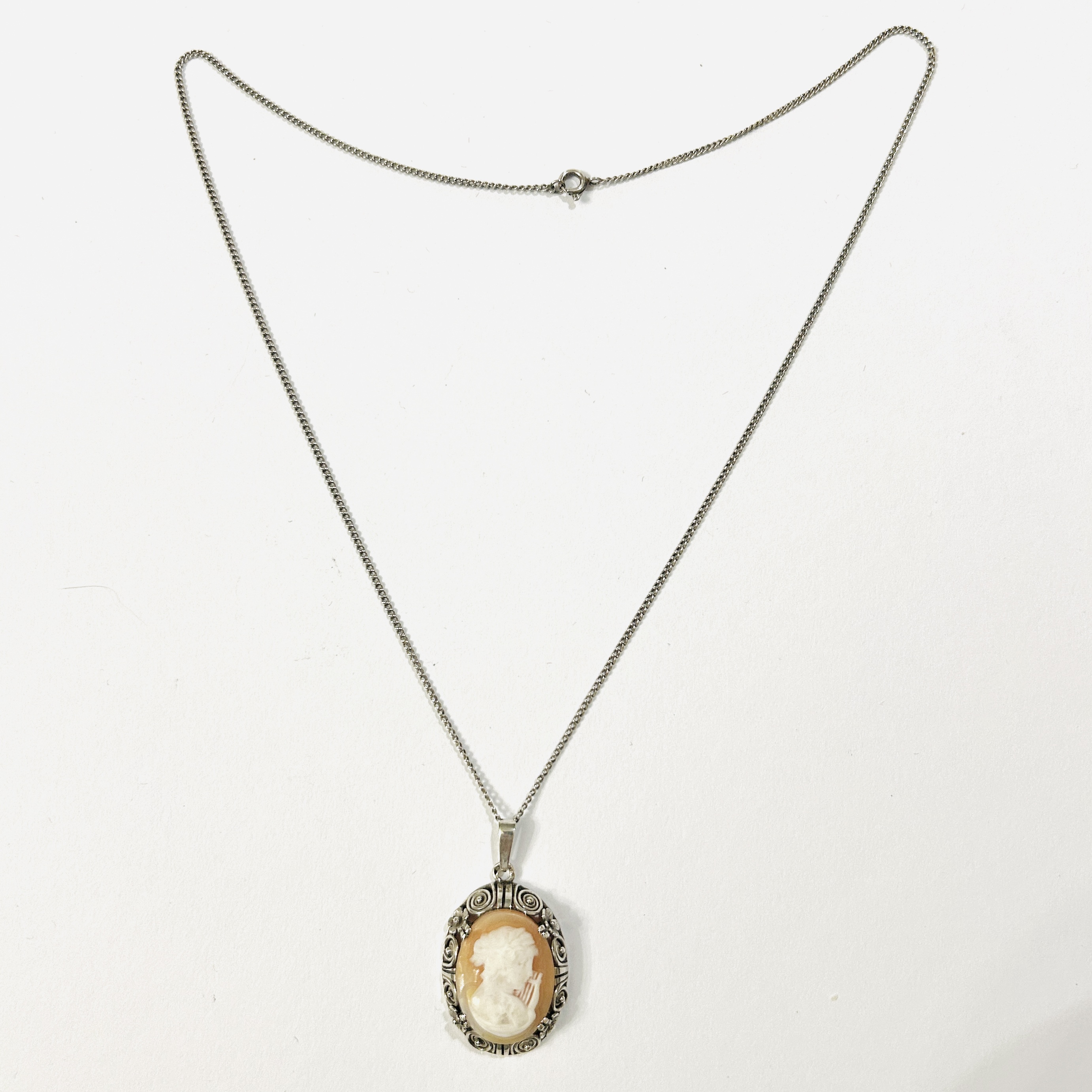 Elegantní přívěšek osazený zdařile rytou přírodní oranžovo-bílou mušlovinou, oválná kamej s podobiznou antikizující dívky s loutnou. Rámeček v novobarokním pojetí zdobený volutami a drobnými květy, připojen odnímatelný řetízek vazby \“pancr\“. Kvalitní tuzemská zlatnická práce z 30. let 20. století.