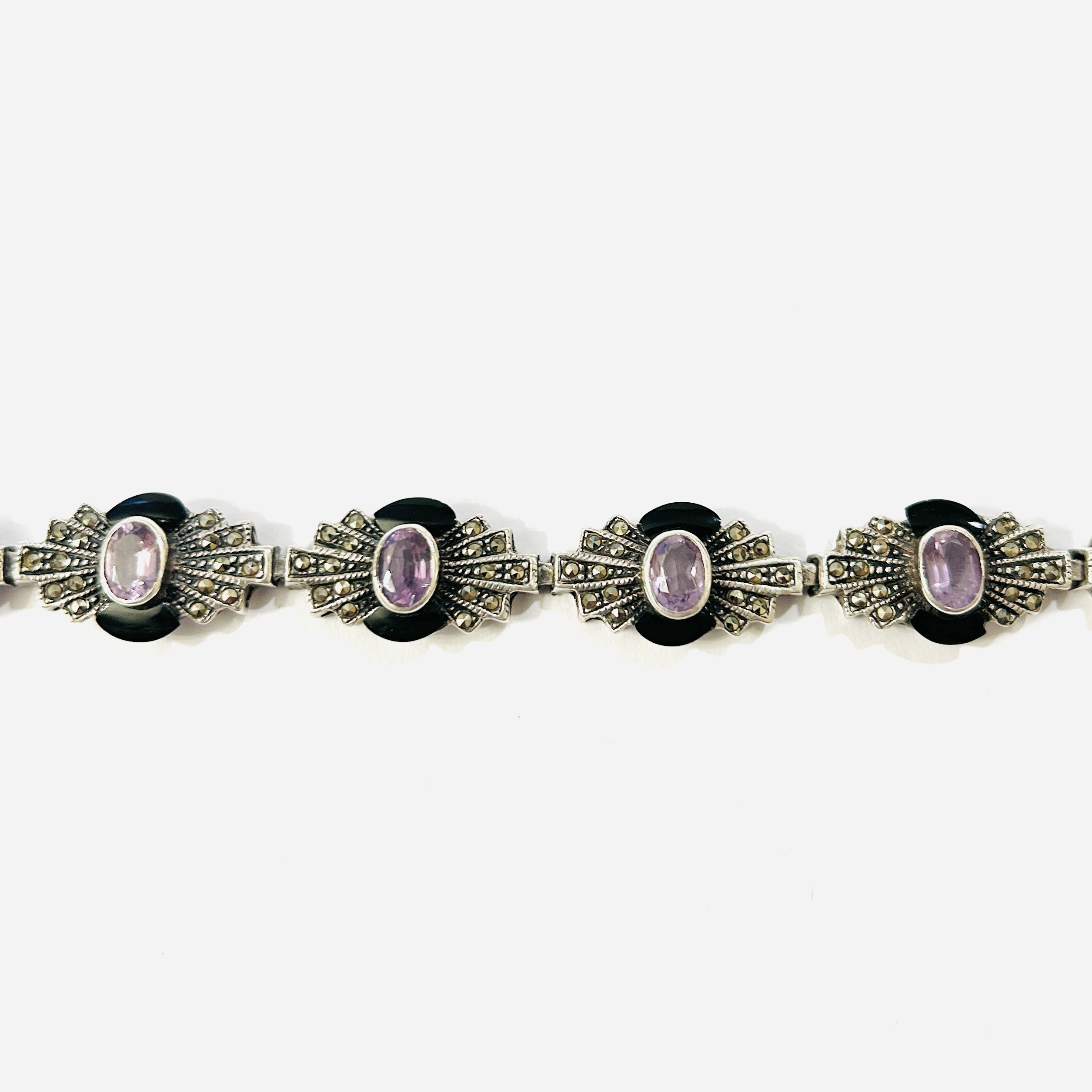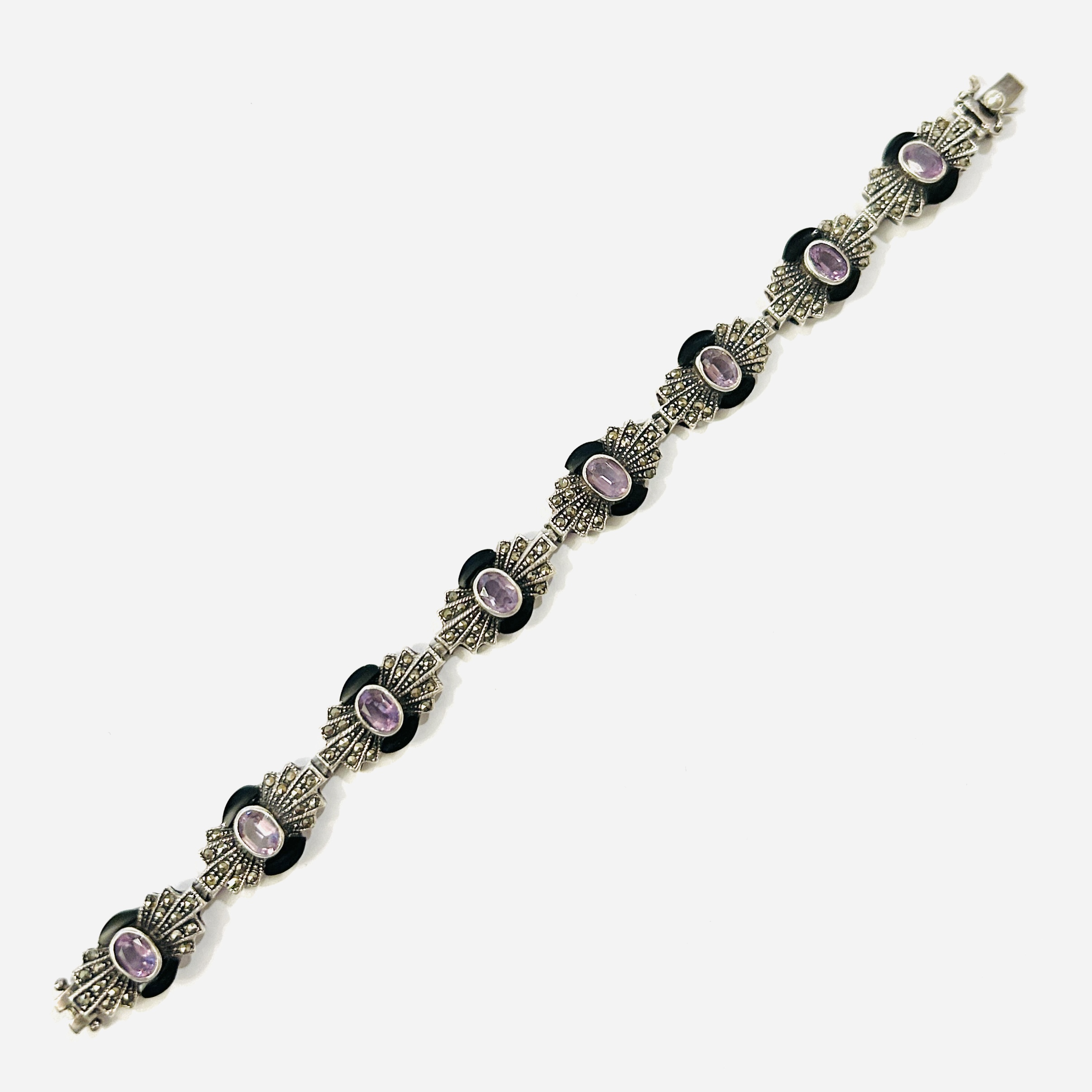 Elegantní, slavnostně působící náramek v pseudoart-deco stylu, články ve tvaru mašle osazeny ve středové hladké obrubě přírodními ametysty oválného brusu, dále přírodními černými onyxy atypického brusu a přírodními markazity kulatého hvězdicového brusu v zrnitých lůžkách. Kvalitní západoevropská práce z poslední pětiny 20. století.