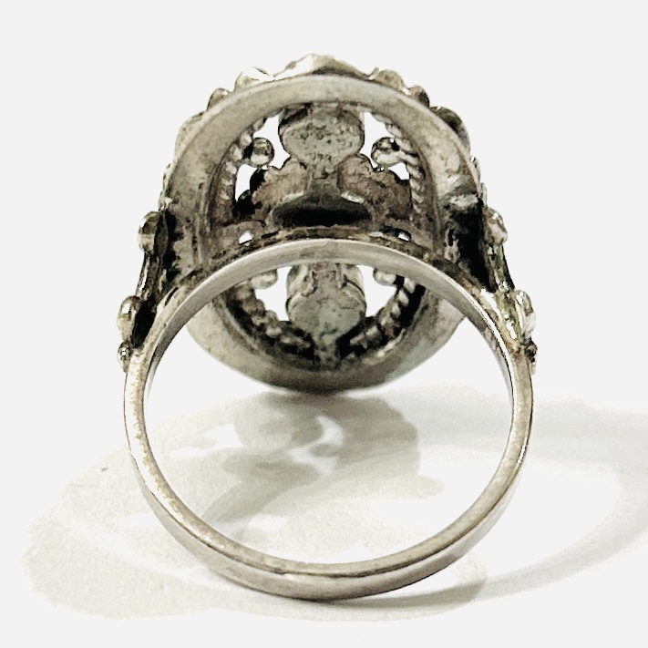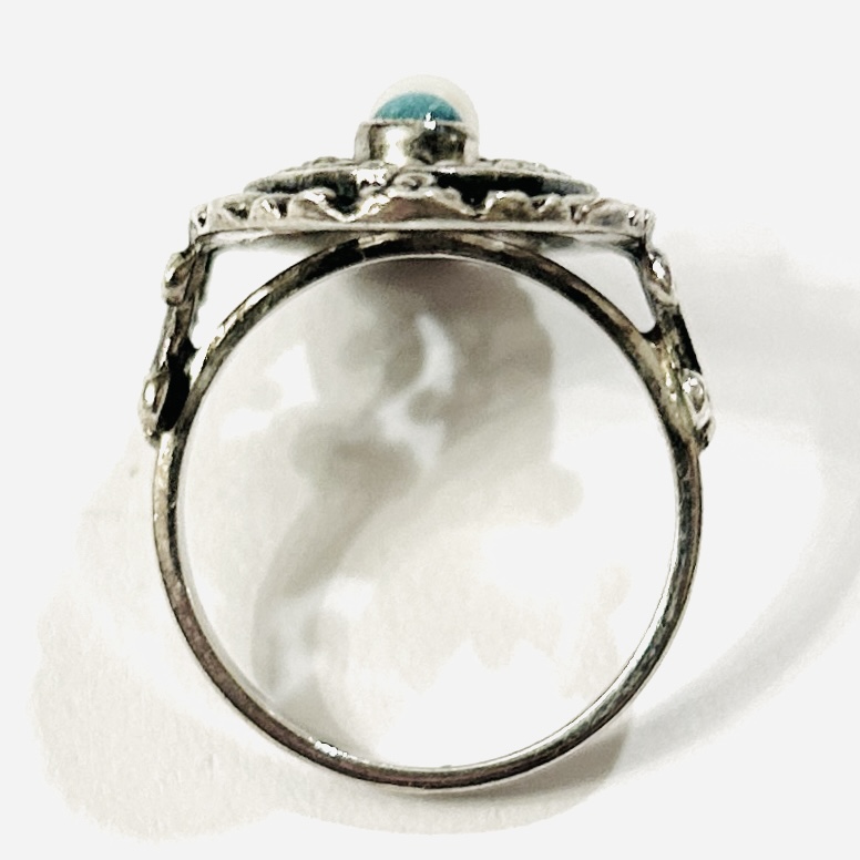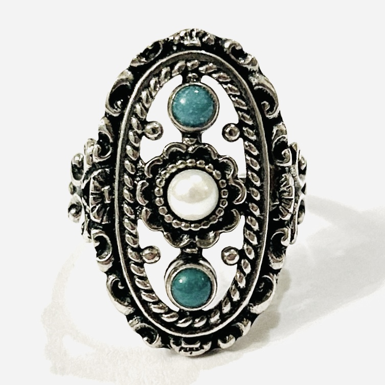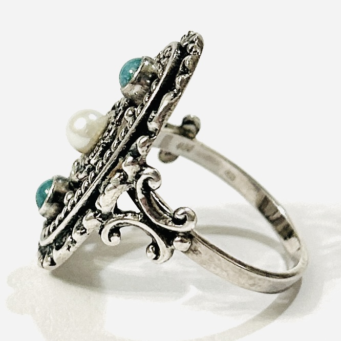 Honosný, historizující prsten, oválná prořezávaná hlavice osazena 2 muglemi přírodního nazelenalého tyrkysu, uprostřed přírodní kultivovaná bílá perla, bohatě plasticky dekorováno. Německá zlatnická práce z poslední čtvrtiny 20. století.
