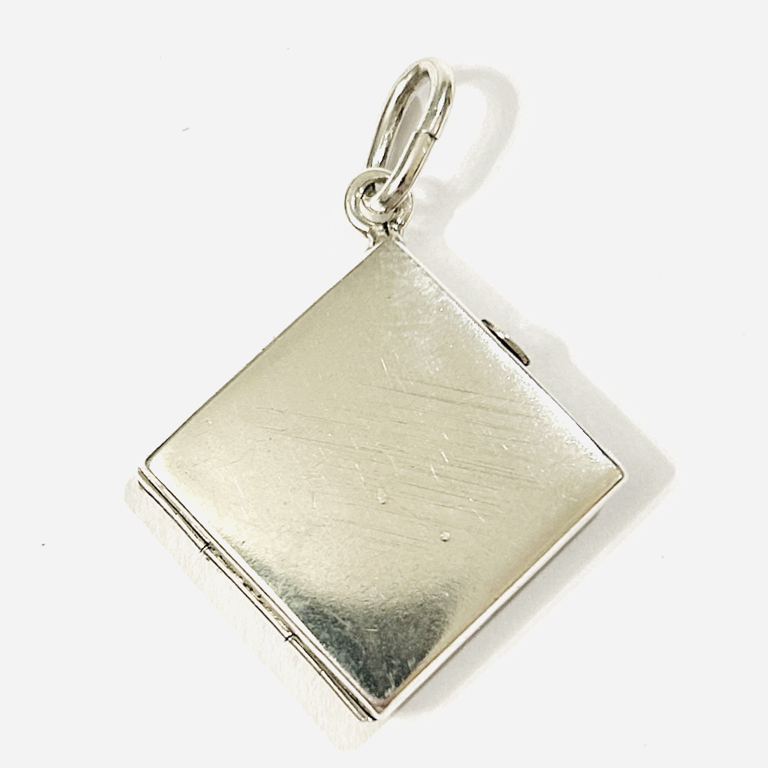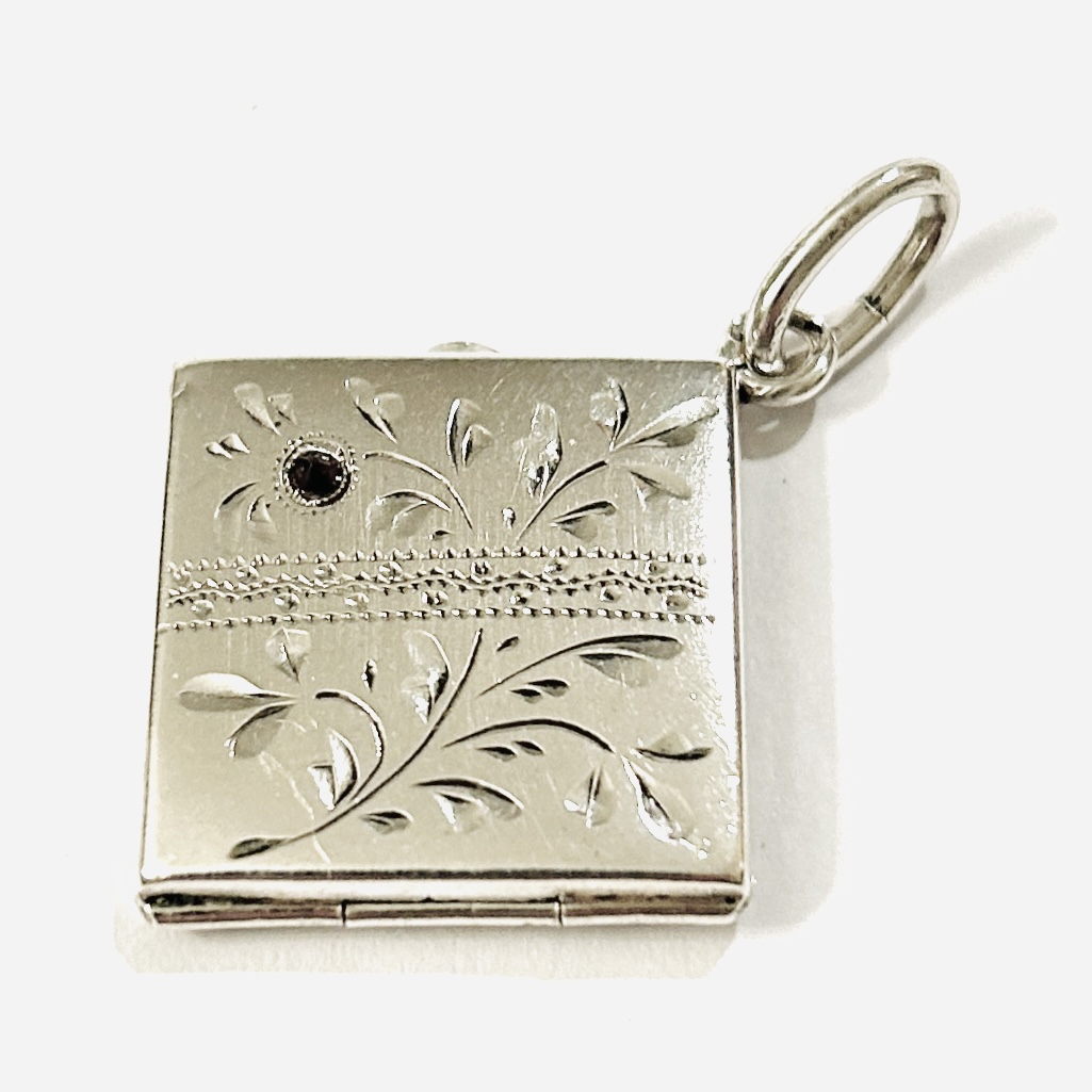 Větší, kosodélný přívěšek z období secese, který slouží též jako medailon na 2 fotografie. Frontální strana s jemným florálním gravírováním a doplněno českým granátem kulatého routového brusu, zadní strana ponechána hladká. Kvalitní vídeňská zlatnická práce z přelomu 19. a 20. století.