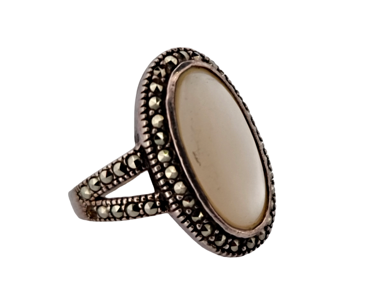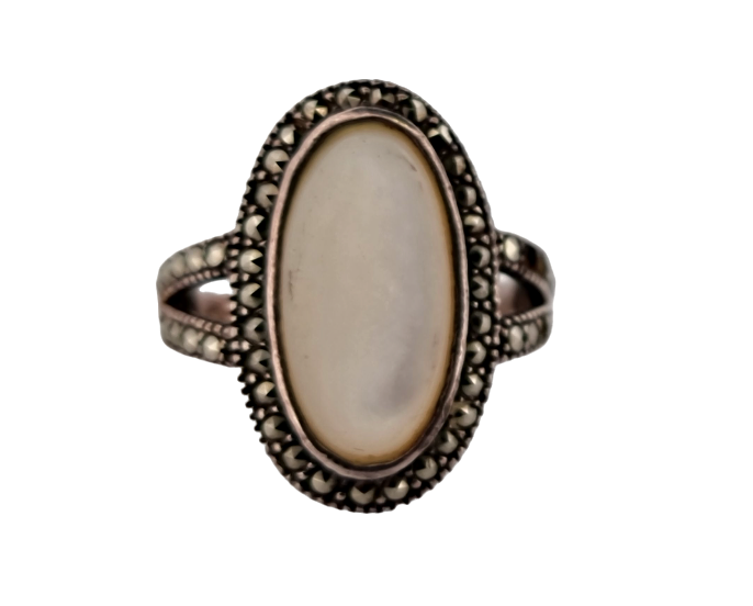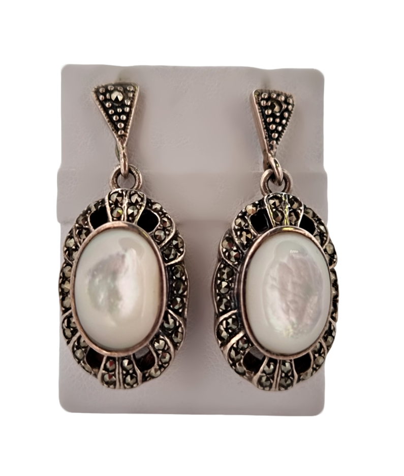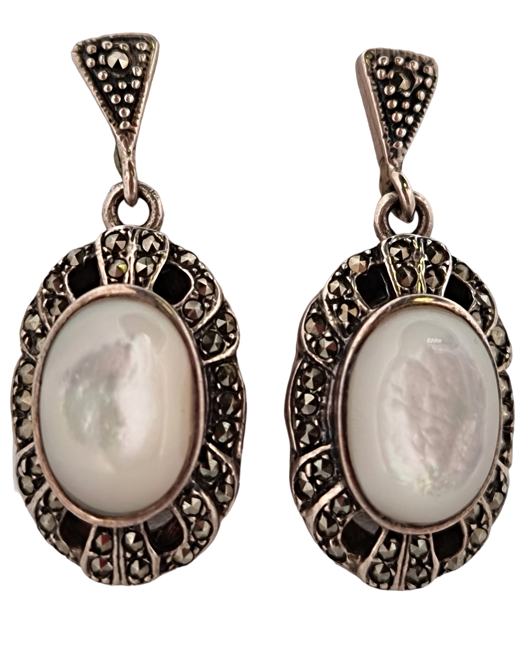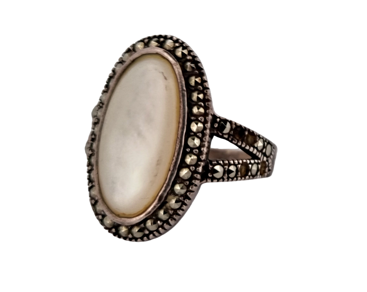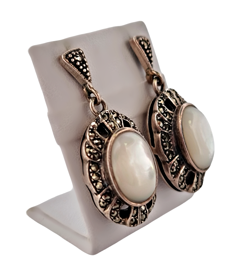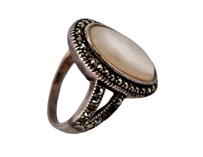 Popis: Stříbrný starožitný set náušnice a prsten, vykládaný markazity a zdobený perletí. Náušnice na puzetku. Prsten lehce zkřivená obroučka.
