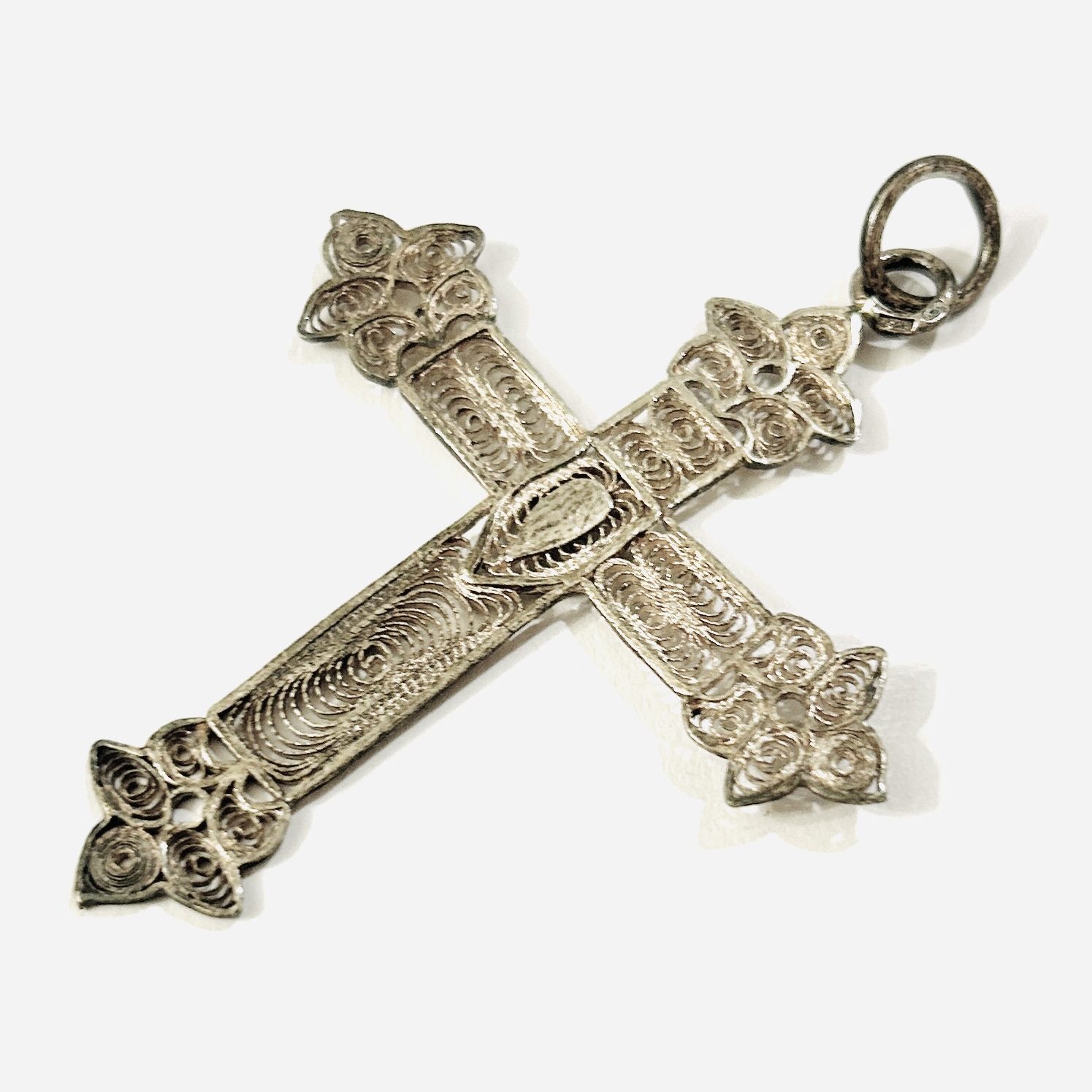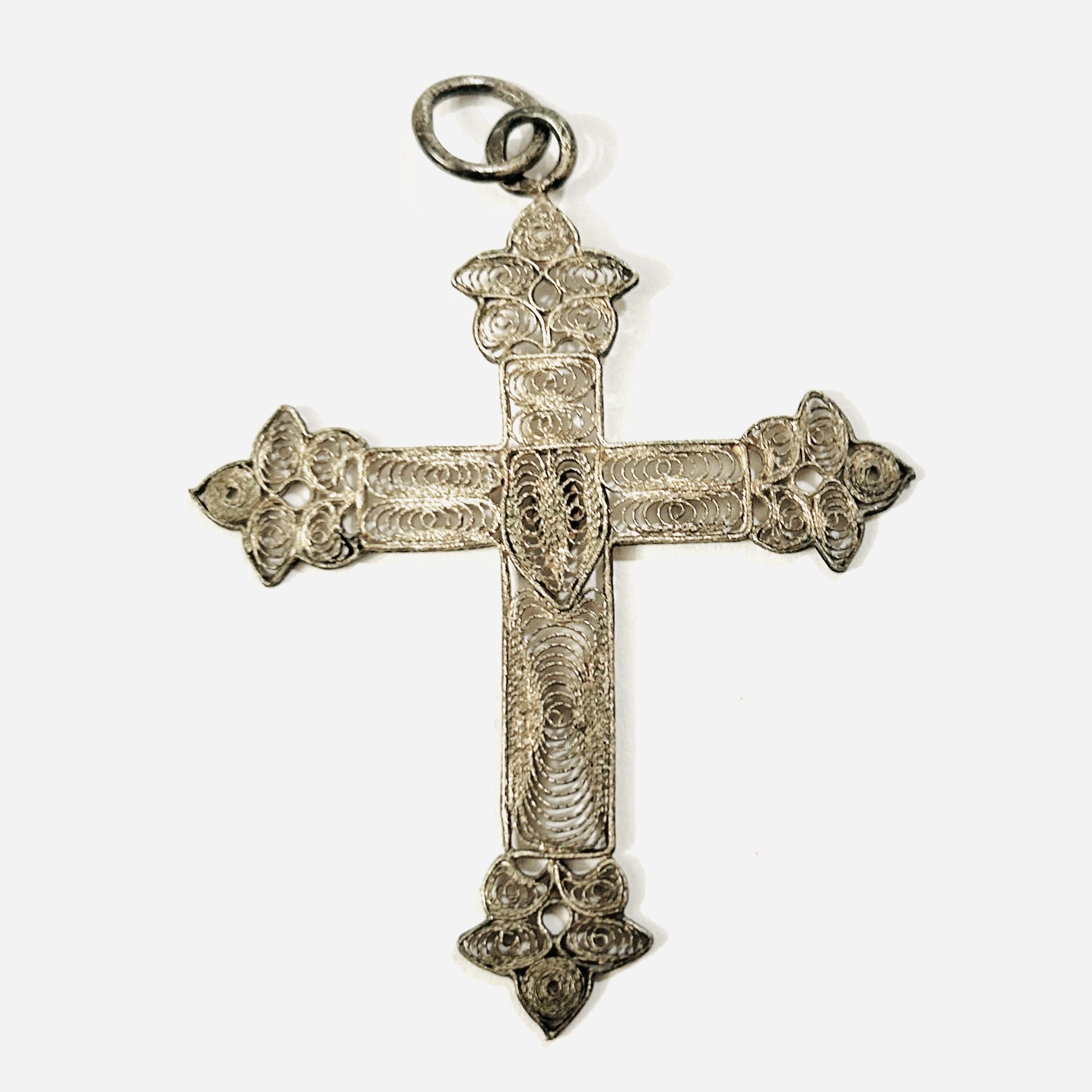 Výrazný, větší přívěšek ve tvaru latinského kříže se zdobnými závěry ramen, vyplněno filigránovými volutami. Patrně balkánská ruční práce z 20. až 30. let 20. století, dovezeno na naše území ve stejném období.