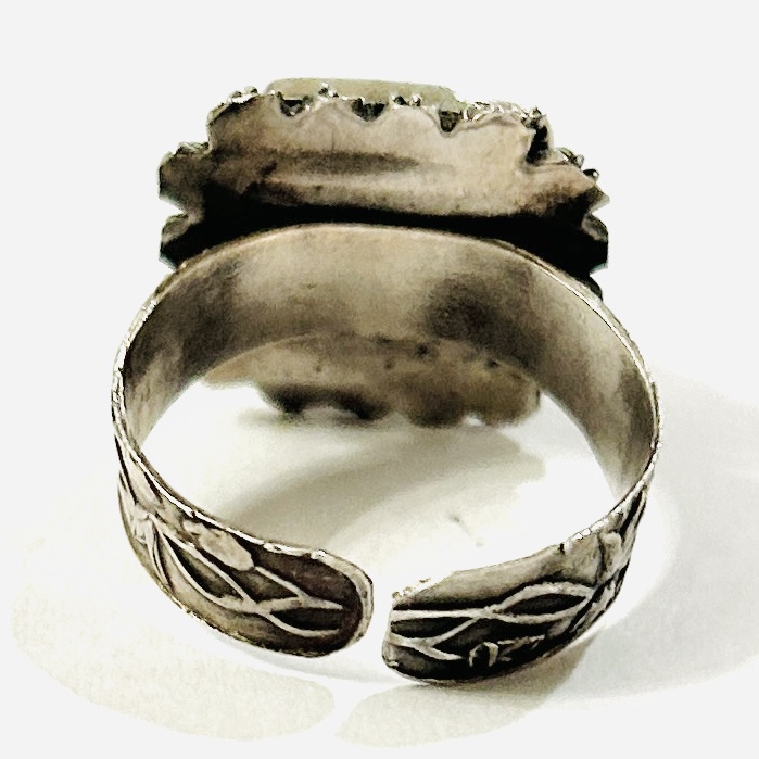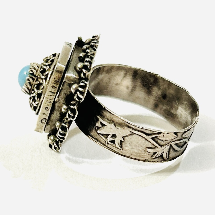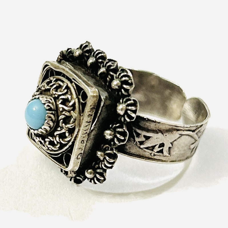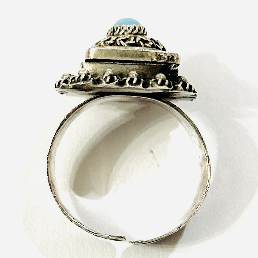 Výrazný, etnický \“jedový\“ prsten, čímž je míněná ukrytá otevírací schránka v hlavici. Ta je čtvercově pojatá, v kupolovitém víčku zdobeném filigránem osazeno kulatou muglí tyrkysového skla, rámeček s kulatých květů s granulovanými kuličkami, šína s jemným secesně stylizovaným rostlinným reliéfem. Kvalitní ruční, patrně čínská zlatnická práce z 20. až 30. let 20. století dovezená na naše území ve stejném období.