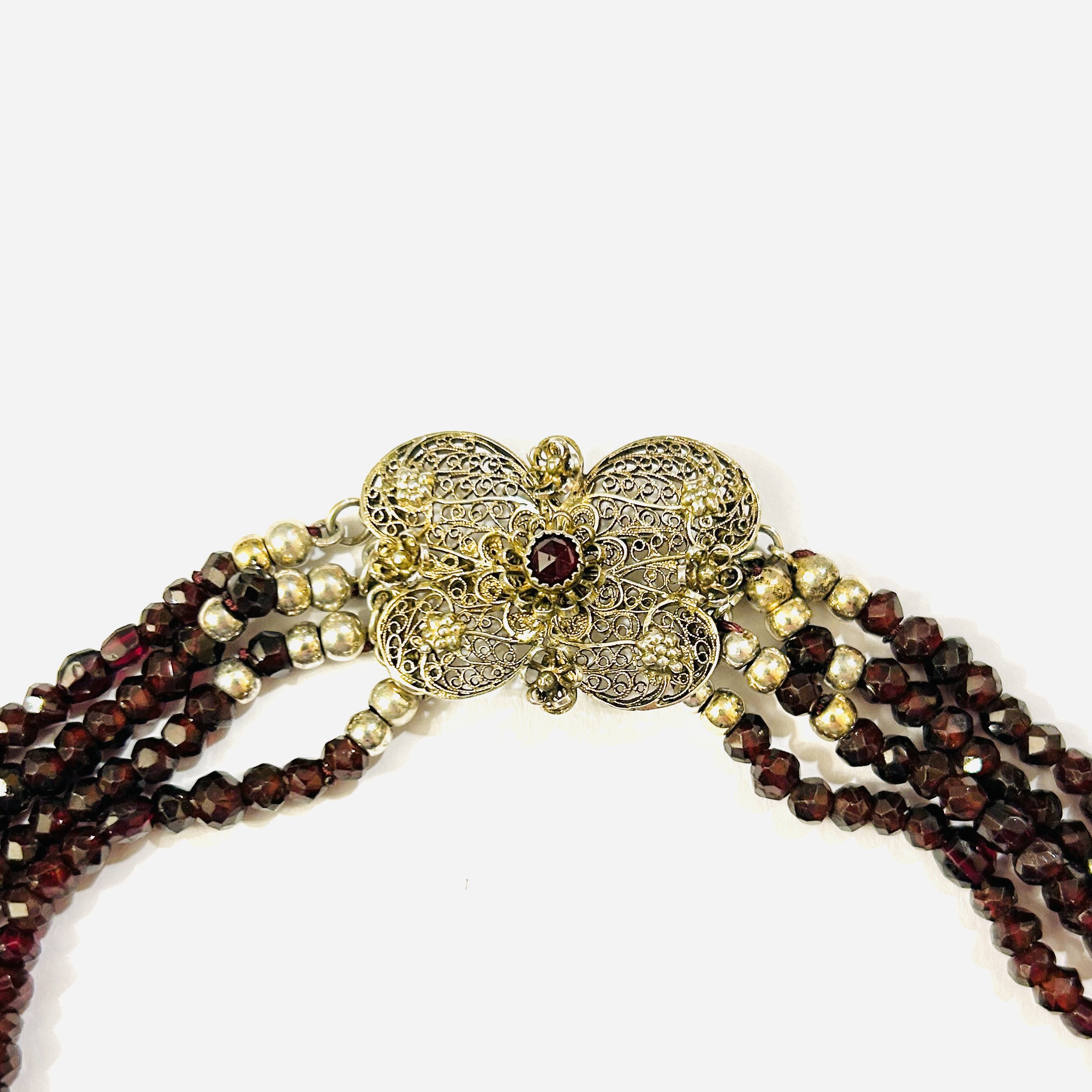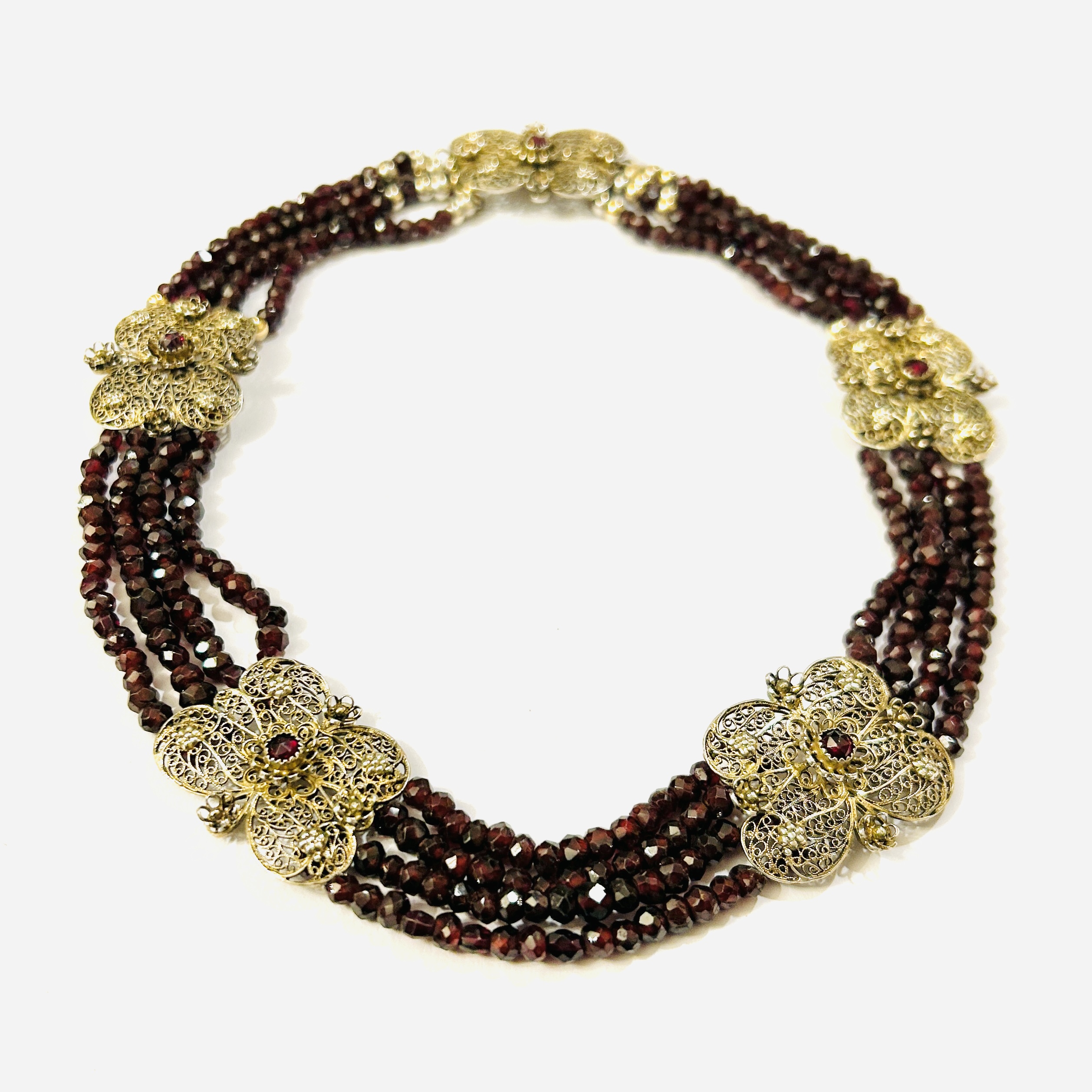 Honosný náhrdelník folklórního charakteru skládající se ze 4 řad kombinace vrtaných nepravidelně broušených různých druhů přírodních granátů včetně českých, dekorativní články vyplněny filigránovými volutami a motivy květů, ve středu osazeno českými granáty kulatého routového brusu. Kvalitní, patrně německá práce z 2. poloviny 19. století.