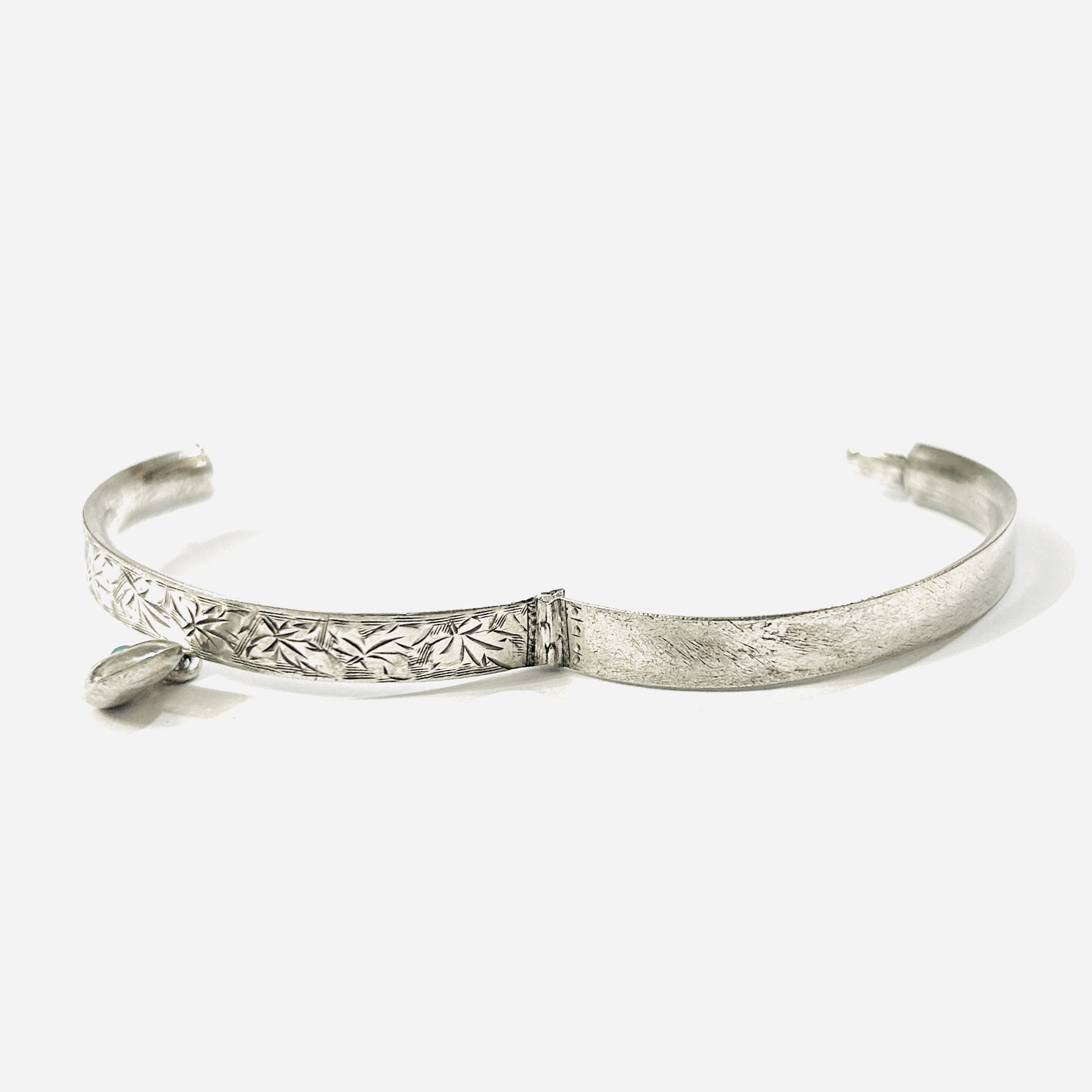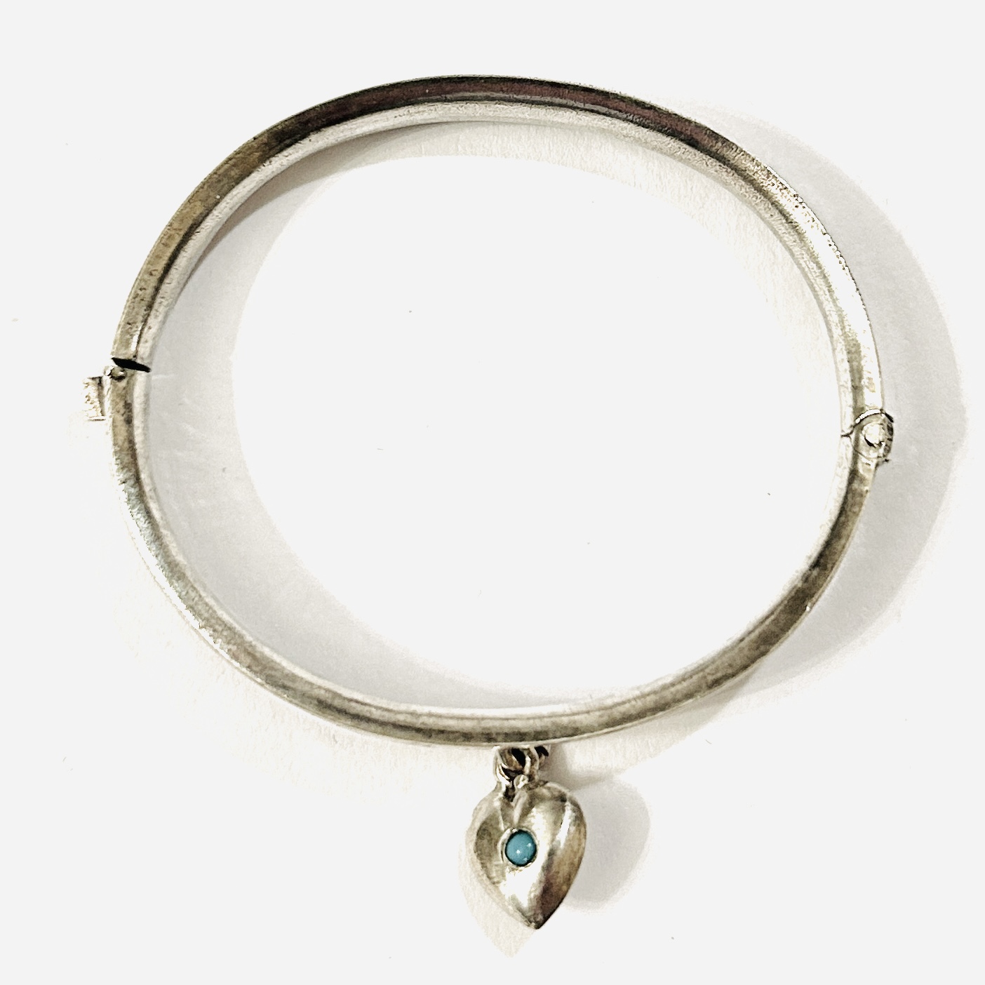 Elegantní otevírací náramek, jehož frontální část je zdobena gravírováním s motivem abstrahovaných listů, ověsek ve tvaru srdce osazen kulatou muglí patrně tyrkysového skla. Kvalitní zlatnická práce z území rakousko-uherské monarchie z poslední čtvrtiny 19. až počátku 20. století. Vyrobeno technikou dutého kovu.
