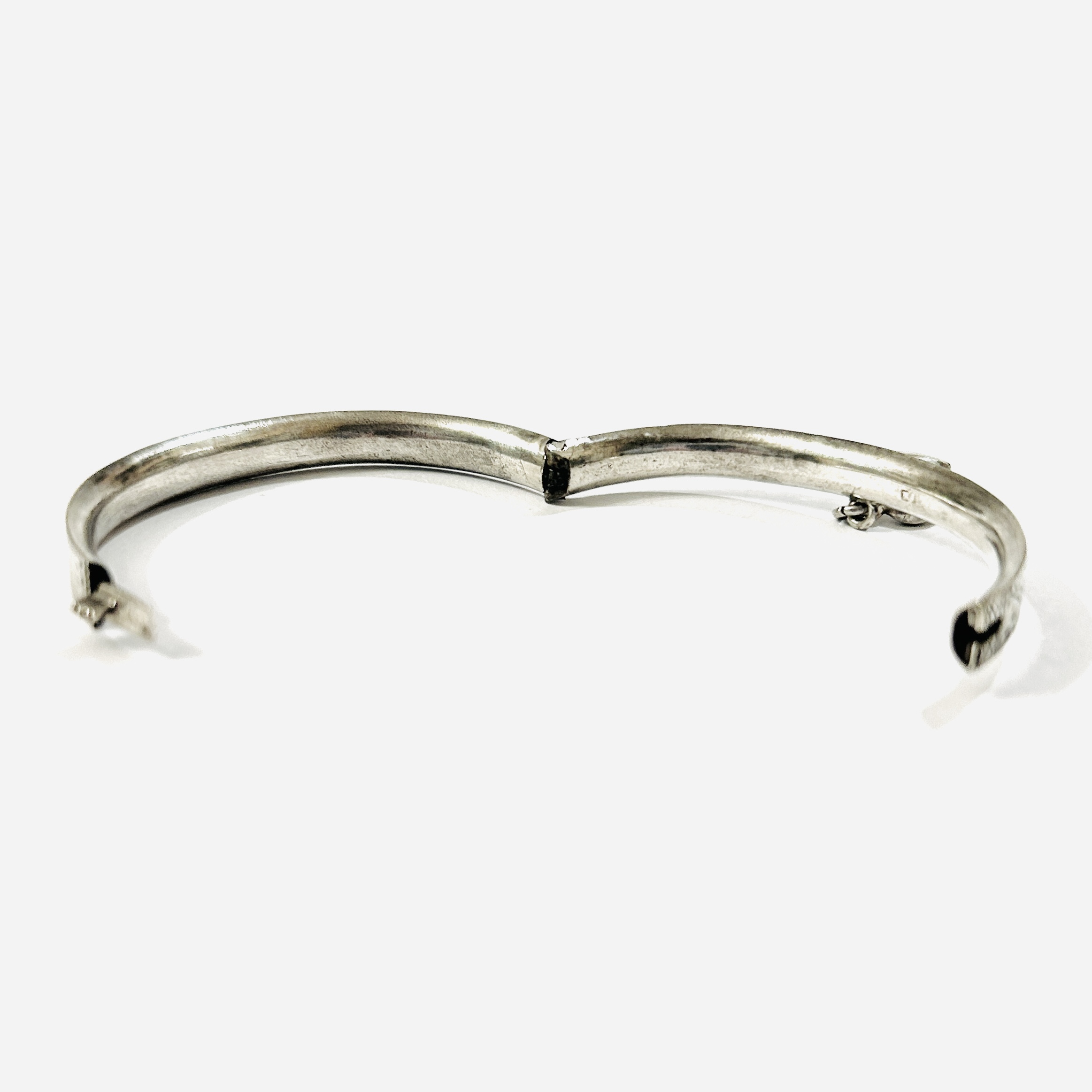 Zhotoveno z nezlaceného stříbra o ryzosti 750/1000; rakousko-uherský punc S-34 (lev 4) a zásobní značka Z-37 (moucha) na zapínacím jazýčku, mistrovská značka též a zevnitř náramku. Hmotnost 6,52 g, vnější délka 54 mm, vnitřní 48 mm (velikostí tedy na subtilnější zápěstí), vnější šířka 46 mm, vnitřní 41 mm, výška 6 mm. Jazýčkové zapínání v pořádku, později doplněný kámen, ponecháno s lehkou přirozenou patinou, lze vyčistit, odborně vyčištěno zlatníkem.