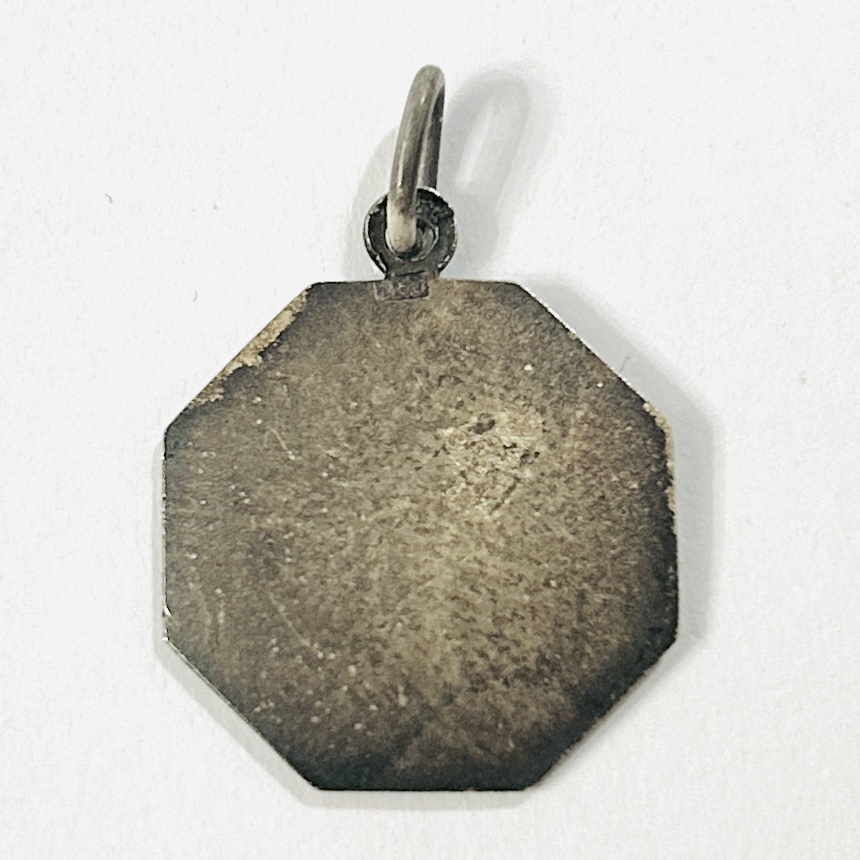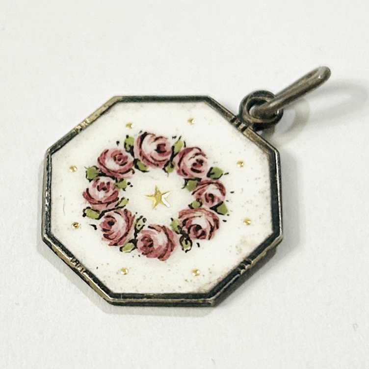Nevšední, půvabný přívěšek ve tvaru oktagonu, vyplněno bílým smaltem zdobeným ruční malbou věnce z růží, decentní zlacený motiv pětihroté hvězdy a teček. Precizní západoevropská, patrně německá zlatnická práce z počátku 20. století, dovezeno na naše území ve stejném období.