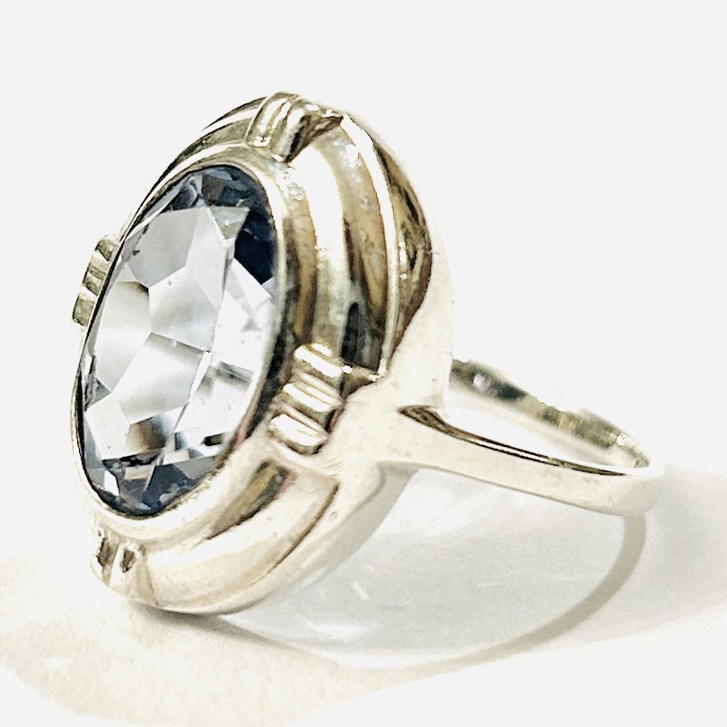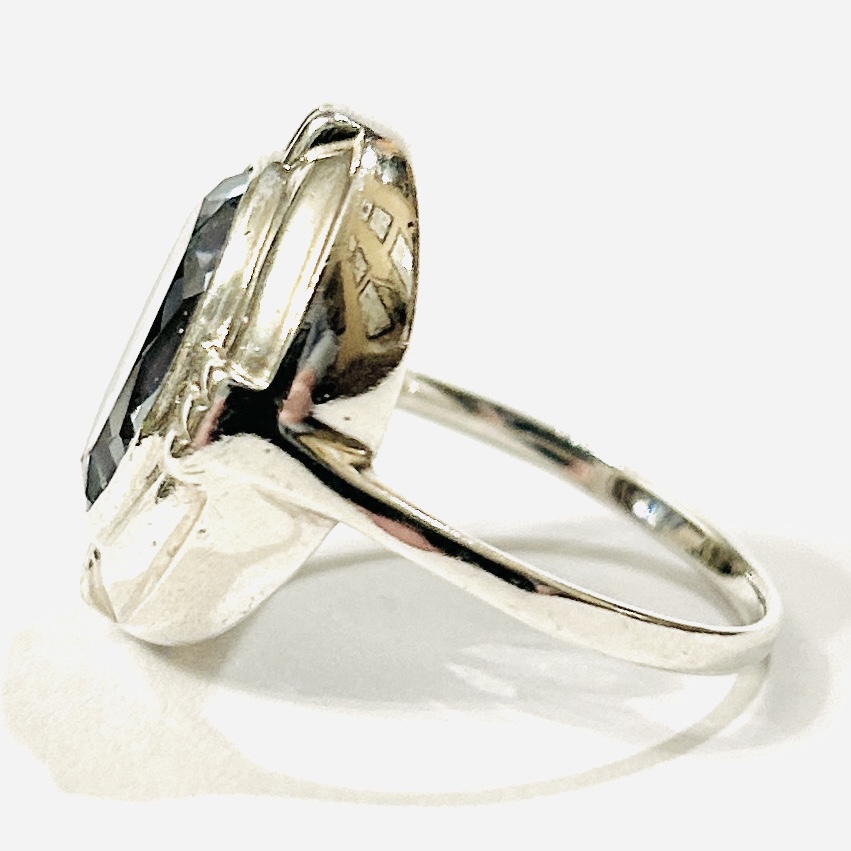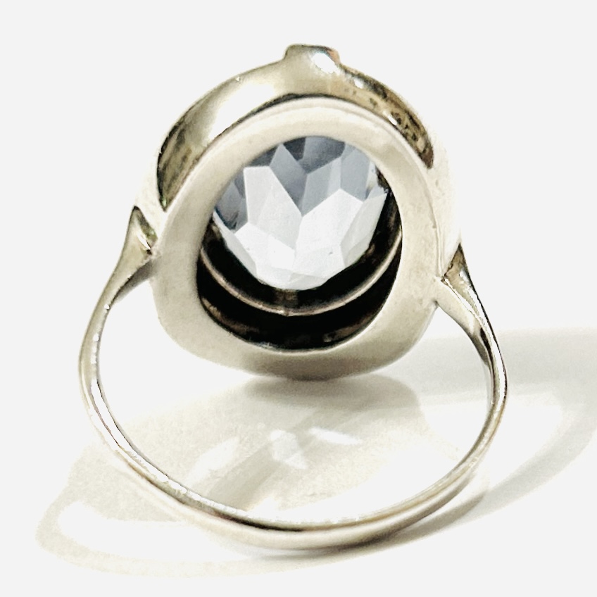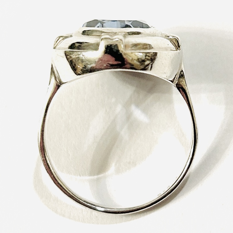 Elegantní, nadčasový prsten osazený topazově modrým kamenem oválného brusu, fasováno v plně přiléhající obrubě, minimalistická hlavice s plastickými pásky v osách. Německá zlatnická práce z 50. až 60. let 20. století.