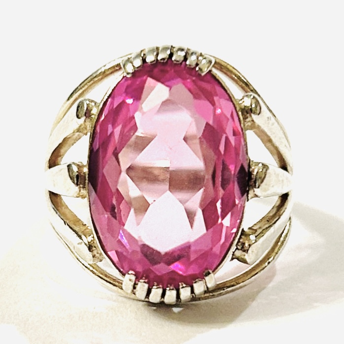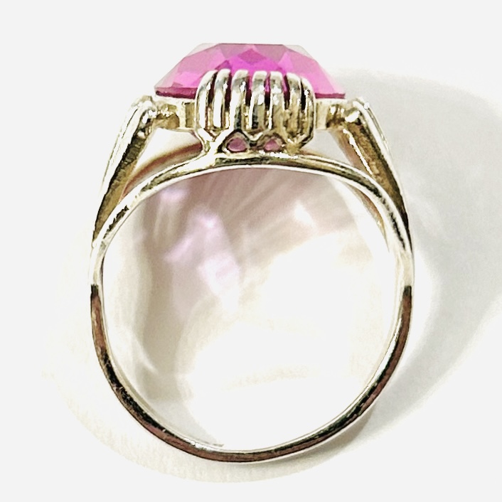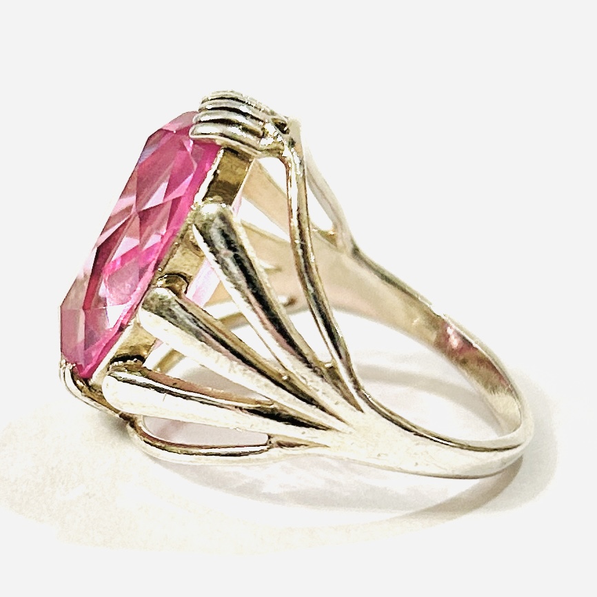 Elegantní prsten koktejlového typu osazený syntetickým růžovým kamenem oválného brusu, fasováno zhuštěnými krapnami, dynamicky prořezávaná šína. Kvalitní německá práce z 60. let 20. století.