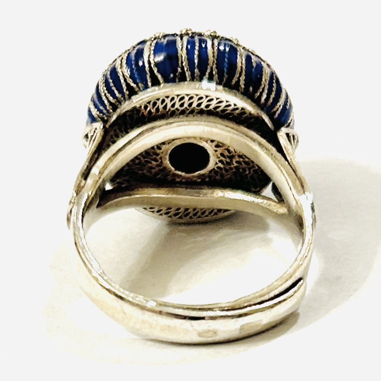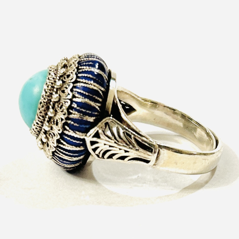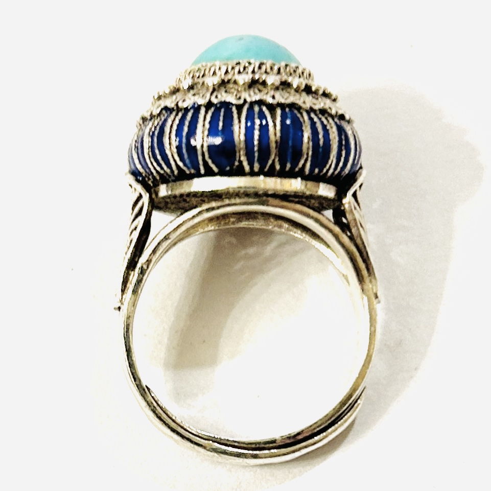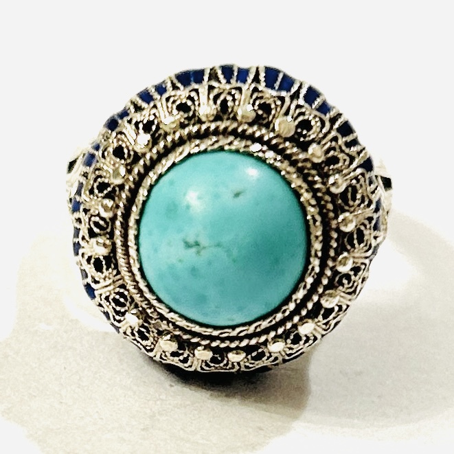 Výrazný, dekorativní prsten osazený větší kulatou muglí přírodního tyrkysu, kulatá objemnější hlavice z filigránu a zdobena tmavě modrým smaltem, ramena šíny vykládána vějířovitě kladenými stříbrnými liniemi. Orientální, patrně čínská ruční zlatnická práce z druhé třetiny 20. století dovezená na naše území ve stejném období.