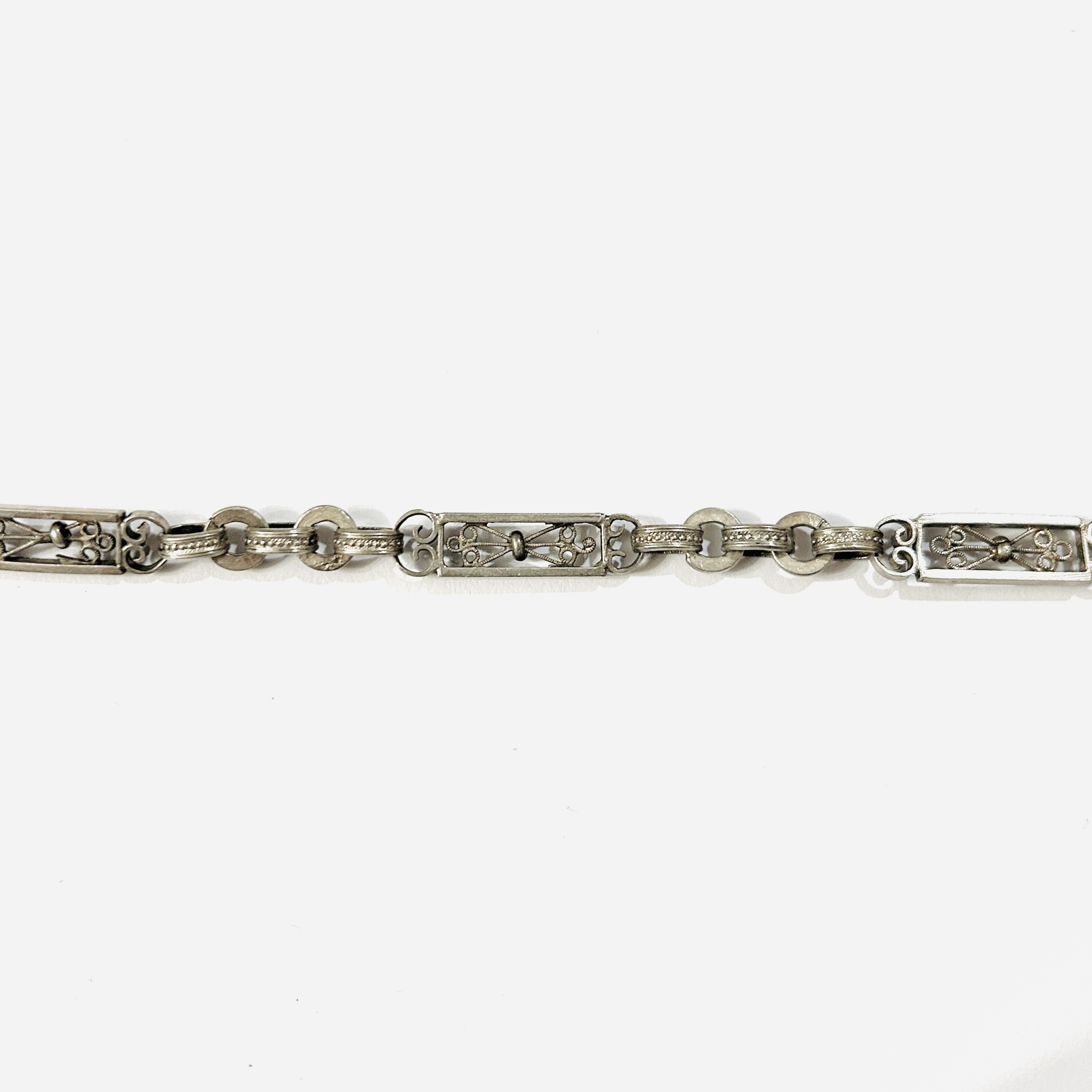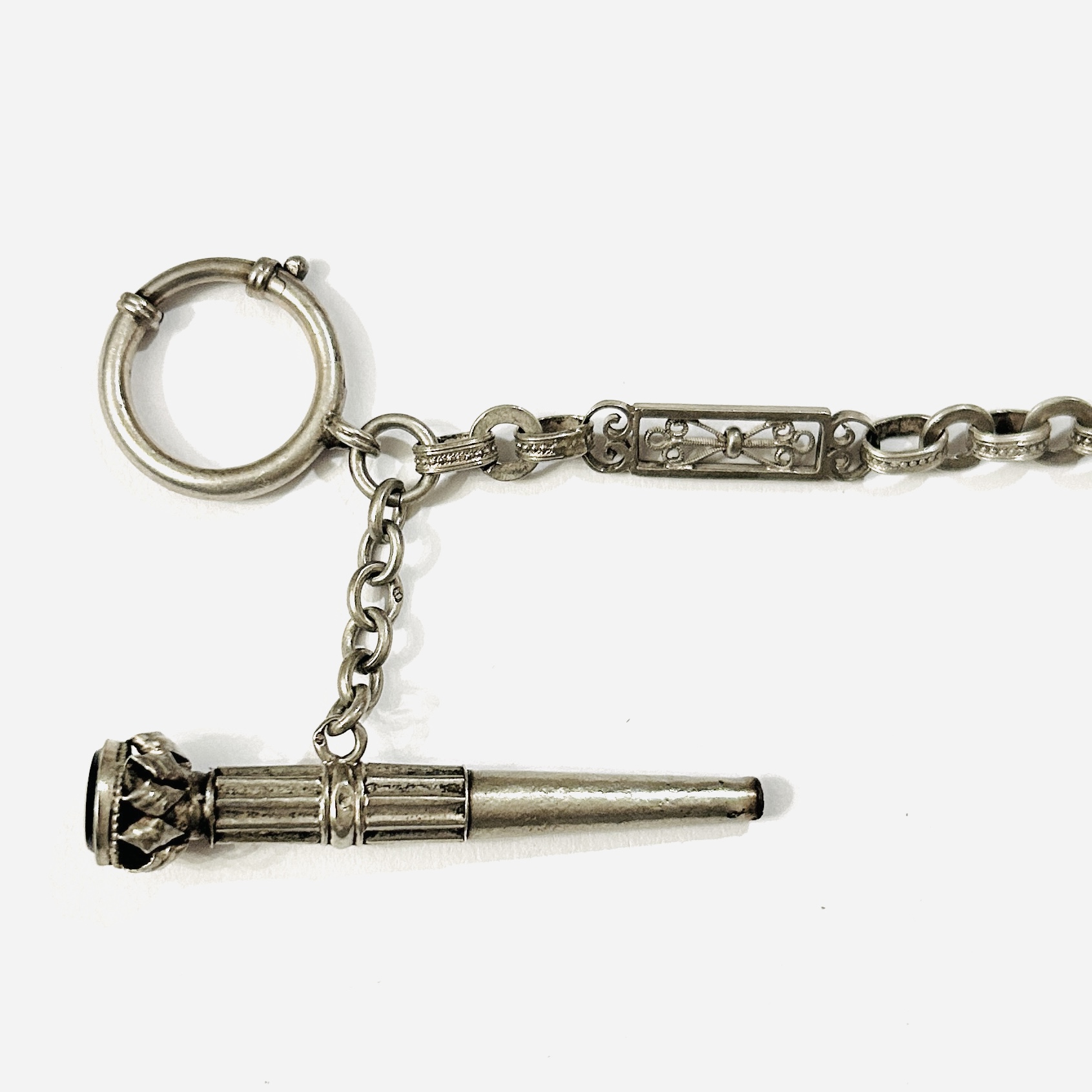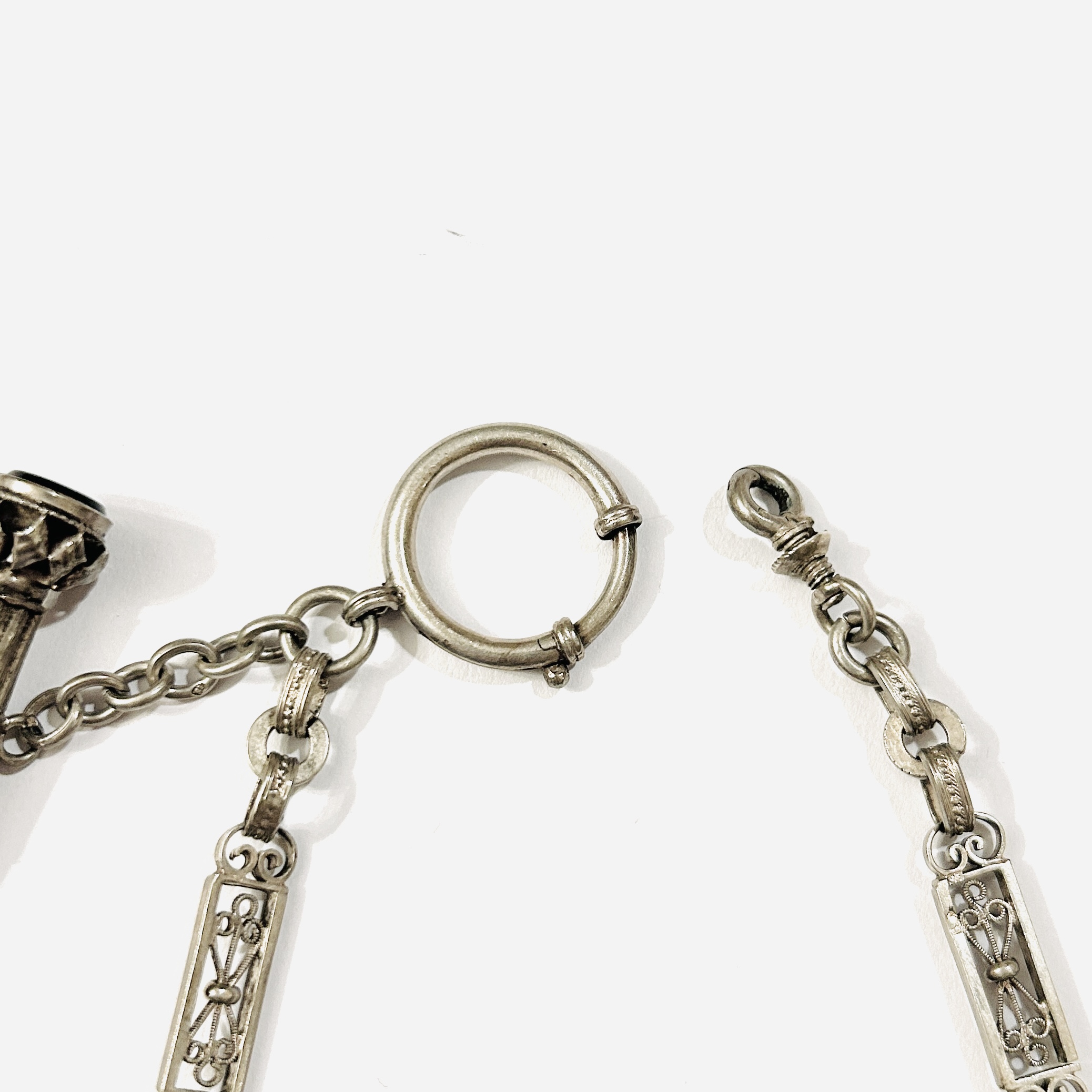 Zhotoveno z nezlaceného stříbra o ryzosti 750/1000; rakousko-uherský punc S-34 (lev 4), s atypickým spojením písmen „A“ i \“B\“ u puncu (zároveň značí vídeňský a linecký puncovní úřad) a mistrovská značka \“JF\“ na několika místech. Hmotnost 28,55 g, délka hlavní části 34,5 cm, šířka vazby 6,5 mm, délka klíče 55,5 mm, průměr hlavice 11 mm. Zapínání formou pérového kroužku a šroubovací karabinky v pořádku, klíč ve spodní části poškozený, celkově lehké stopy nošení, v jednom článku chybí část ozdoby (v celkové členitosti není téměř patrné), ponecháno s lehkou přirozenou patinou, celkově v zachovalém stavu.