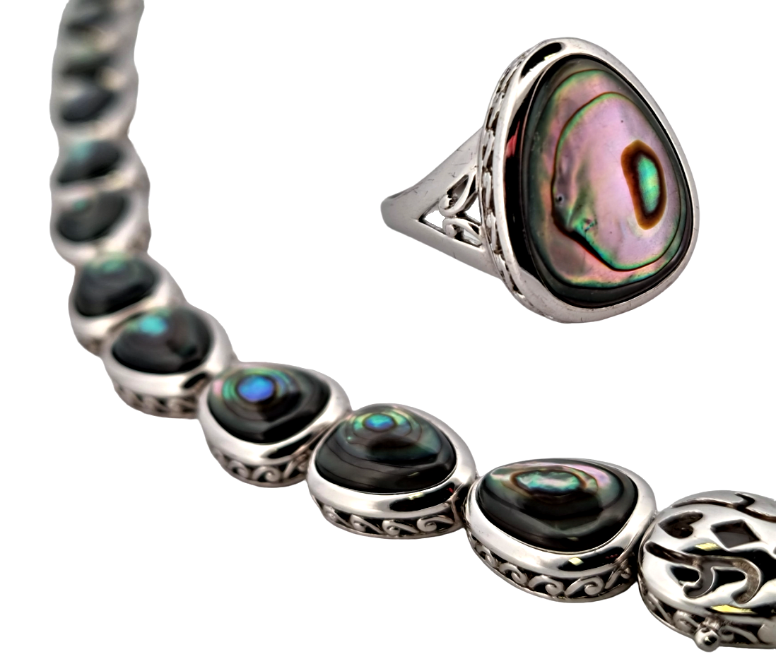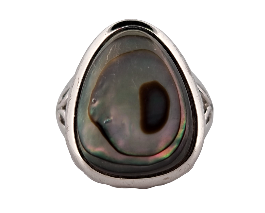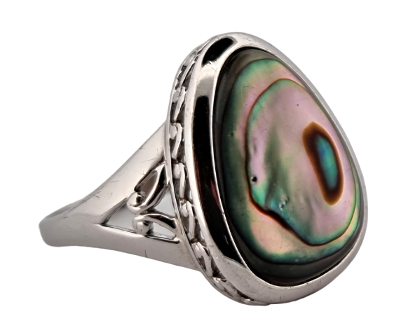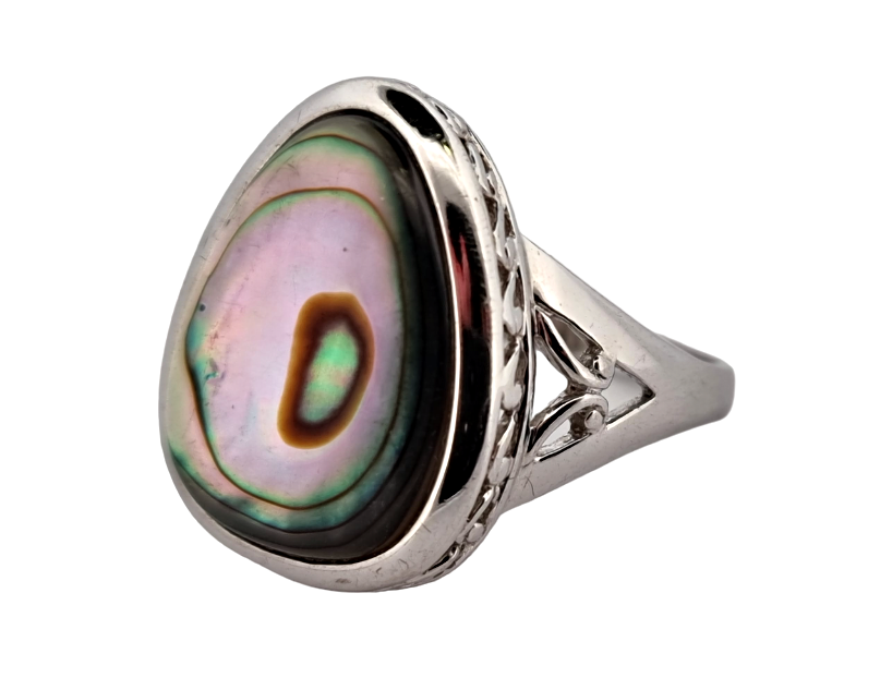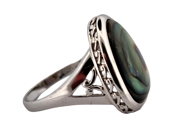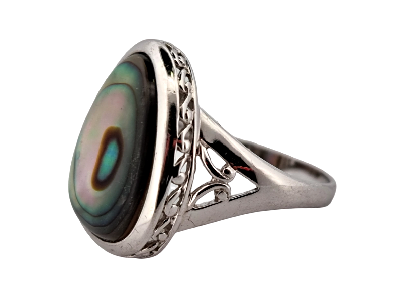 Popis: Stříbrný prsten s přírodní perletí abalone, zdobený. Unikátní hra barev přírodní perleti.