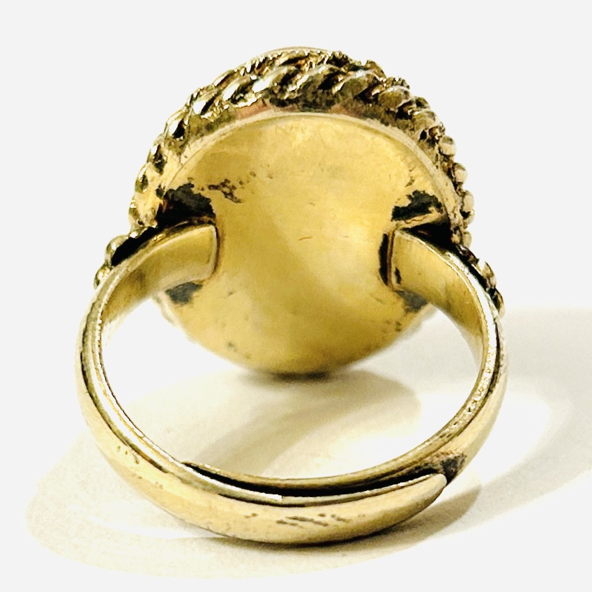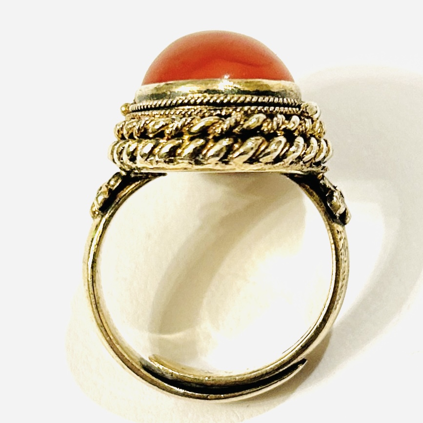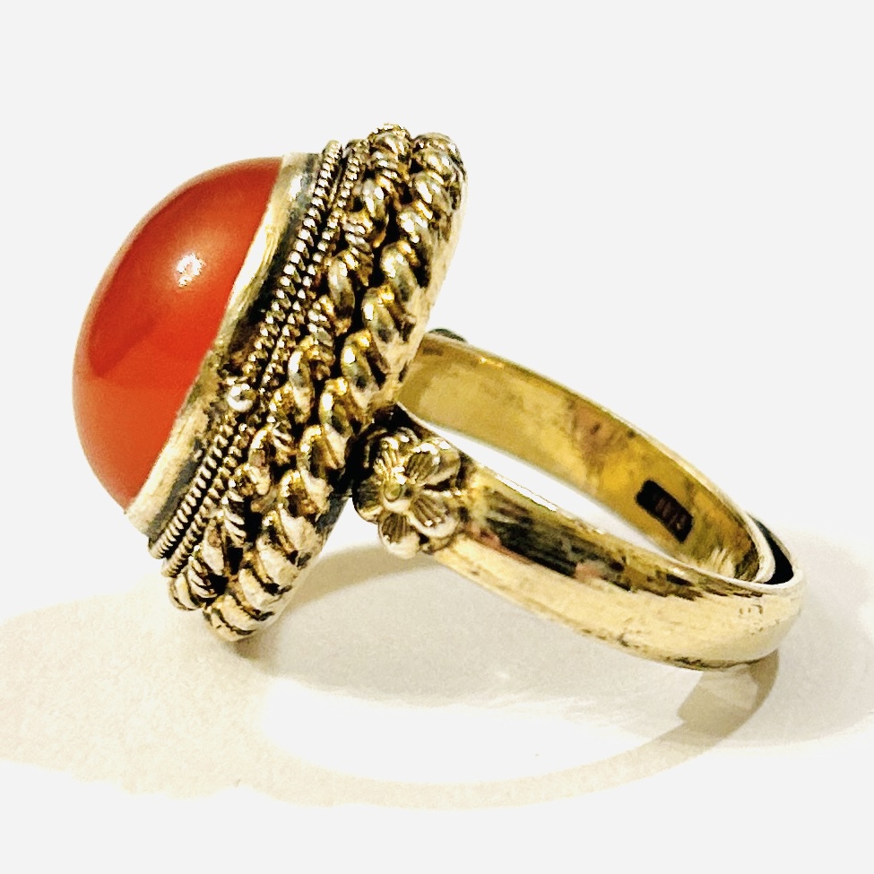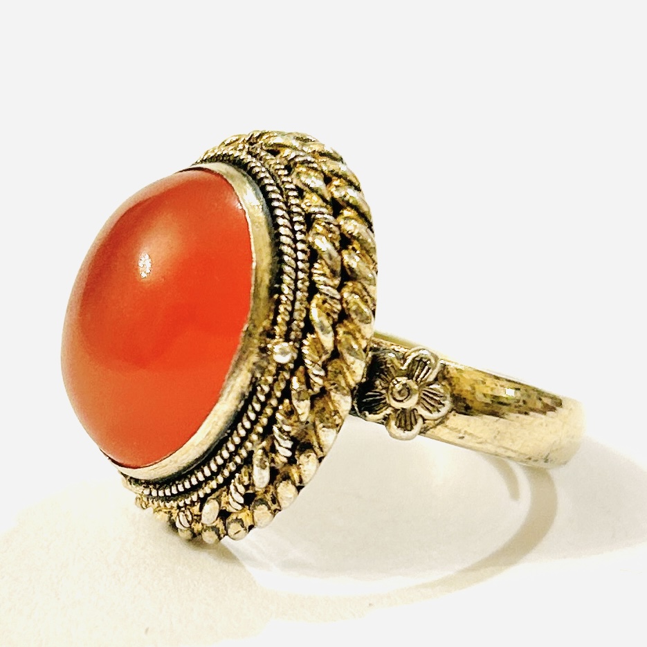 Výrazný, etnický \“jedový\“ prsten, čímž je míněná ukrytá otevírací schránka v hlavici, ta je uvnitř zdobena stylizovaným florálním dekorem. Osazeno oválnou muglí přírodního karneolu, fasováno v plně přiléhající obrubě, rámováno řadou pletenců, masivnější šína s květy u hlavice. Kvalitní, patrně východoasijská práce z 2. třetiny 20. století.