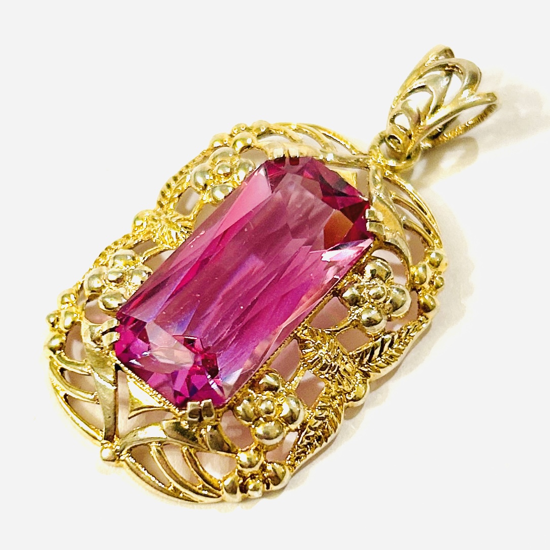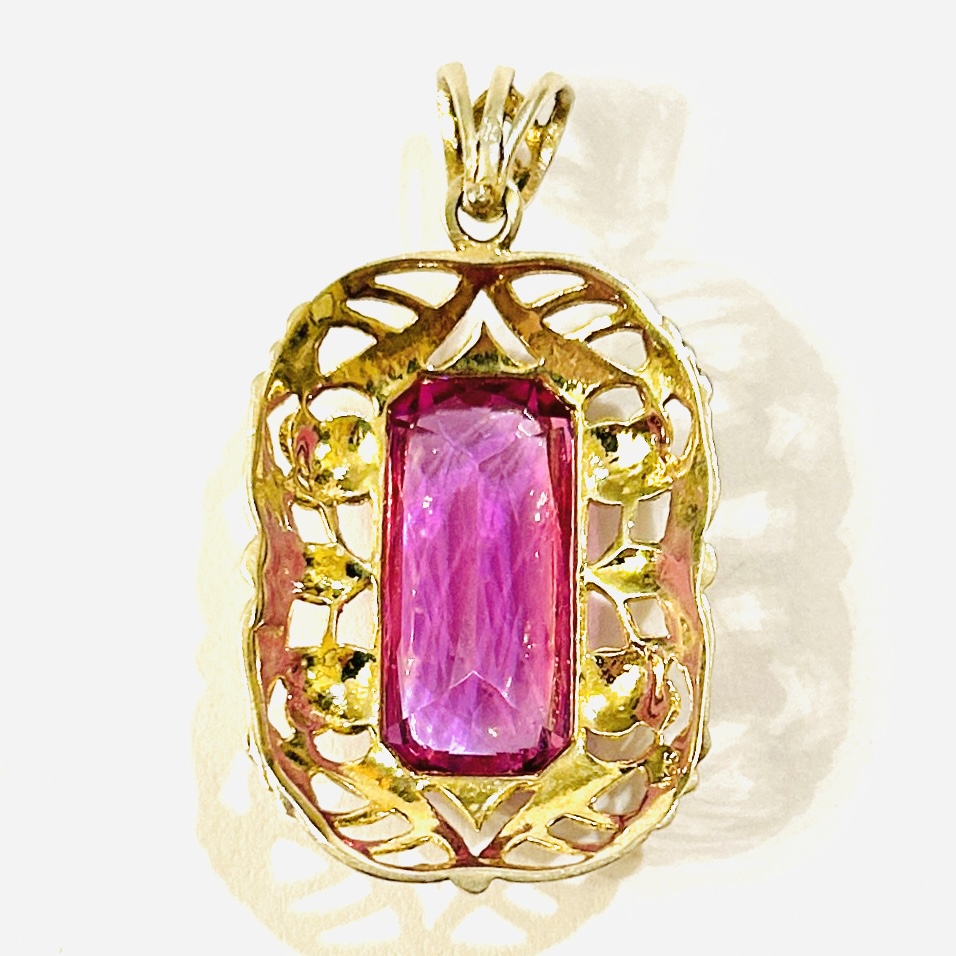 Větší, dekorativní přívěšek osazený zářivým syntetickým růžovým kamenem obdélného brusu, fasováno rohovými zdvojenými krapnami, bohatě prořezávané novobarokně pojaté tělo. Kvalitní rakouská zlatnická práce patrně z 50. let 20. století.