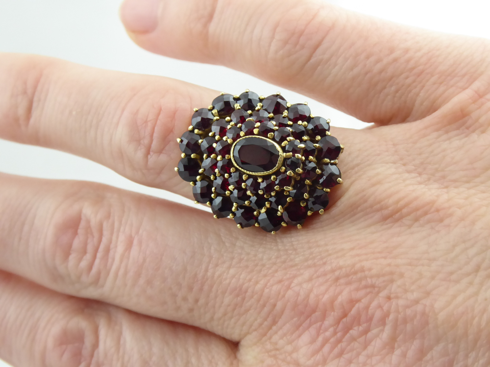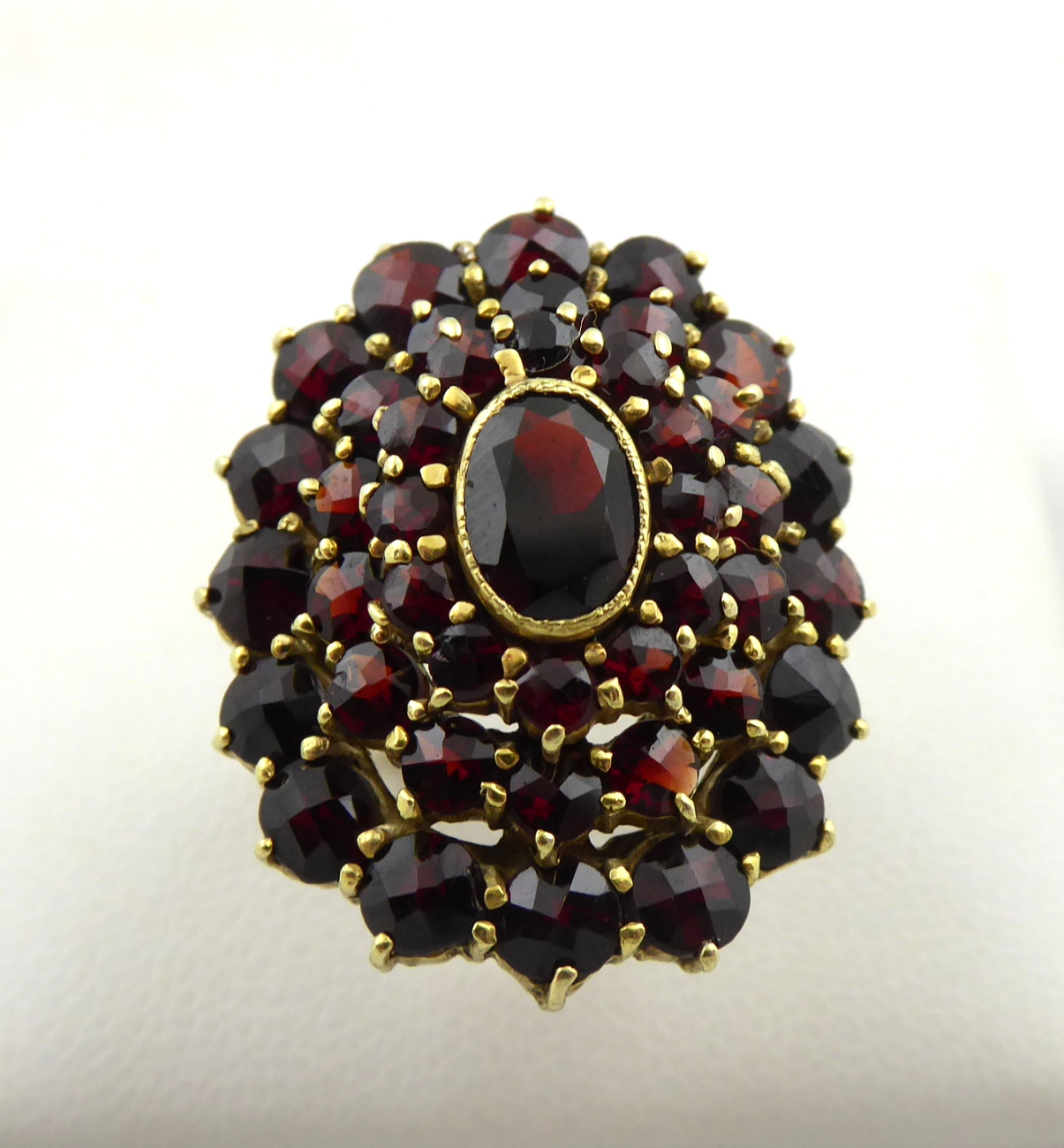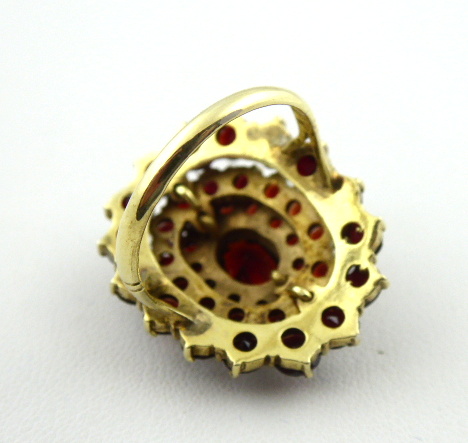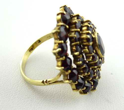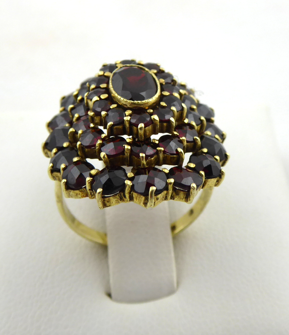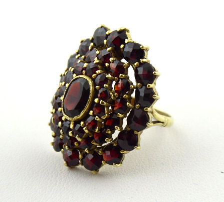 Stříbro. Ryzost Ag 900 / 1000, celková hmotnost 5,80 g. Přírodní broušené české granáty. Granátový prsten ze zlaceného stříbra. Oválná odstupňovaná klenutá hlava prstenu s třemi řadami vsazených přírodních broušených českých granátů různé velikosti. Centrální oválný větší přírodní broušený český granát. Značen: ryzost 900, nezřetelná mistrovská značka, nový platný český punc hlava kohouta. Československo, druhá polovina minulého století. Velikost prstenu 54.