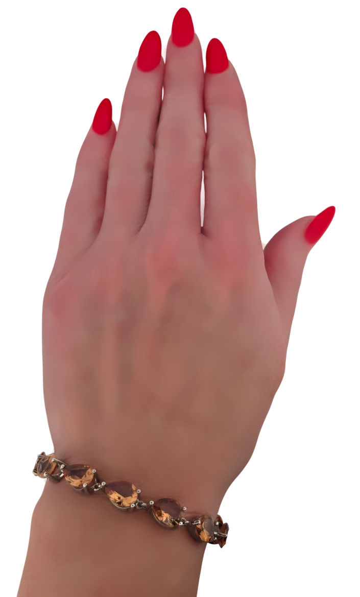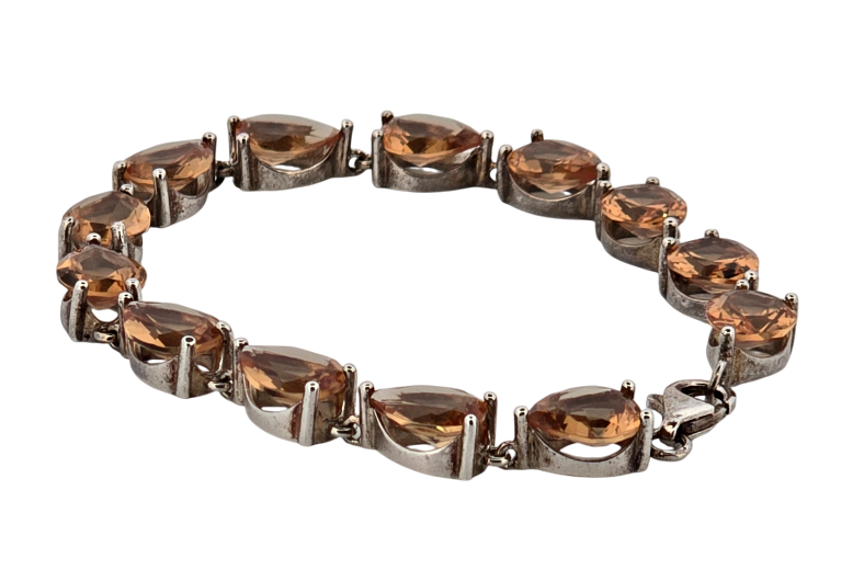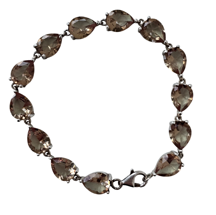Popis: Stříbrný náramek se syntetickými sultanity, kapkového tvaru. Překrásně třpytivé, mění barvu dle intenzity a lomu světla (hnědá, zelená, oranžová, růžová, žlutá, modrá). Zapínání na karabinu.
