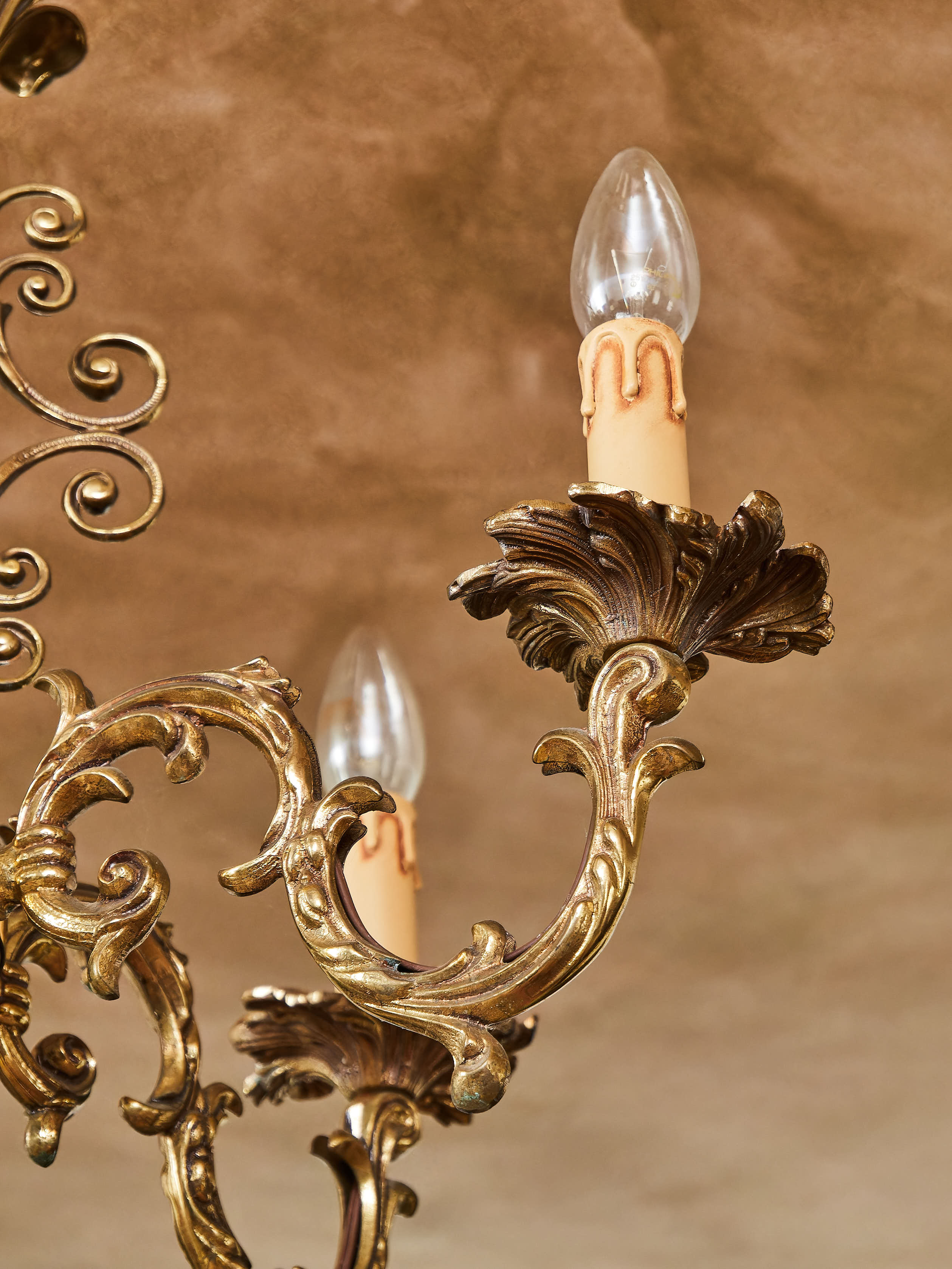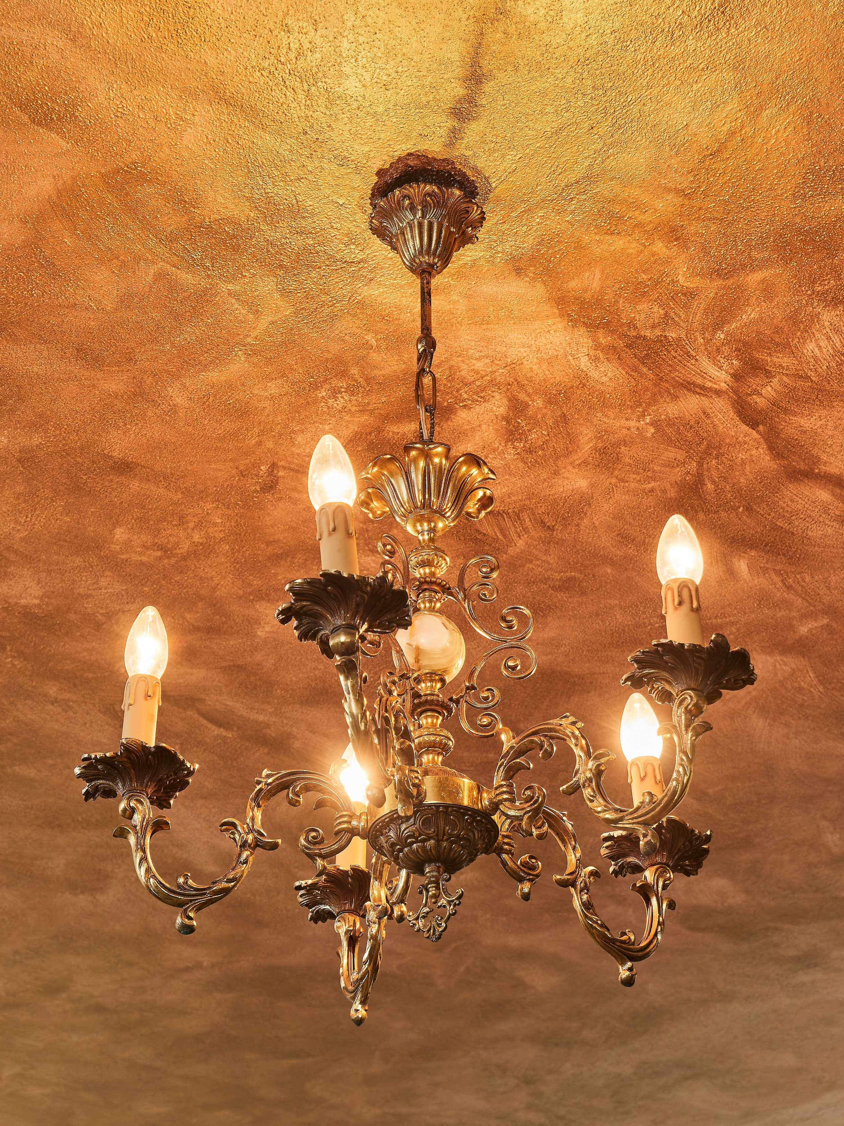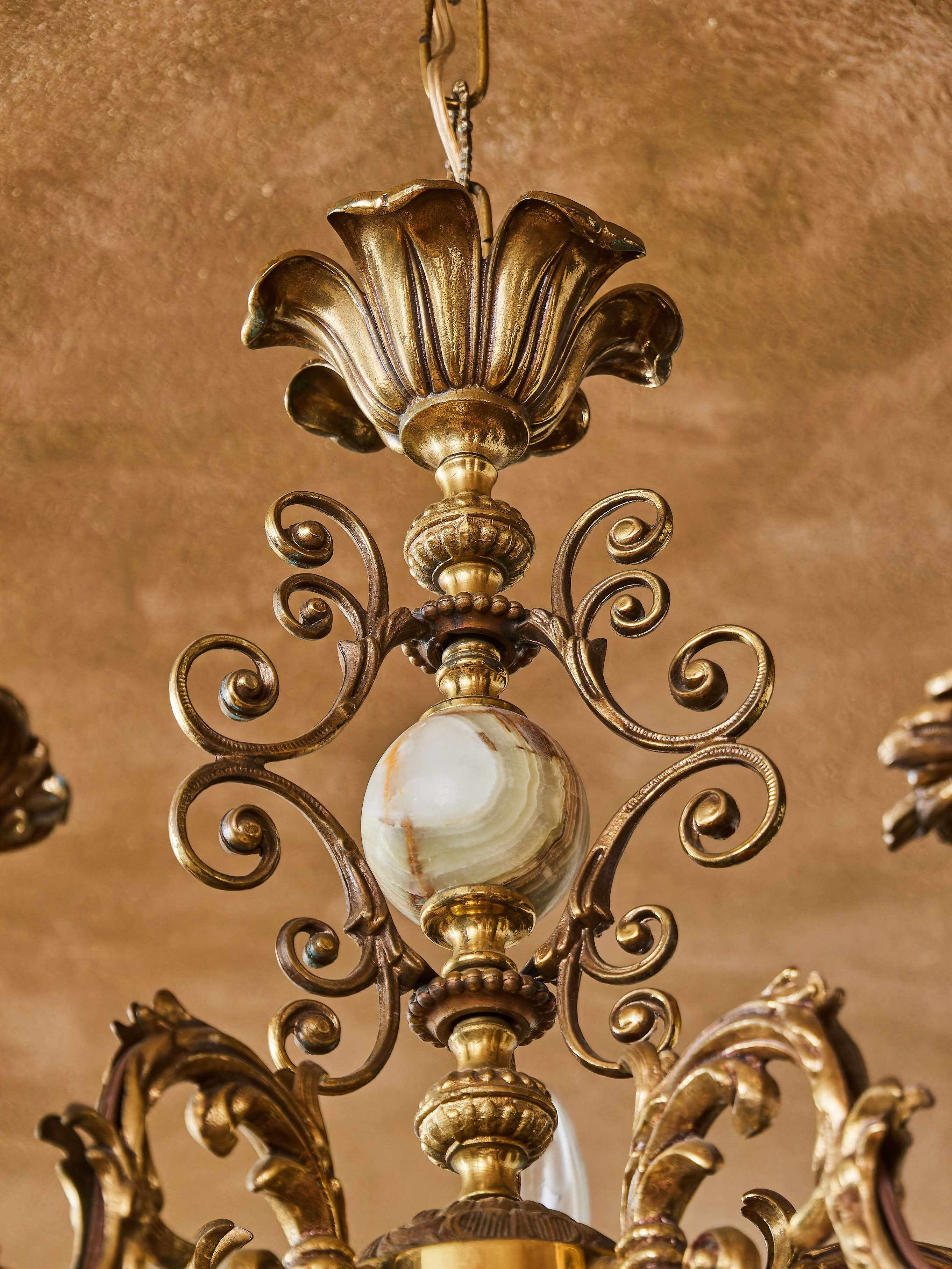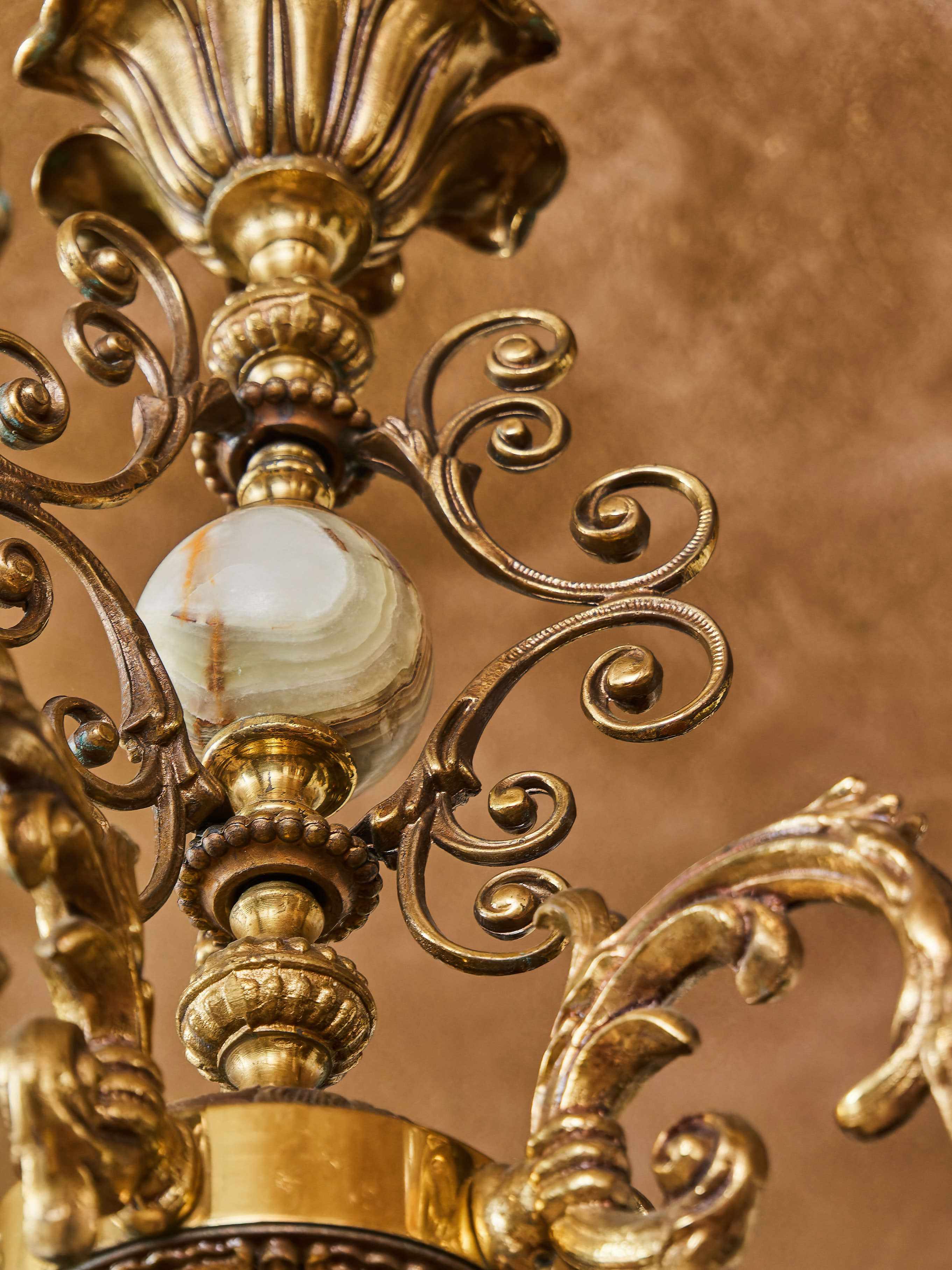 Tento elegantní historický lustr je vyroben z kvalitní mosazi v kombinaci s dekorativním onyxem. Jeho bohatě zdobené ramena s jemnými ornamentálními detaily vytvářejí jedinečný umělecký dojem a dodávají interiéru noblesní atmosféru.
