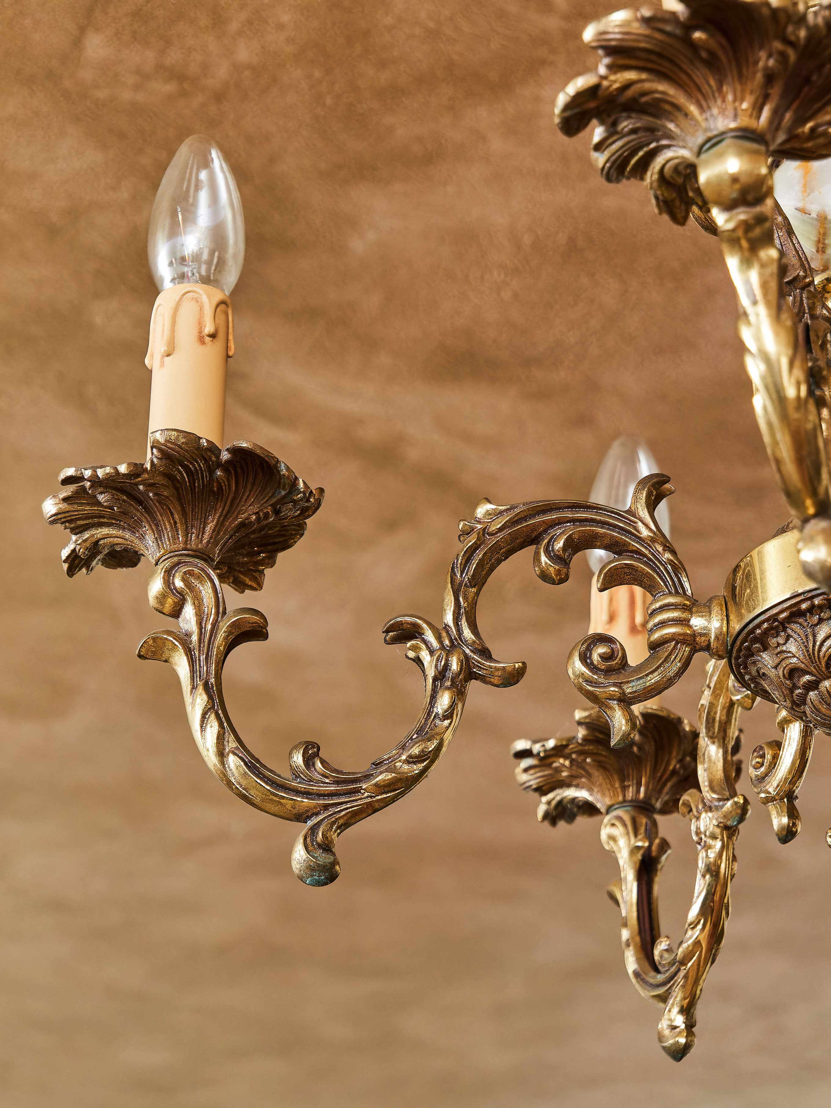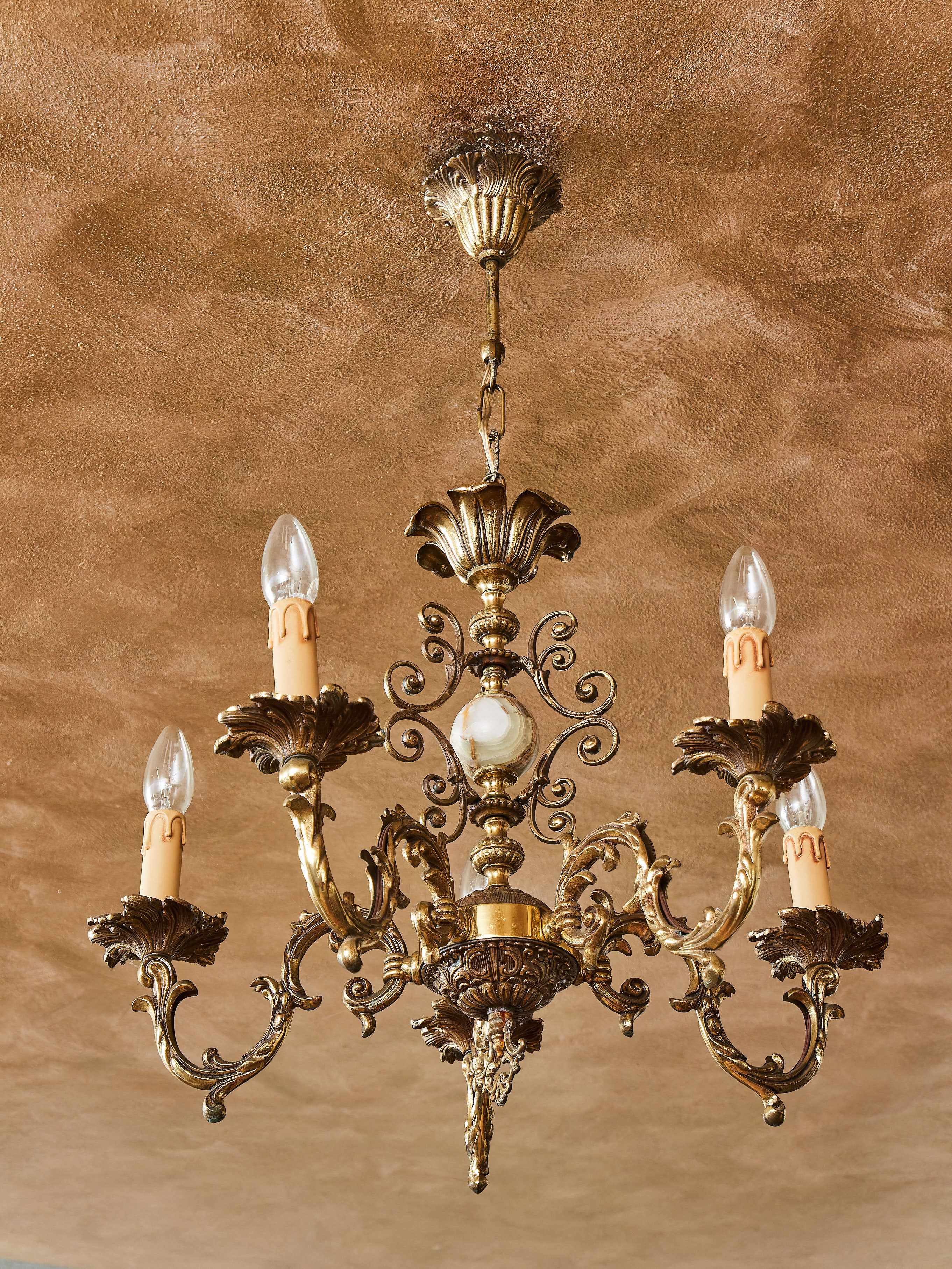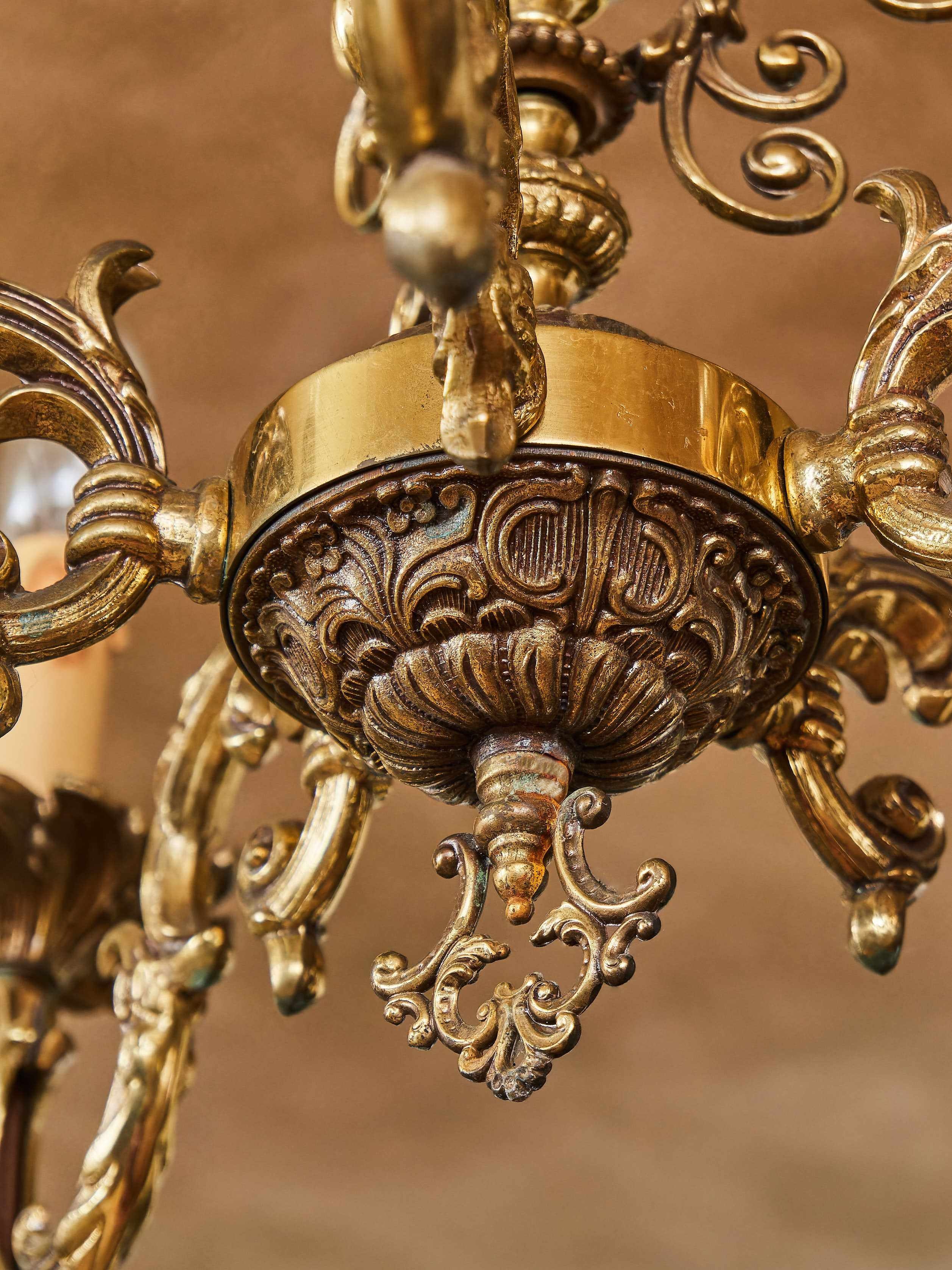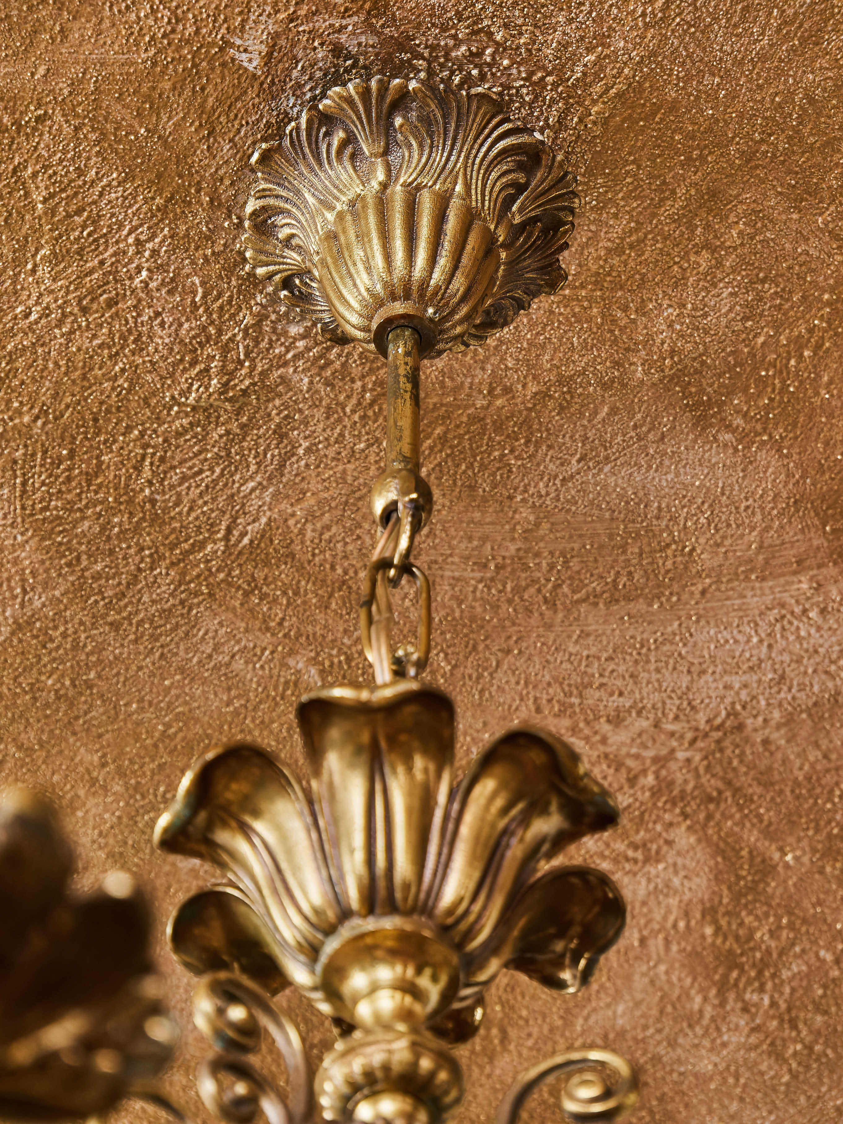 Tento elegantní historický lustr je vyroben z kvalitní mosazi v kombinaci s dekorativním onyxem. Jeho bohatě zdobené ramena s jemnými ornamentálními detaily vytvářejí jedinečný umělecký dojem a dodávají interiéru noblesní atmosféru.