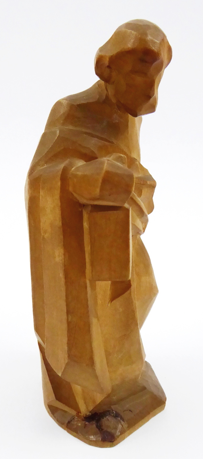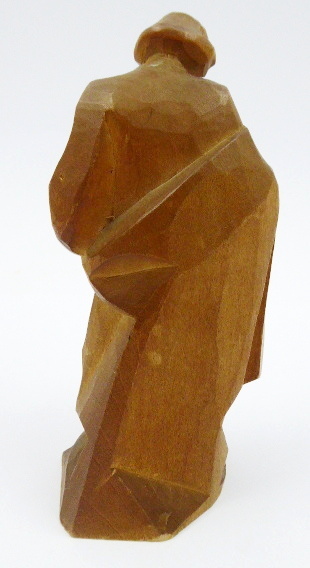 Dřevořezba. Přiloženo osvědčení Národního památkového ústavu České republiky. Malá soška ručně řezaná z přírodního dřeva představující vousatého muže se skloněnou hlavou oděného v dlouhý šat a plášť. Střední Evropa 1900 – 1940. Výška 13,5 cm.
