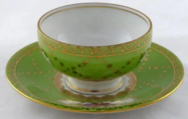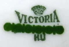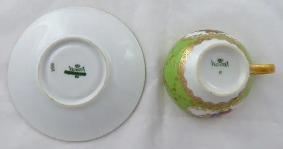 Bílý, barevný a zlacený porcelán. Šálek miskovitého tvaru se zlaceným úchytem a zlacenými linkami. Šálek a podšálek se zlacenými kartušemi, barevnými květinami, zlacenými rokaji, ornamentem a tečkami. Značeno zespodu: zeleně Victoria s korunou a písmenem R, číslo 254. Porzellanfabrik Victoria, Továrna na porculán Victoria. Čechy, Stará Role 1937 – 1947. Výška 4 cm, průměr 11,5 cm.