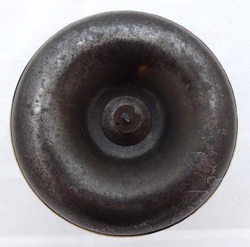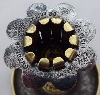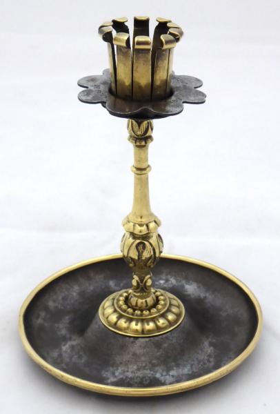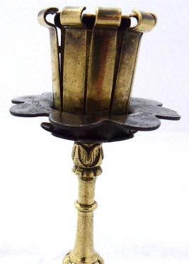 Leštěná mosaz a litina. Posuvná horní litinová miska, obloukovitě tvarovaná. Reliéfně zdobený neorenesanční svícen s bočními úchyty na vosk z leštěné mosazi. Misky z litiny. Značený v horní části: K. K. OESTR. rakouská orlice No. 10389 (císařský a královský rakouský patent). Výška 14 cm, šířka 11 cm.