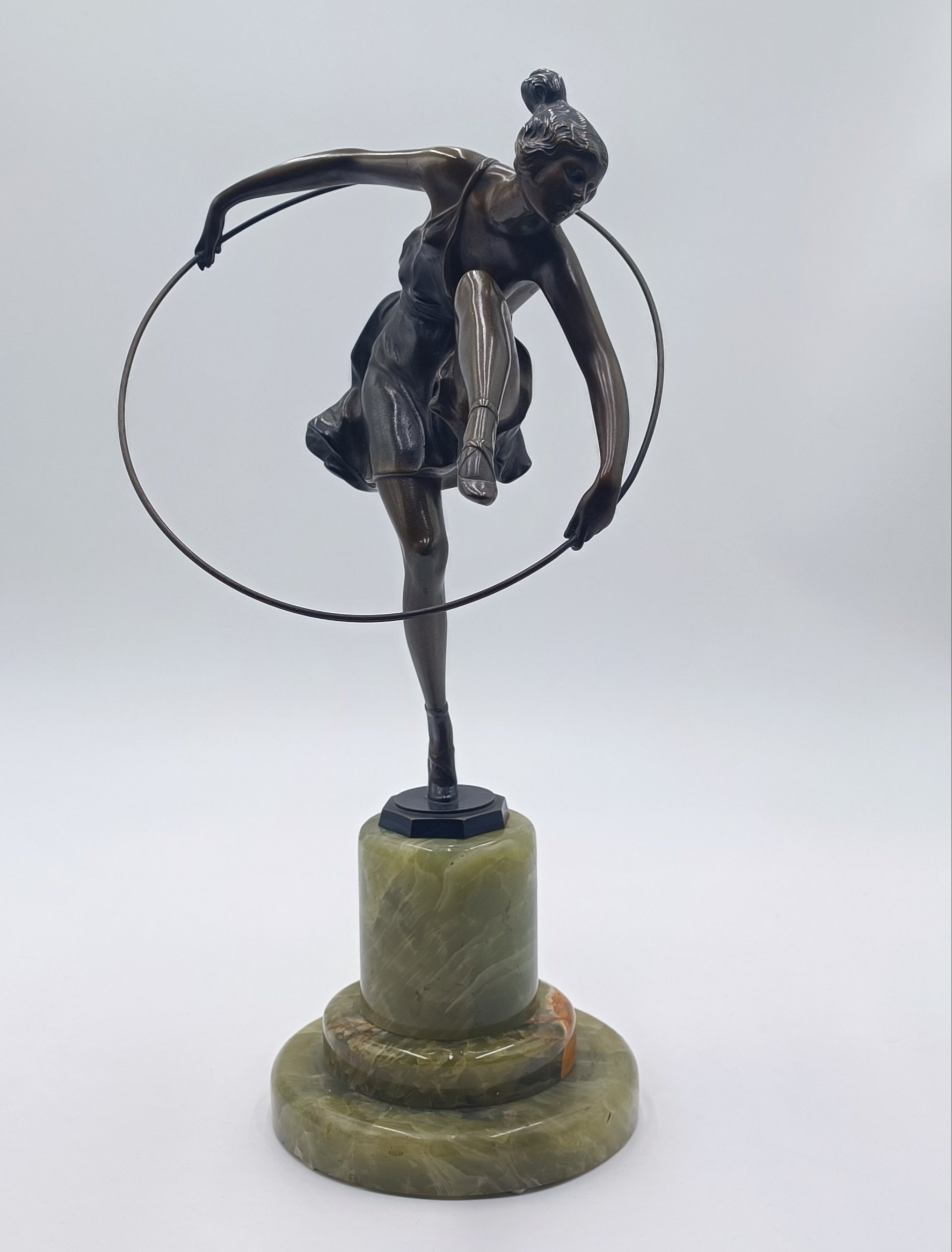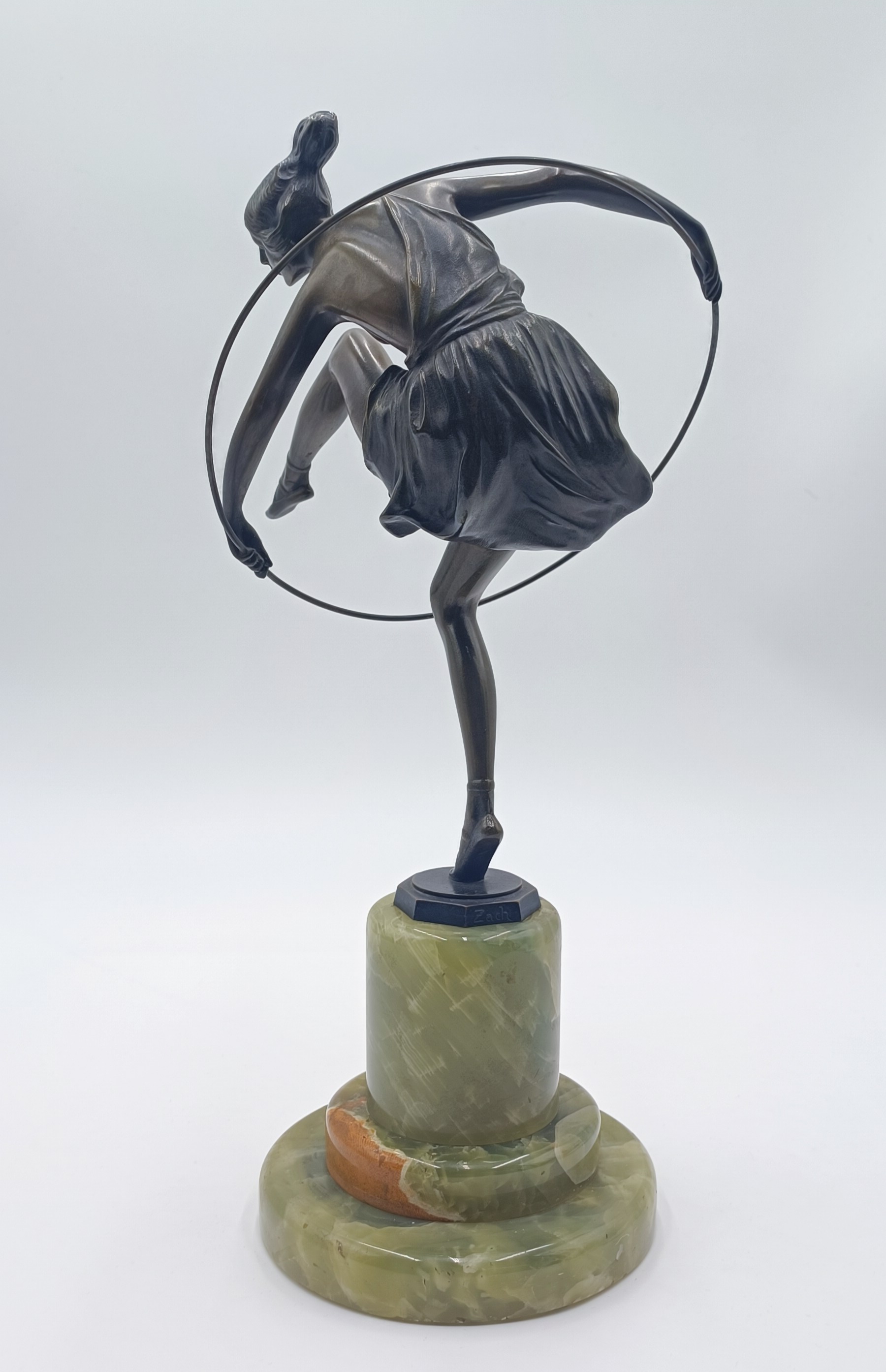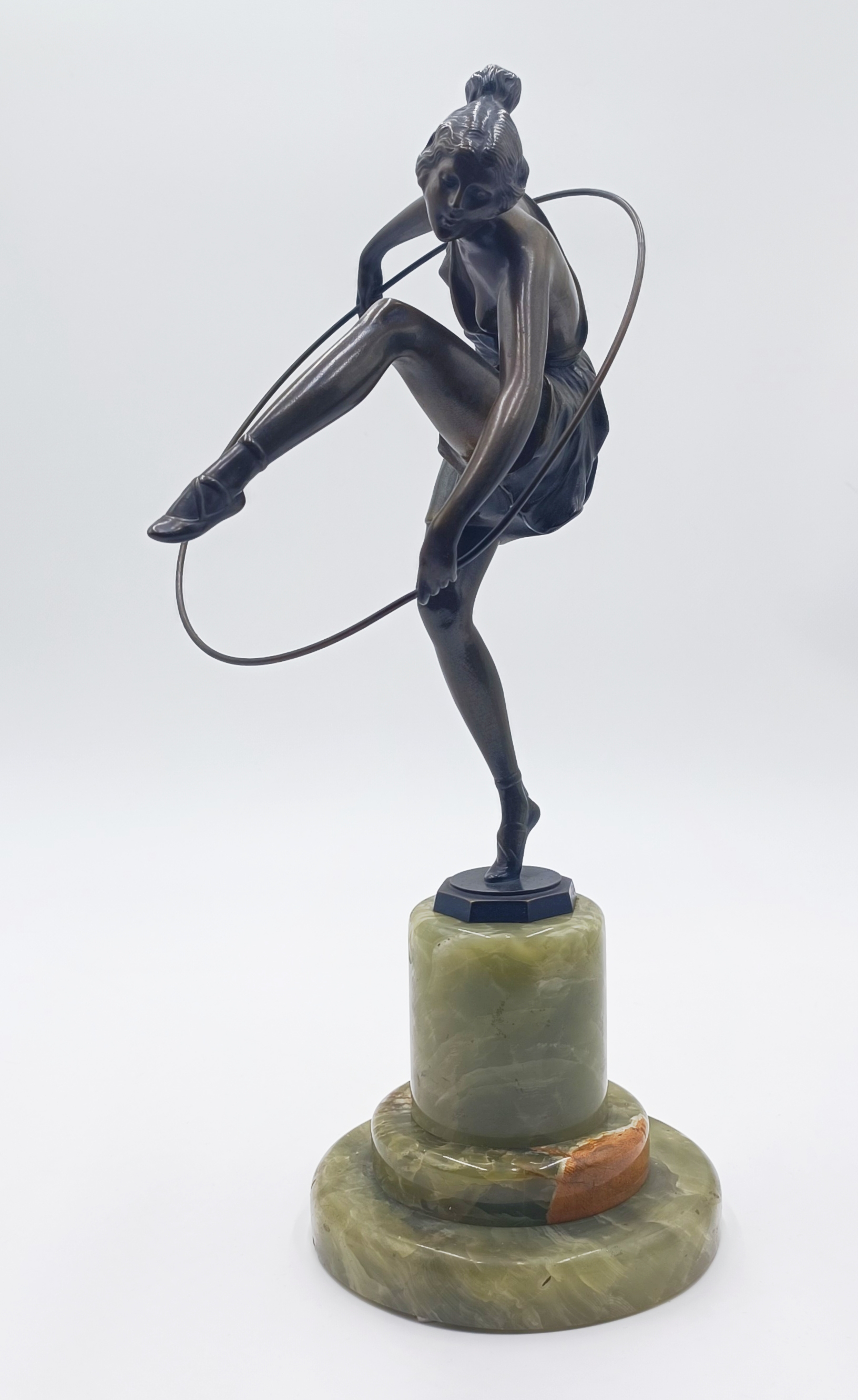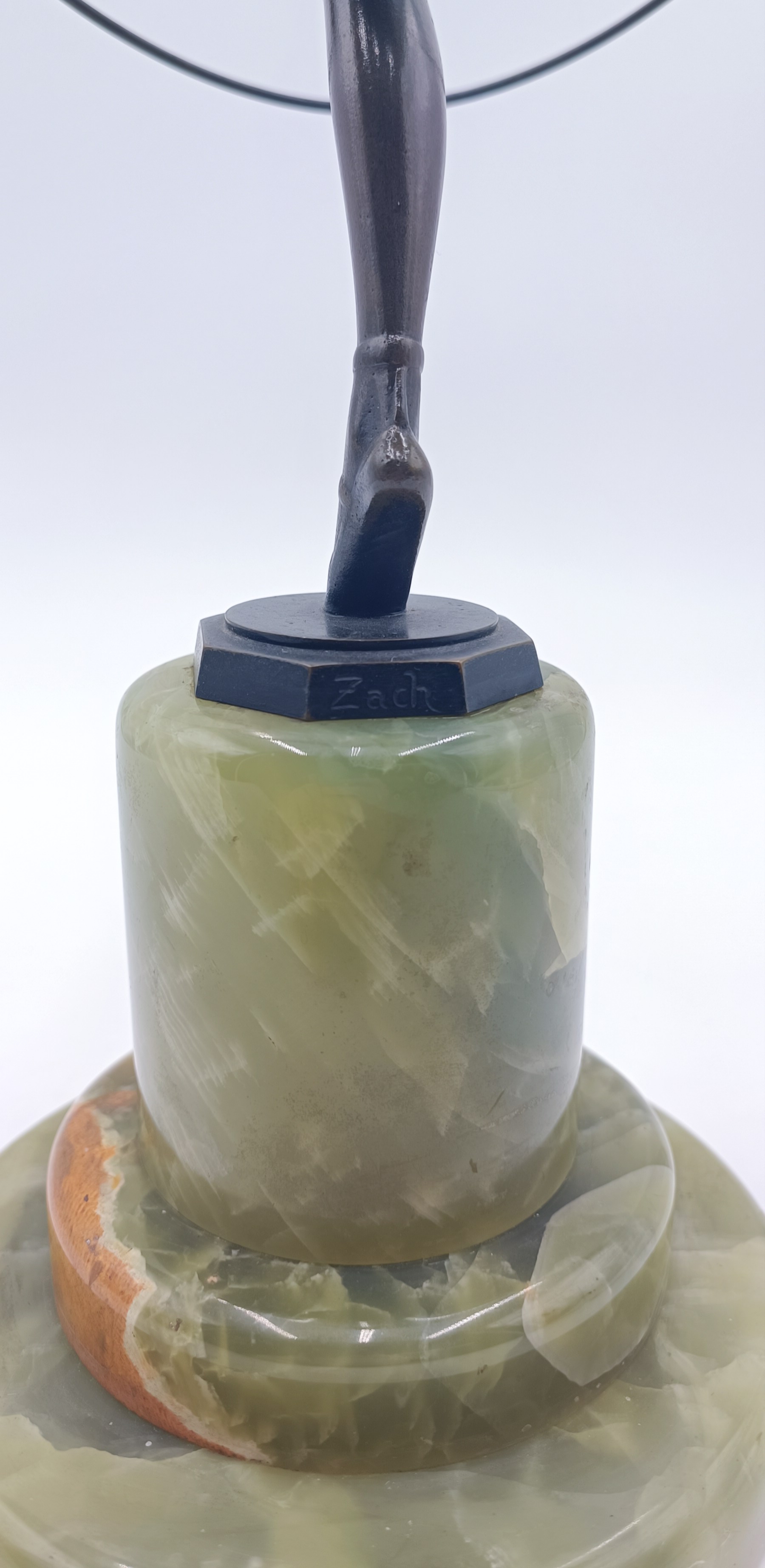 Bronzová art deco socha tanečnice, s odhaleným ňadrem, detailně propracovaná socha, na onyxovém podstavci, Bruno Zach (1891-1935), Rakousko, kolem roku 1930, celková výška 41 cm, průměr kruhu cca 20 cm