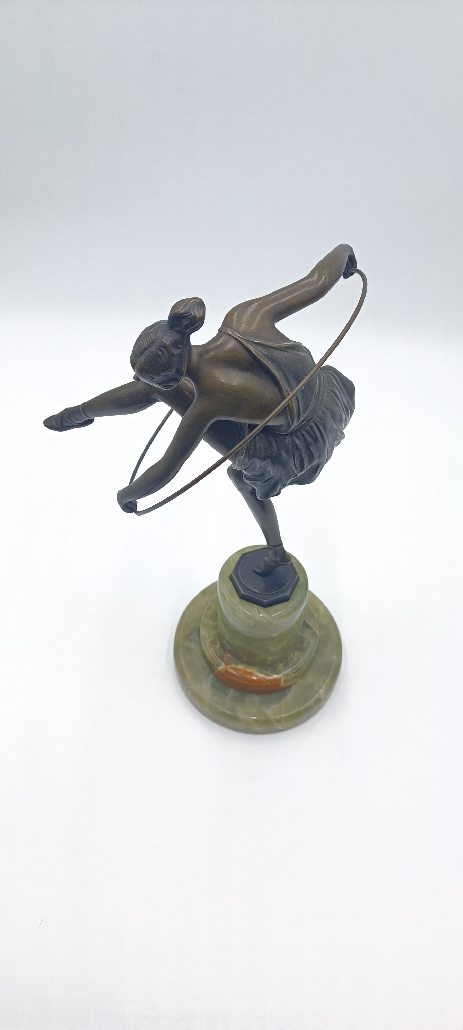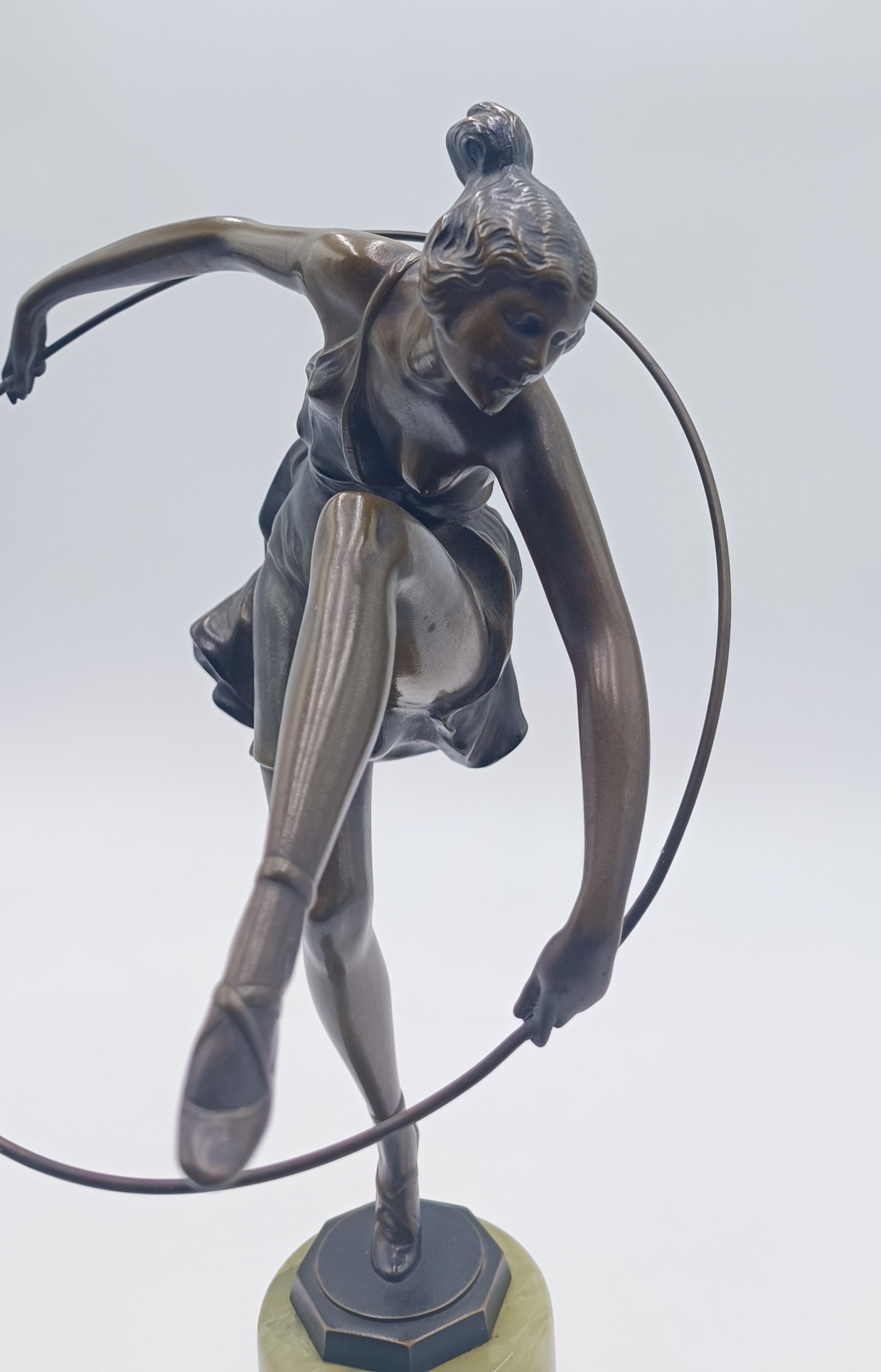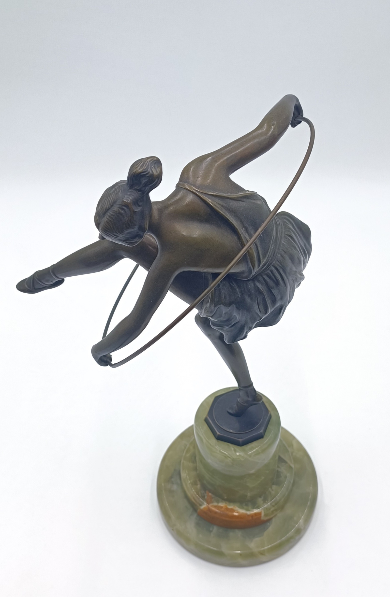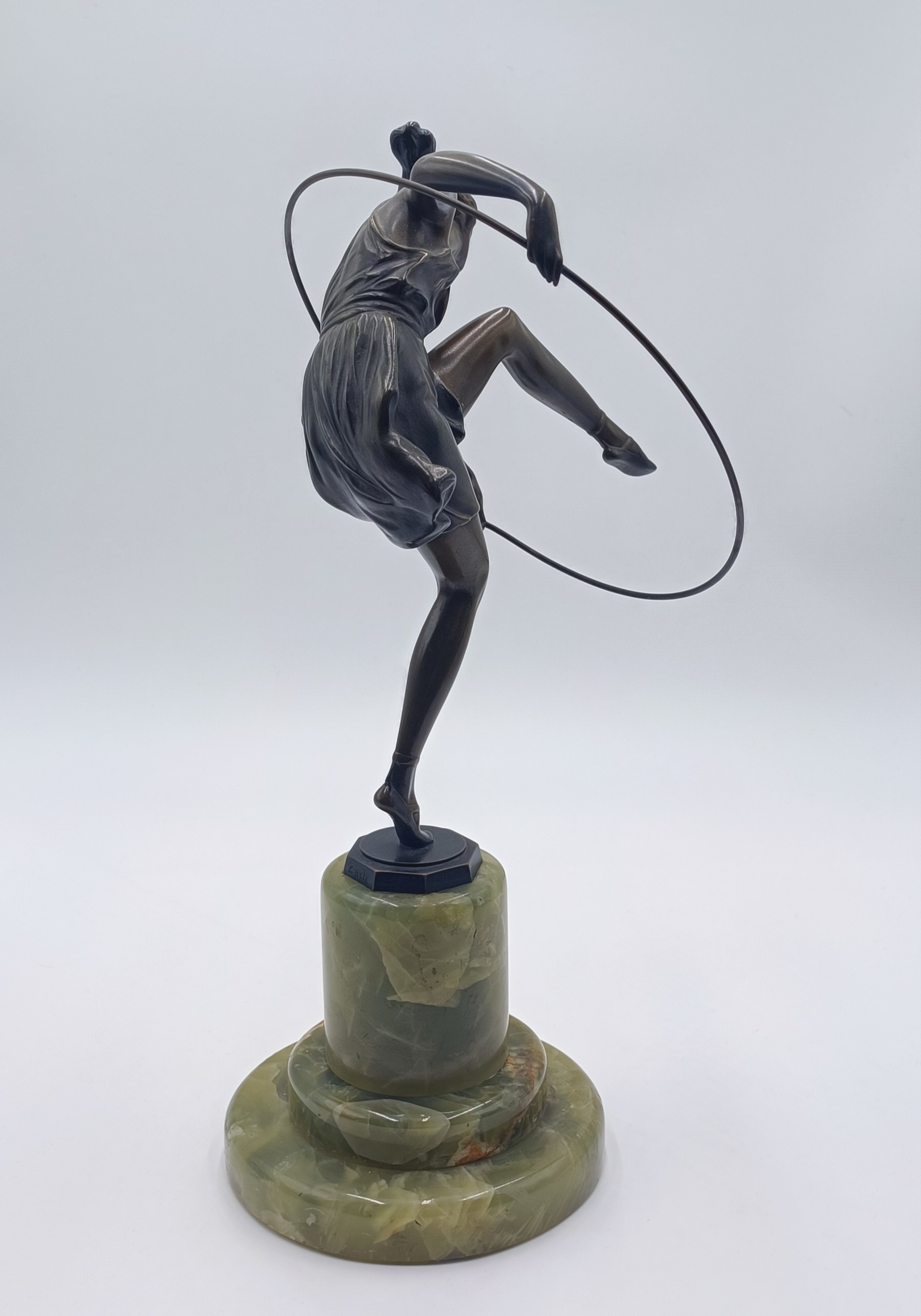 Bronzová art deco socha tanečnice, s odhaleným ňadrem, detailně propracovaná socha, na onyxovém podstavci, Bruno Zach (1891-1935), Rakousko, kolem roku 1930, celková výška 41 cm, průměr kruhu cca 20 cm