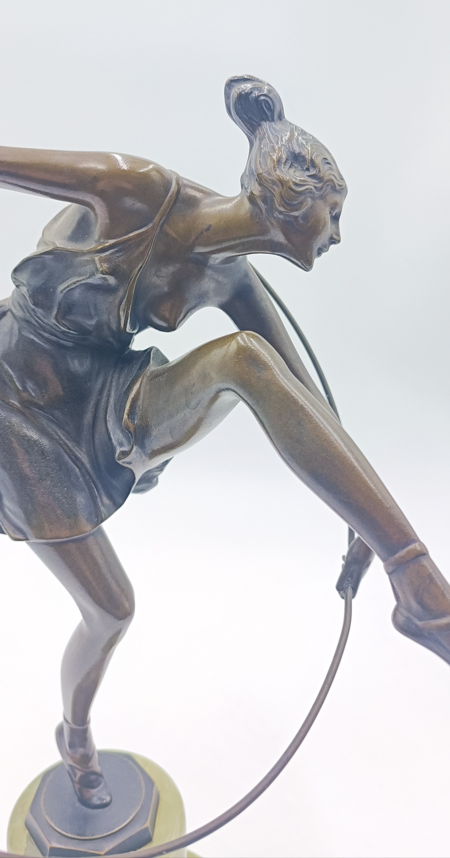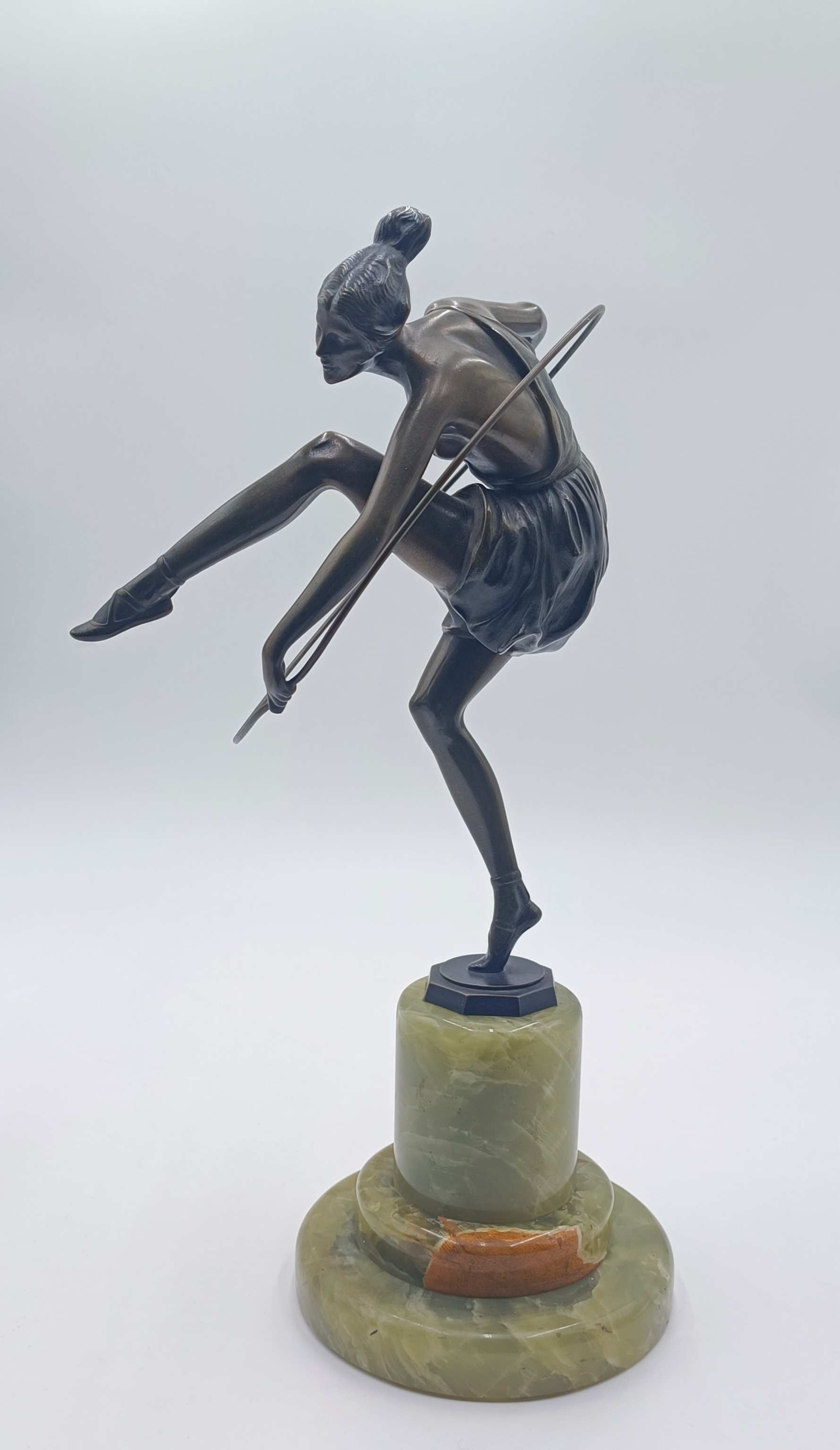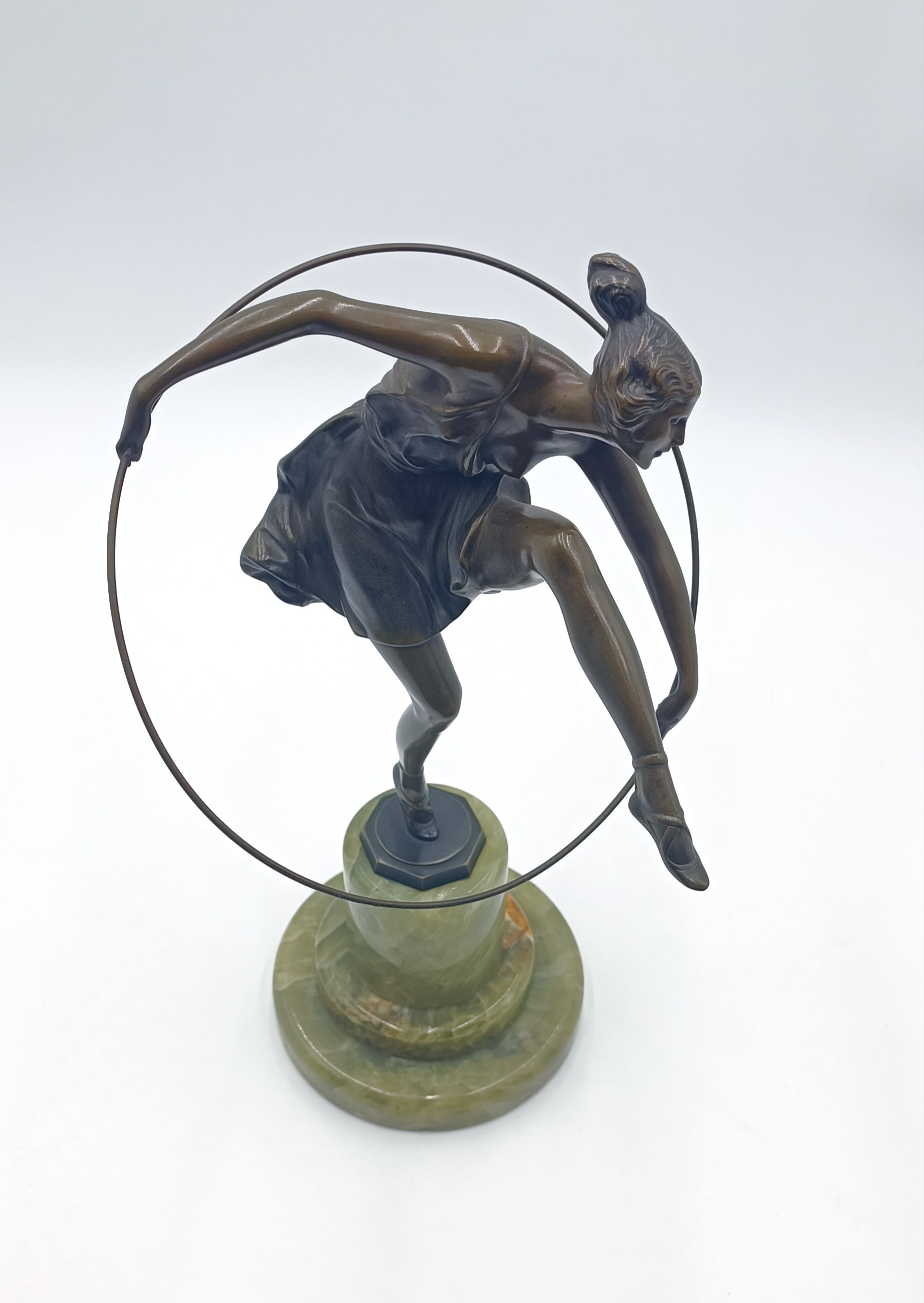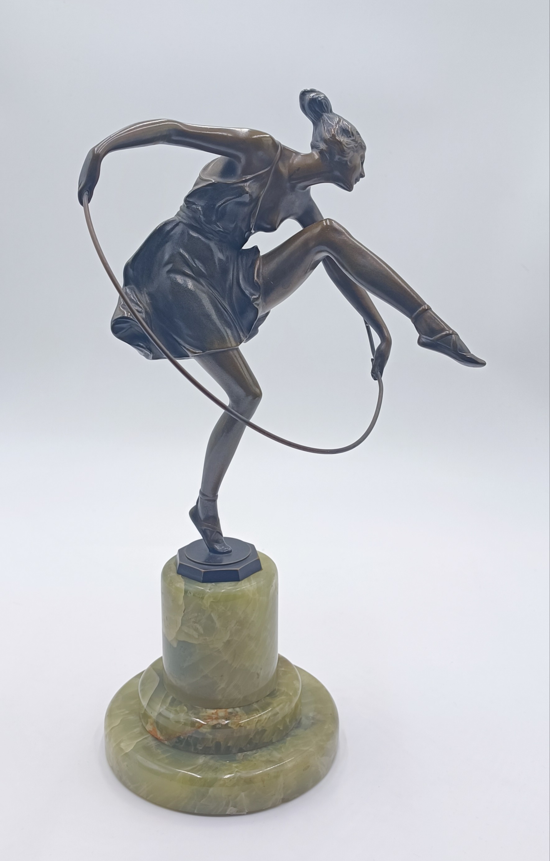 Bronzová art deco socha tanečnice, s odhaleným ňadrem, detailně propracovaná socha, na onyxovém podstavci, Bruno Zach (1891-1935), Rakousko, kolem roku 1930, celková výška 41 cm, průměr kruhu cca 20 cm