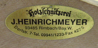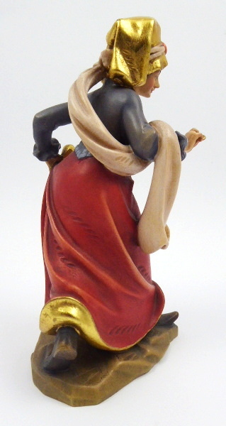 Dřevořezba, polychromie, zlacení. Práce profesionálního řezbáře. Kopie ze světově proslulé série Moriskentänzer (tanečníků Morrisova tance). Autor originální předlohy: Erasmus Grasser (1450-1518) slavný německý pozdně gotický řezbář, sochař a architekt. Jeho nejznámějším dílem jsou právě tito tanečníci. Sérii v originálu velmi vysokých soch z lipového dřeva vytvořil Erasmus Grasser pro taneční sál Staré radnice v Mnichově. Morrisův tanec (Moriskův) je starý lidový tanec, jenž se tančil na anglosaském území. Název této figury: Tanzjungfer (Tanečnice). Výrobce: Řezbářství J. Heinrichmeyer, Rimbach, Německo. Ručně barevně malovaná a zlacená dřevořezba. Značeno zespodu na podstavci: originální zlatá nálepka výrobce. Německo, Rimbach, minulé století. Výška 24 cm.