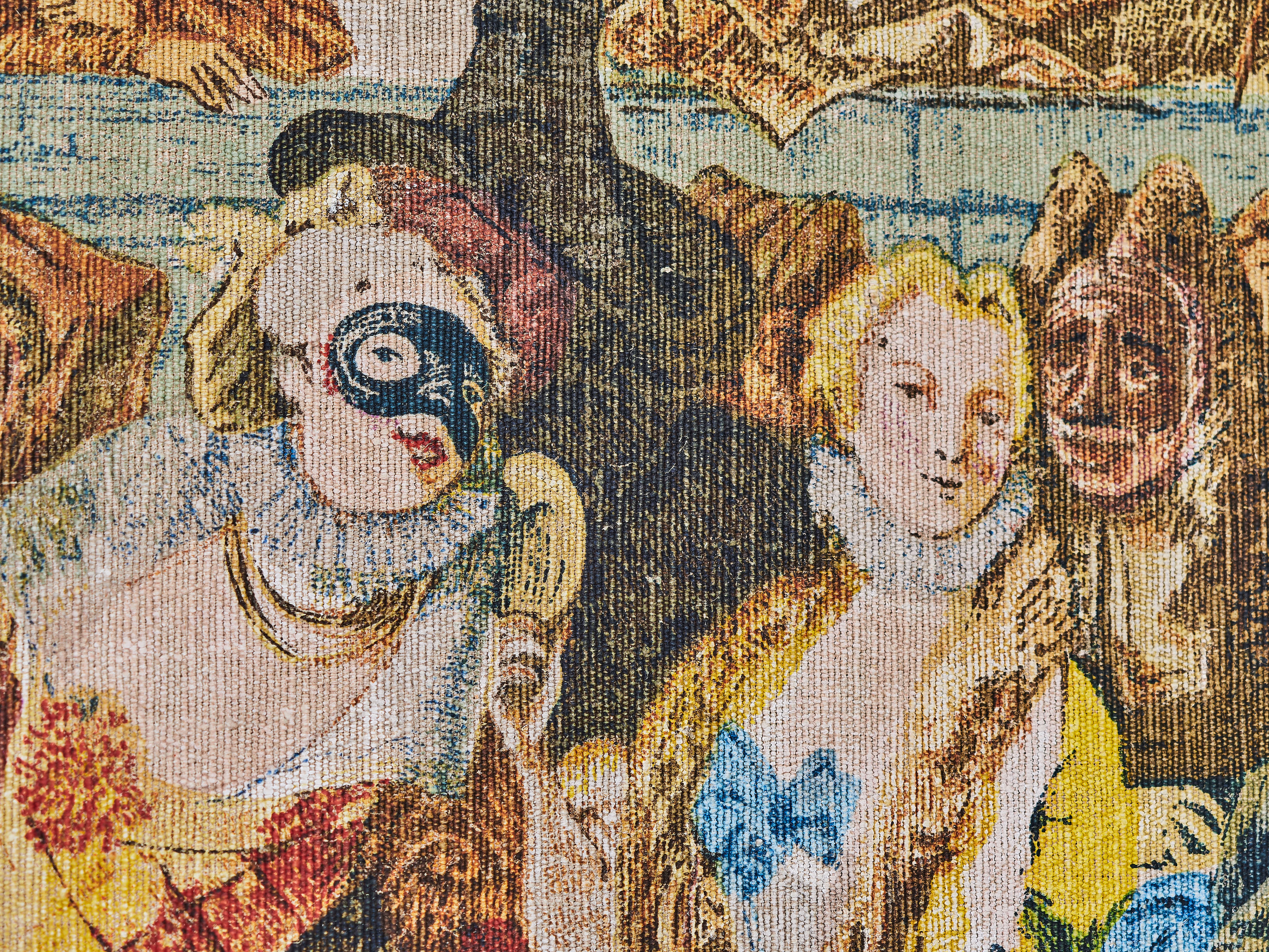 Tato výjimečná tapiserie pochází z renomované francouzské manufaktury Robert Four v Aubussonu, městě s více než šestisetletou tradicí výroby gobelínů. Zobrazuje elegantní výjev společenské slavnosti s postavami v karnevalových maskách a barokních kostýmech, odehrávající se před sochou a pod širým nebem – scéna evokuje atmosféru benátského karnevalu a divadla commedia dell’arte.