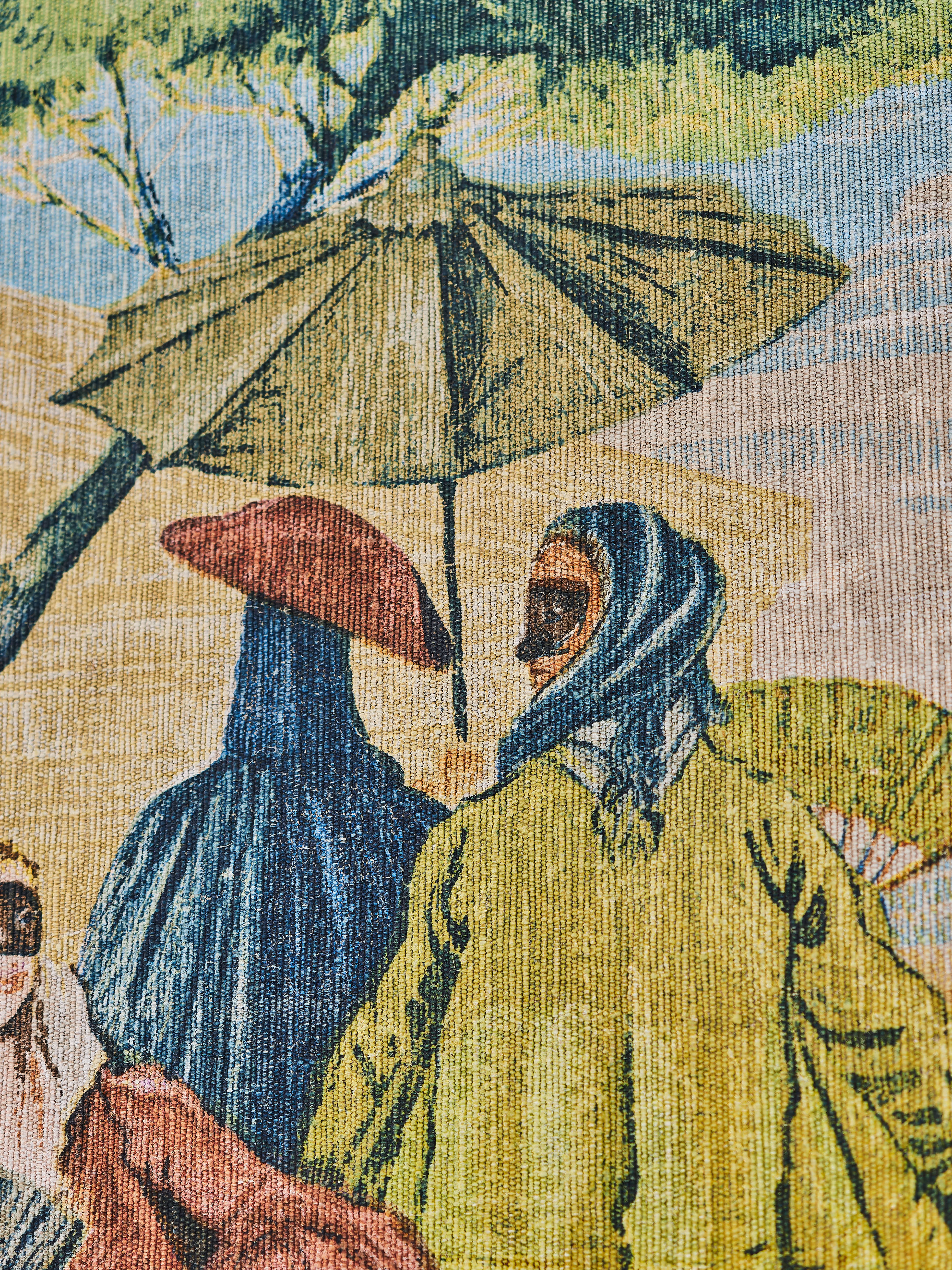 Dílo vyniká brilantním koloritem, jemnou strukturou a precizním detailem v zachycení oděvních vzorů i výrazu postav. Jedná se o ručně tištěnou tapiserii, která spojuje řemeslnou zručnost a umělecký výraz typický pro tvorbu manufaktury Robert Four. Tkanina je reverzně opatřena podšívkou pro stabilní zavěšení, což svědčí o jejím pečlivém zpracování a určení pro reprezentativní interiéry.