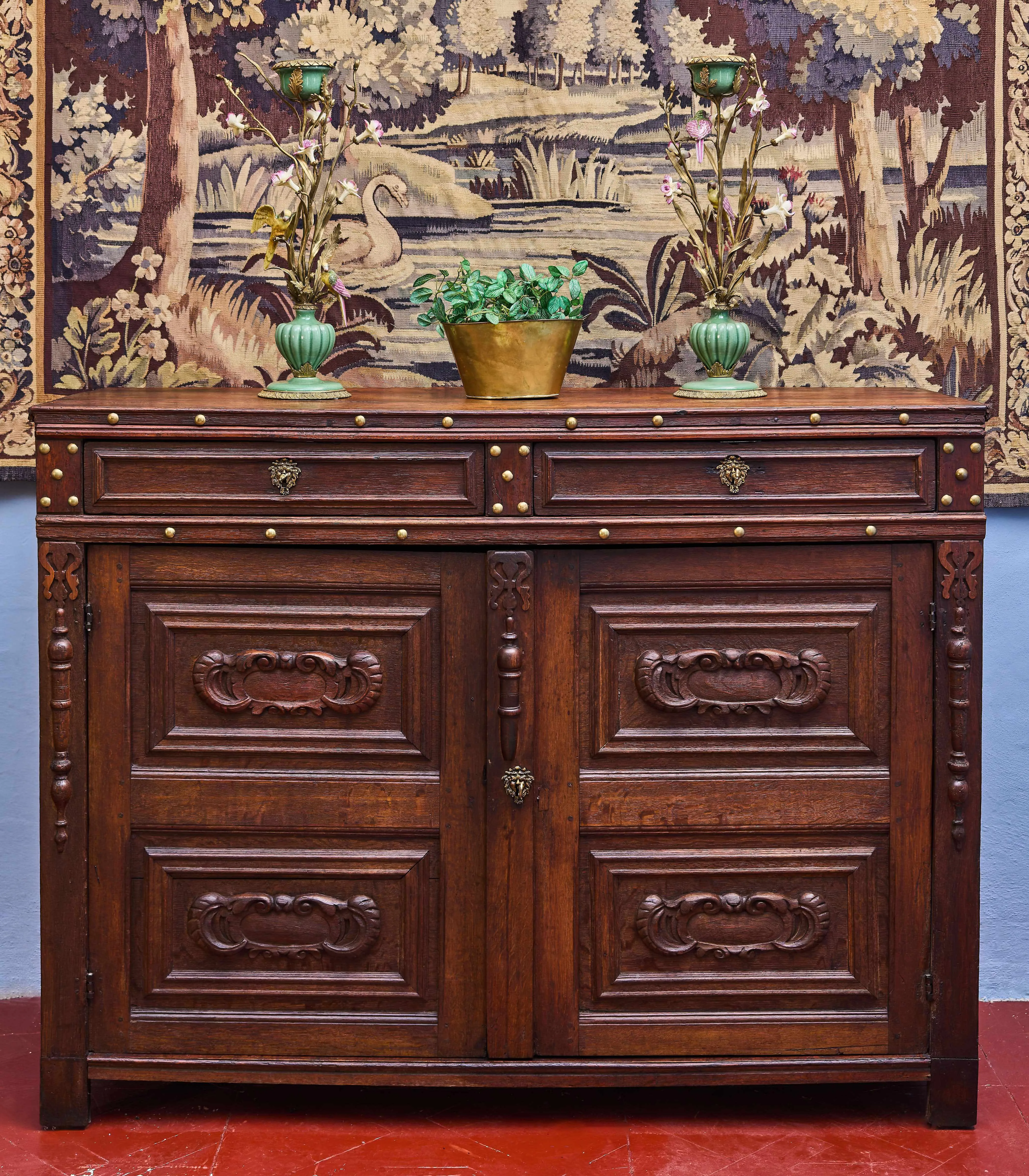 Bronzové ozdoby. Krásná mramorová deska. Dýhová skládanka do různých motivů ( hvězdy a čtverce ). Zámky funkční a klíč součástí. Tato skříň byla vyrobena speciálně pro umístění televize v interiéru, aby technika nerušila prostor. Skříň je uzpůsobena pro televizi a další zábavní techniku. Záda mají otvory pro vedení kabeláže a odvětrávací průduchy. Skříň byla vyrobena v 70-tých letech minulého století a je v původním dobrém stavu.