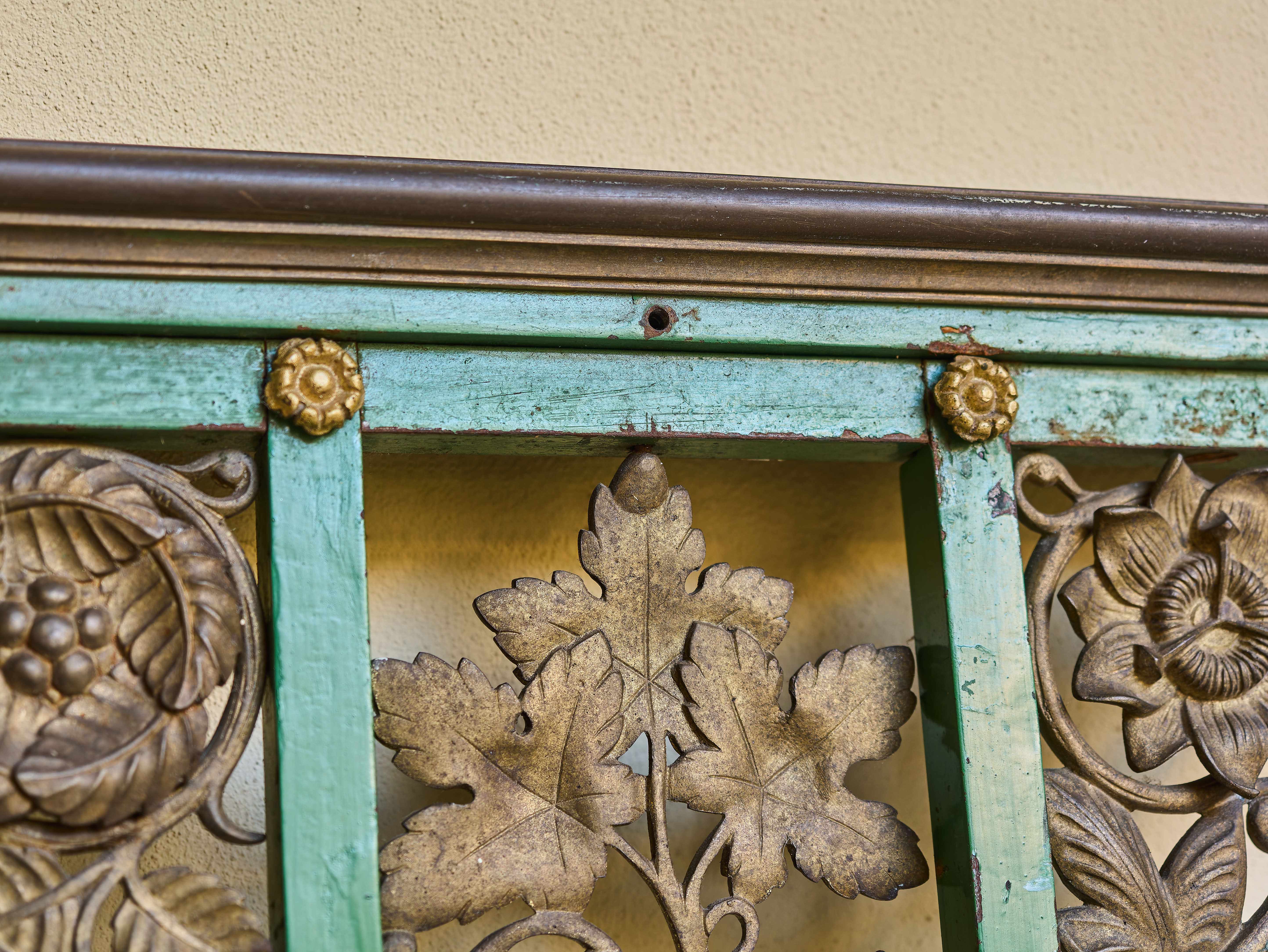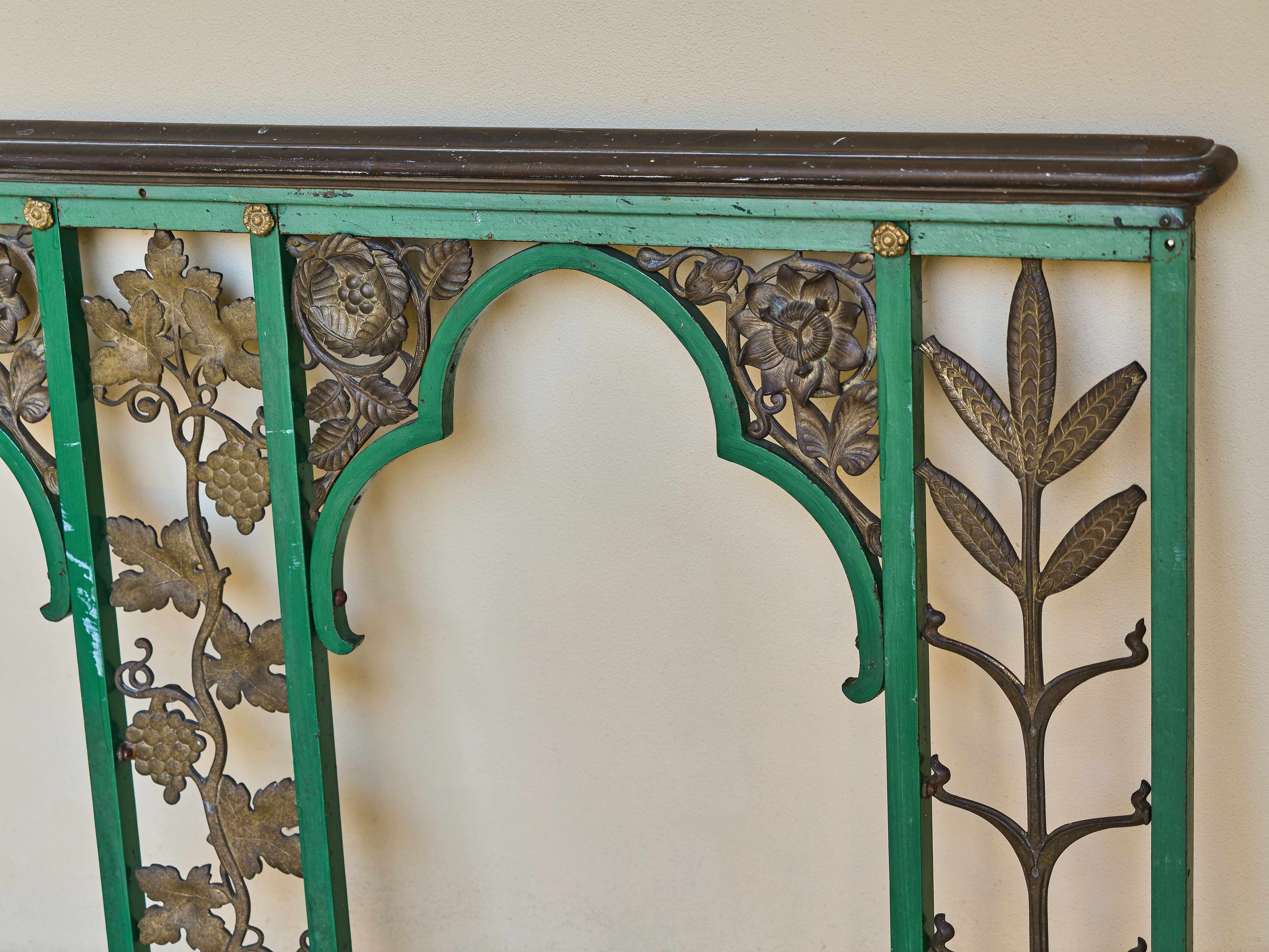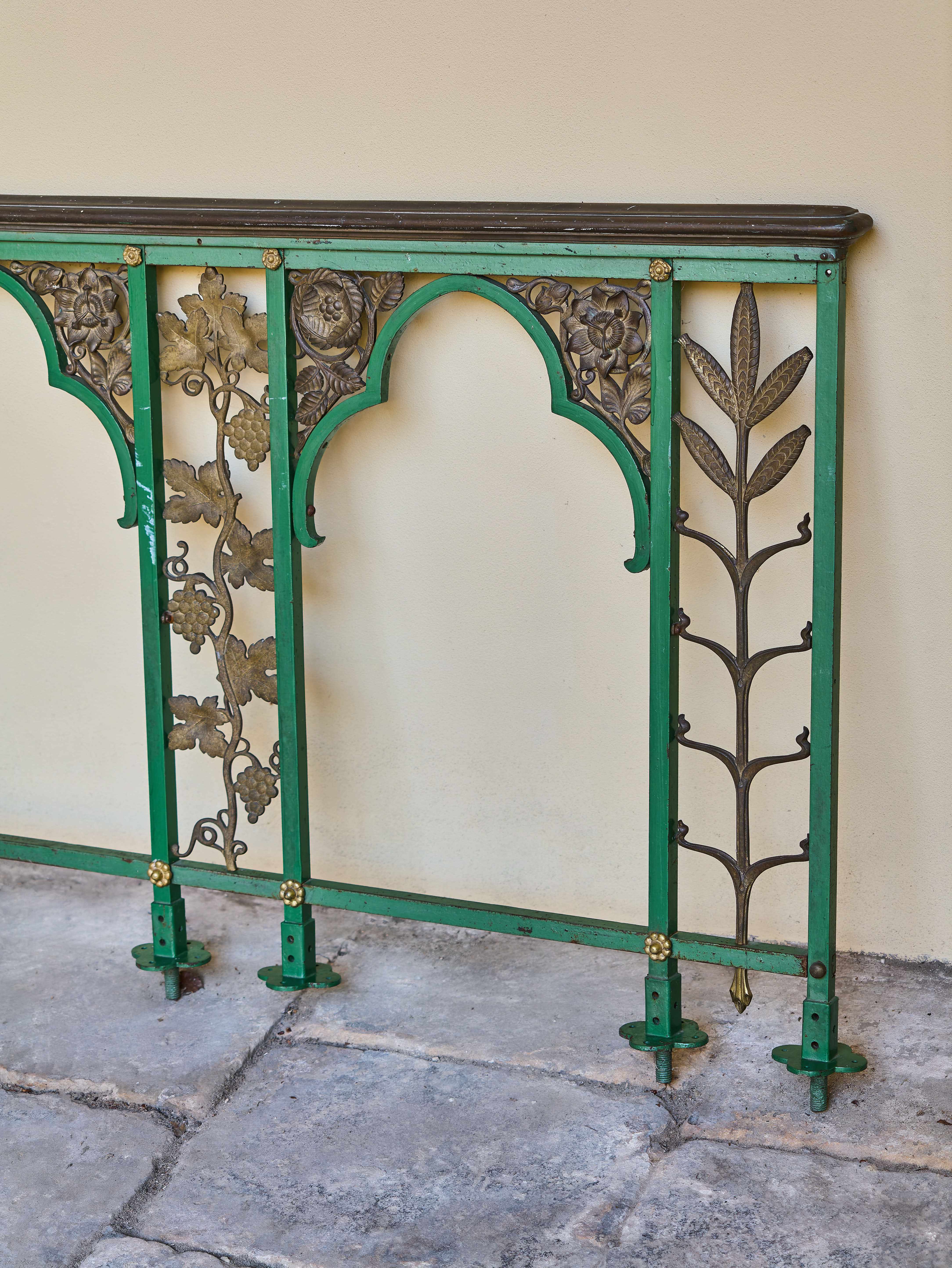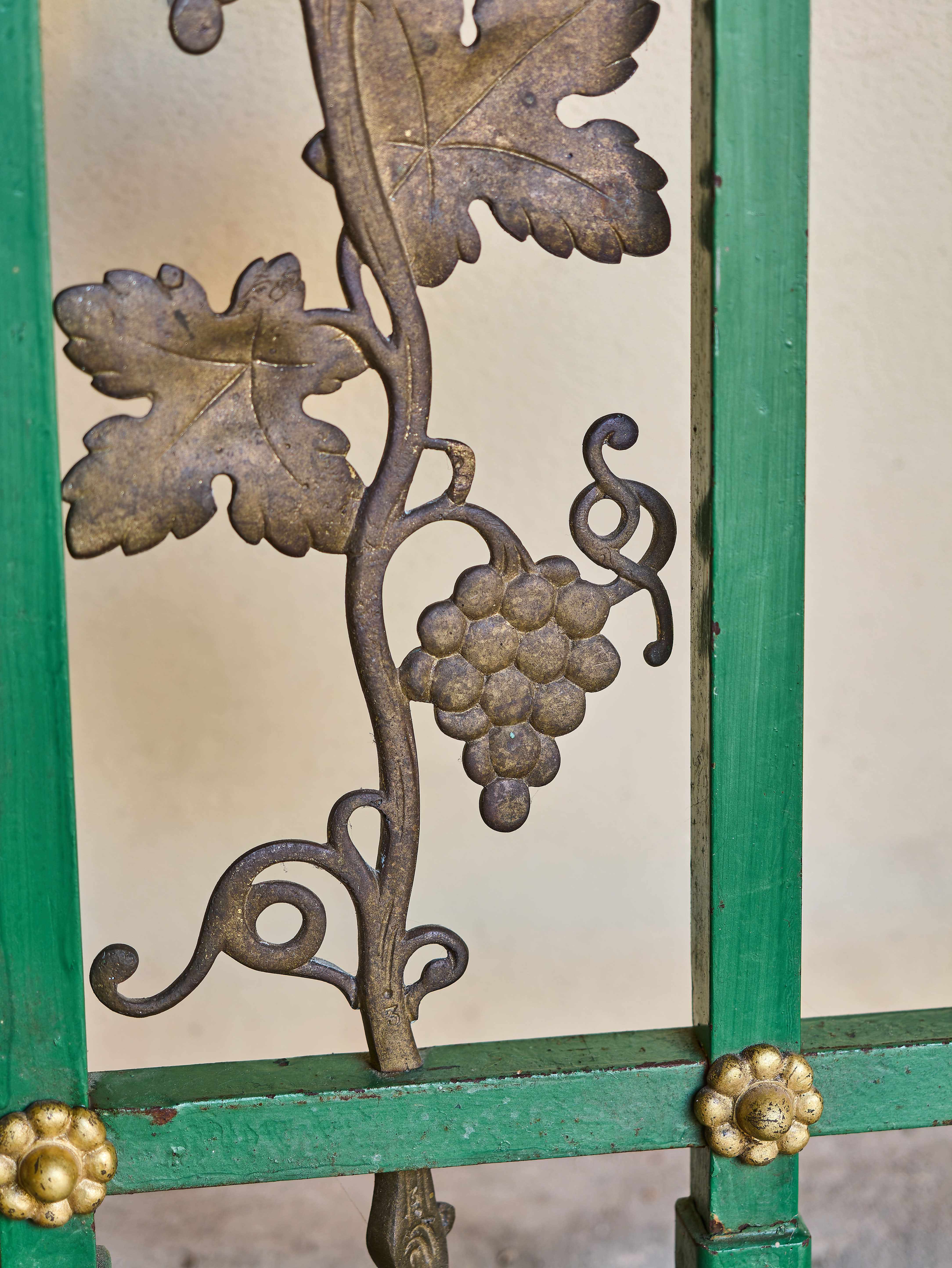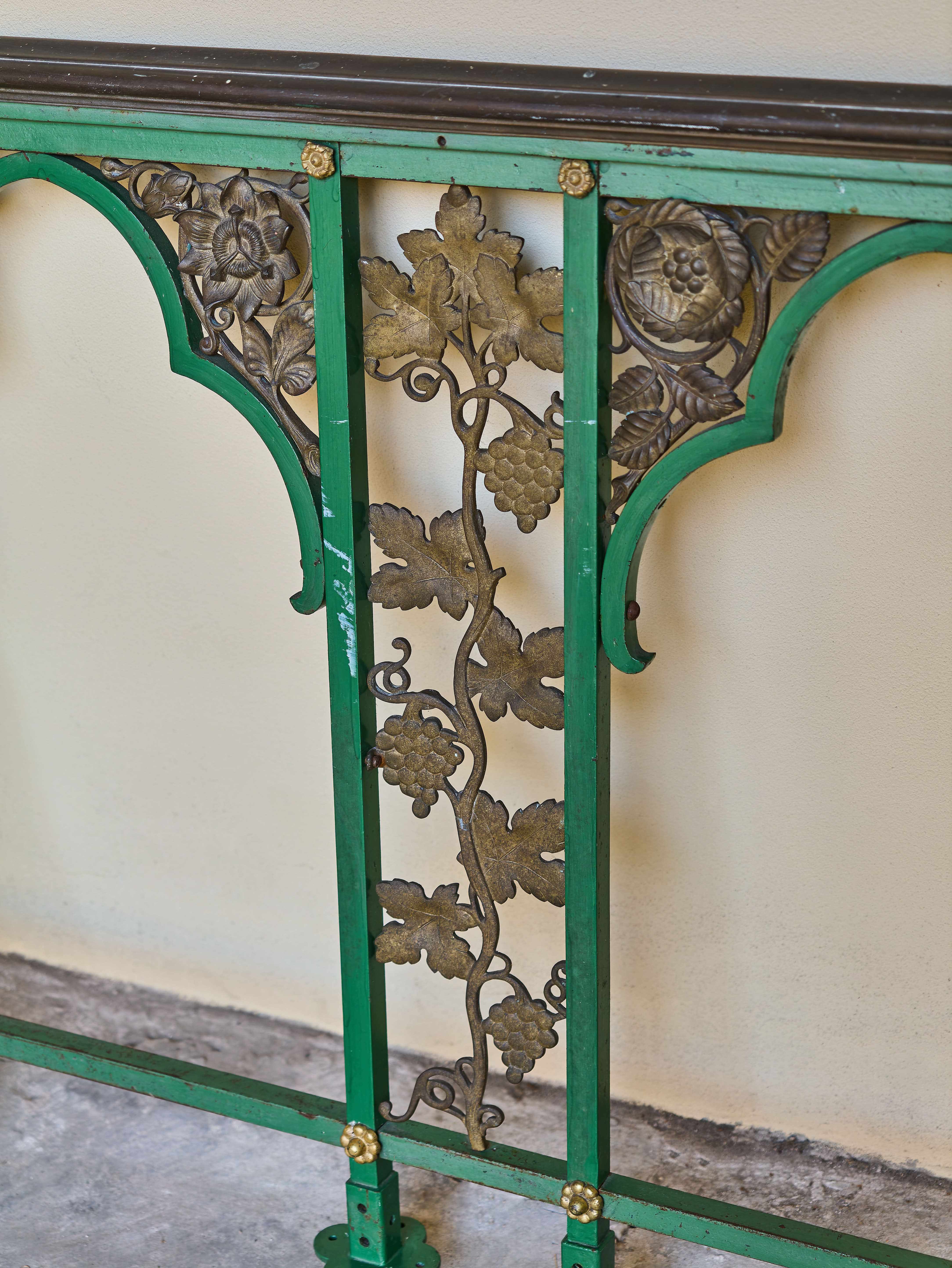 Masivní dekorativní zábradlí s bohatým motivem vinné révy, listů a hroznů, provedené v kombinaci těžkého bronzu a litiny. Jednotlivé panely jsou rámovány obloukovými gotizujícími prvky a doplněny plastickými florálními detaily v bronzové patině. Zábradlí působí velmi reprezentativně a výrazně, vhodné pro historické interiéry, vstupní haly, zimní zahrady či jako dekorativní prvek na terasu nebo galerii.