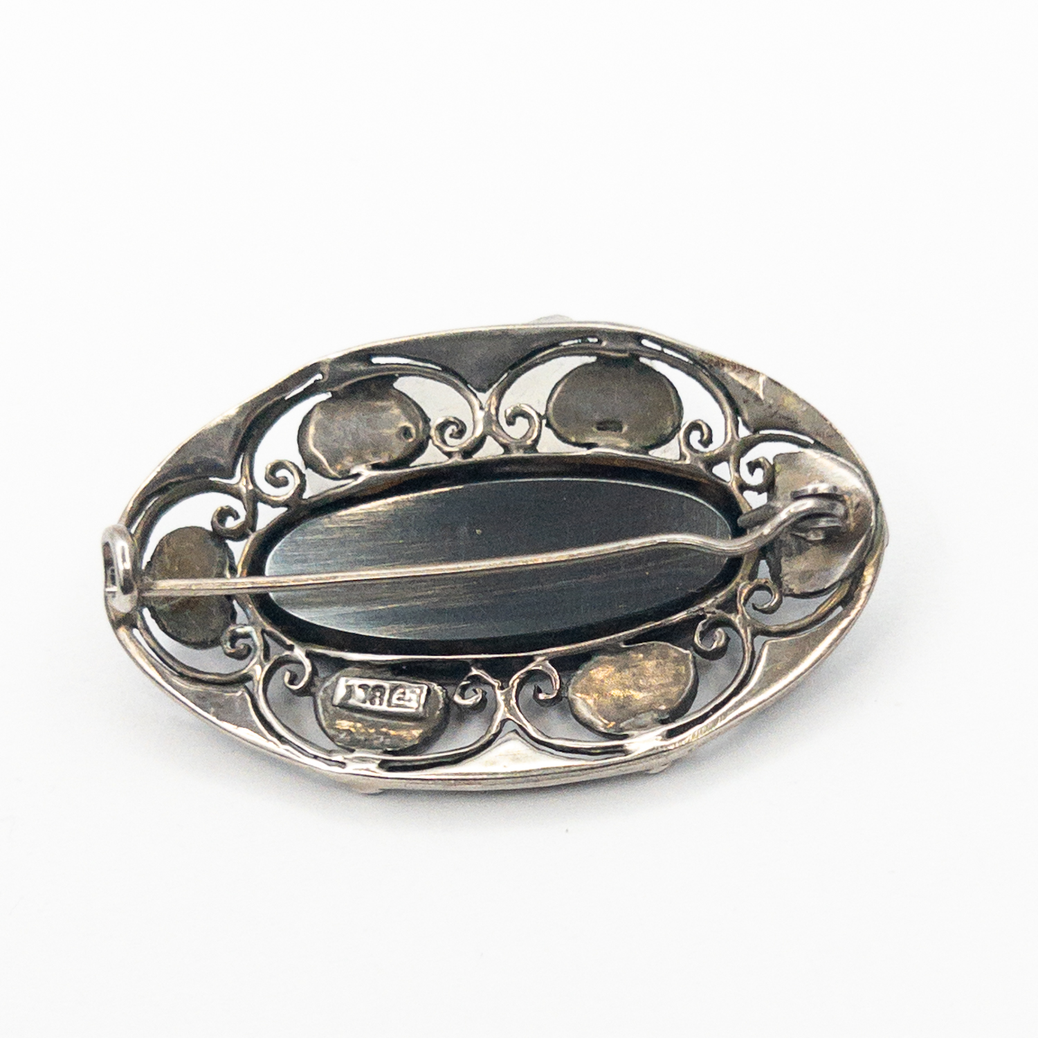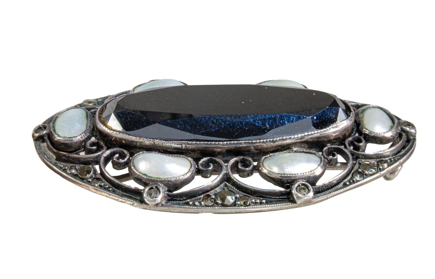 originální secesní stříbrná brož s fazetovaným onyxem , perletí a markazity od proslulé německé šperkařské manufaktury Theodor Fahrner z německého města Phorzheim pochází z období německého Jugendstilu, tedy z počátku 20. století