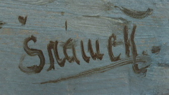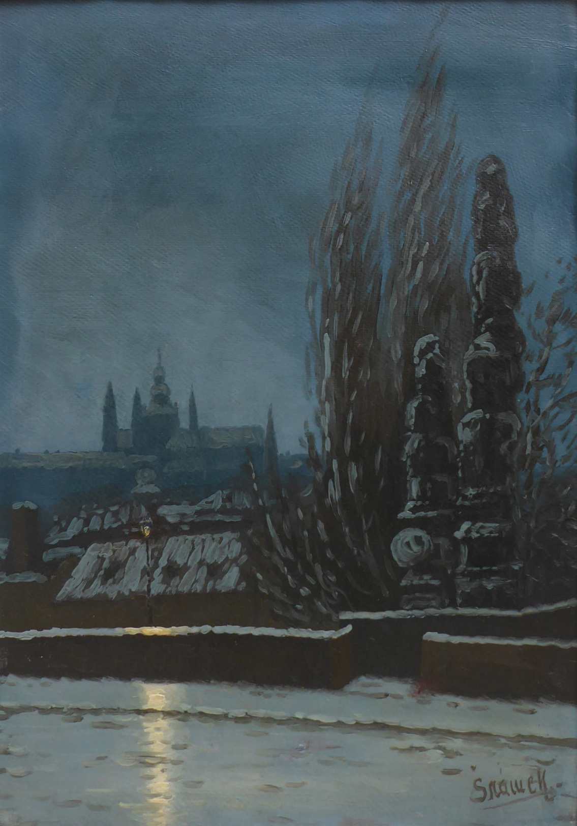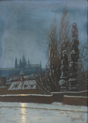 Olej na kartonu 50,5 cm x 35,5 cm. Signováno vpravo dole. Autor obrazu: Tomáš Šrámek (nar. 1885). Poetický pohled z Karlova Mostu na potemnělou Prahu s dominantou Pražského hradu. Paprsky plynových lamp intimně osvětlující sněhovou pokrývku. Stříbrný rám s vlnitým ornamentem. Československo 1910 – 1935. Celkový rozměr s rámem 60,5 cm x 46 cm.