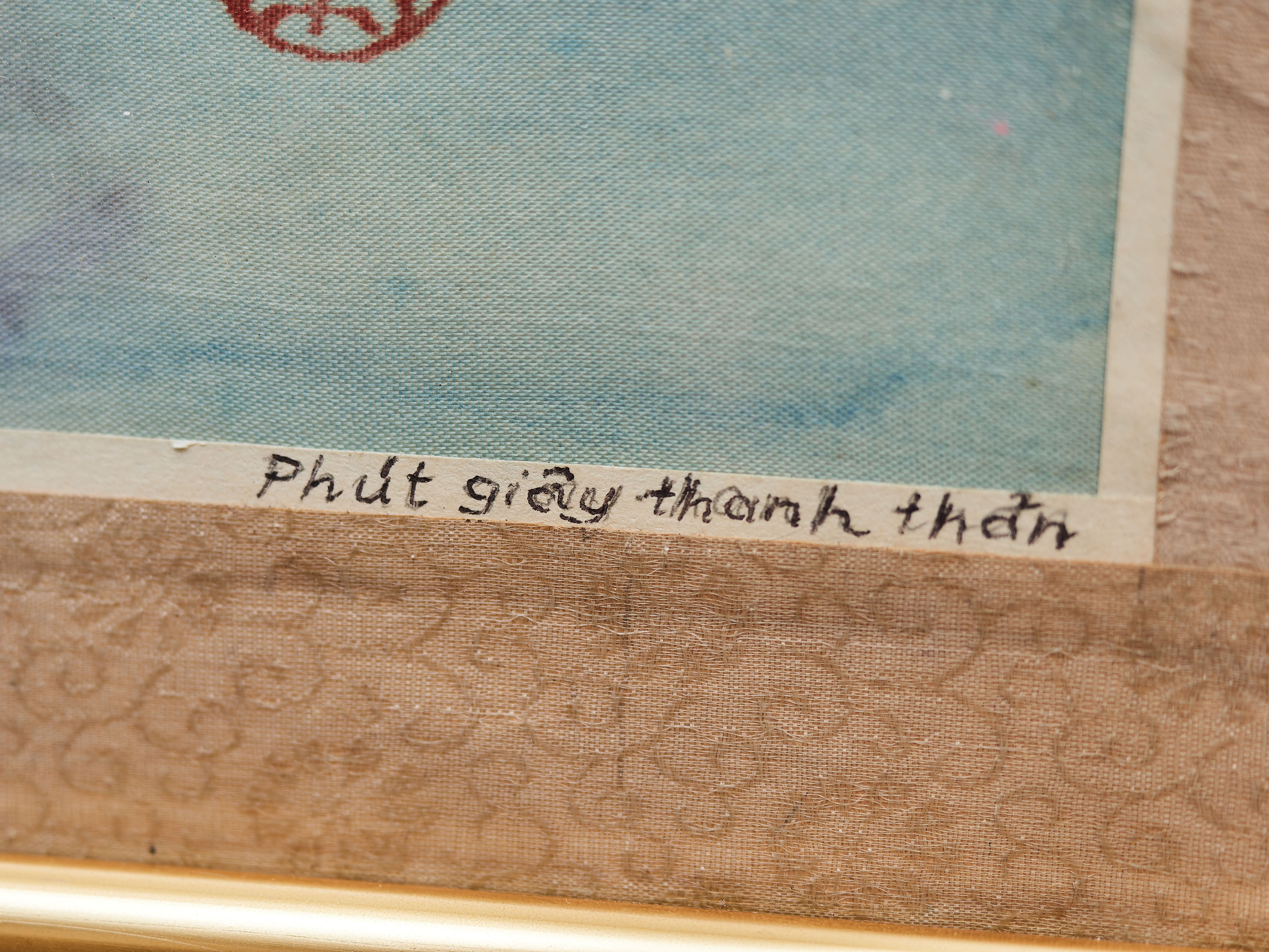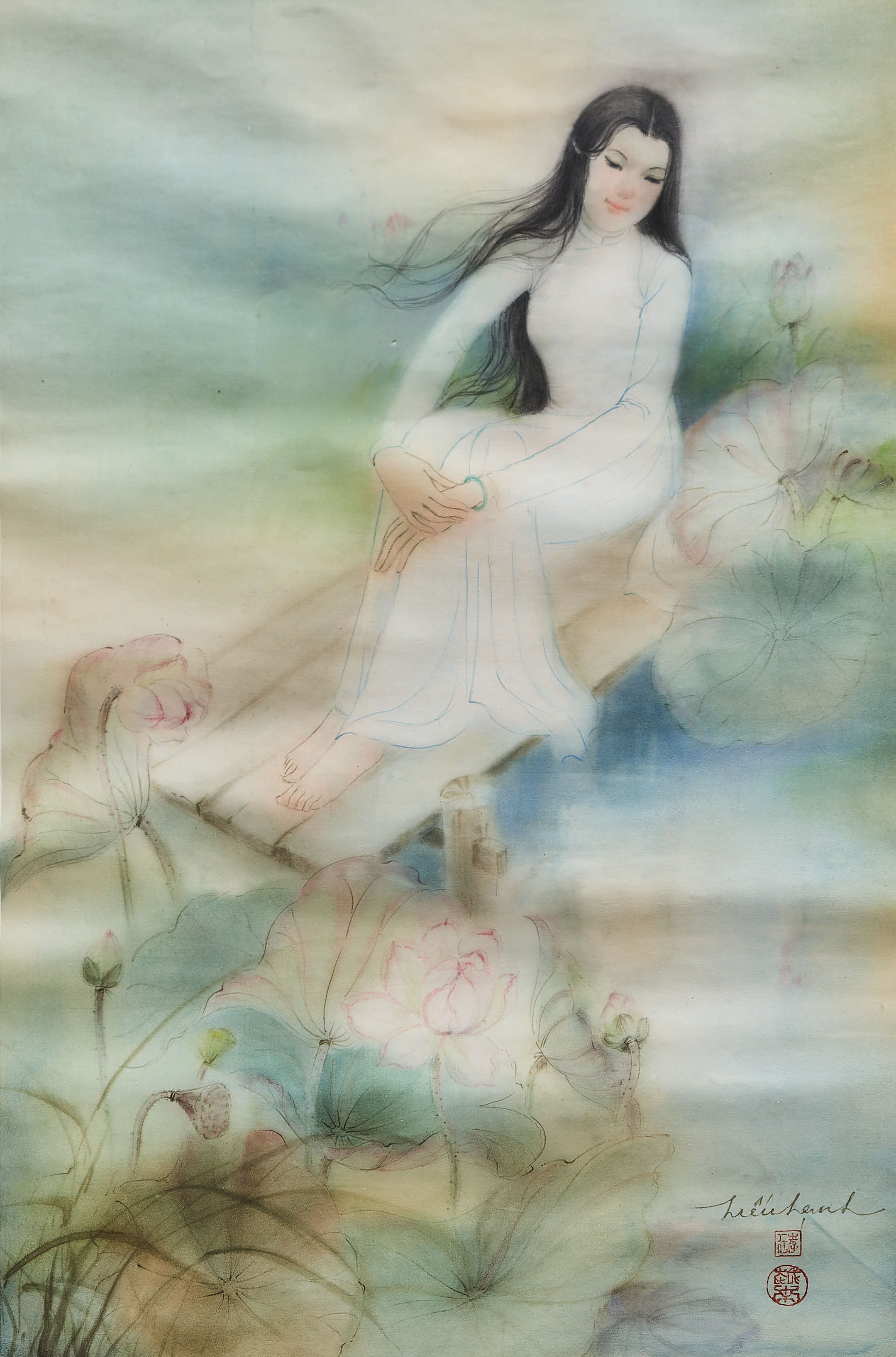 Originální malba na hedvábí vietnamské malířky Trần Thị Hiếu Hạnh představuje mladou ženu oděnou do tradičního bílého šatu áo dài, která usedá na dřevěném molu u jezírka plného rozkvetlých lotosů. Dílo nese název „Phút giây thanh thản”, což v překladu znamená „Chvíle klidu”.