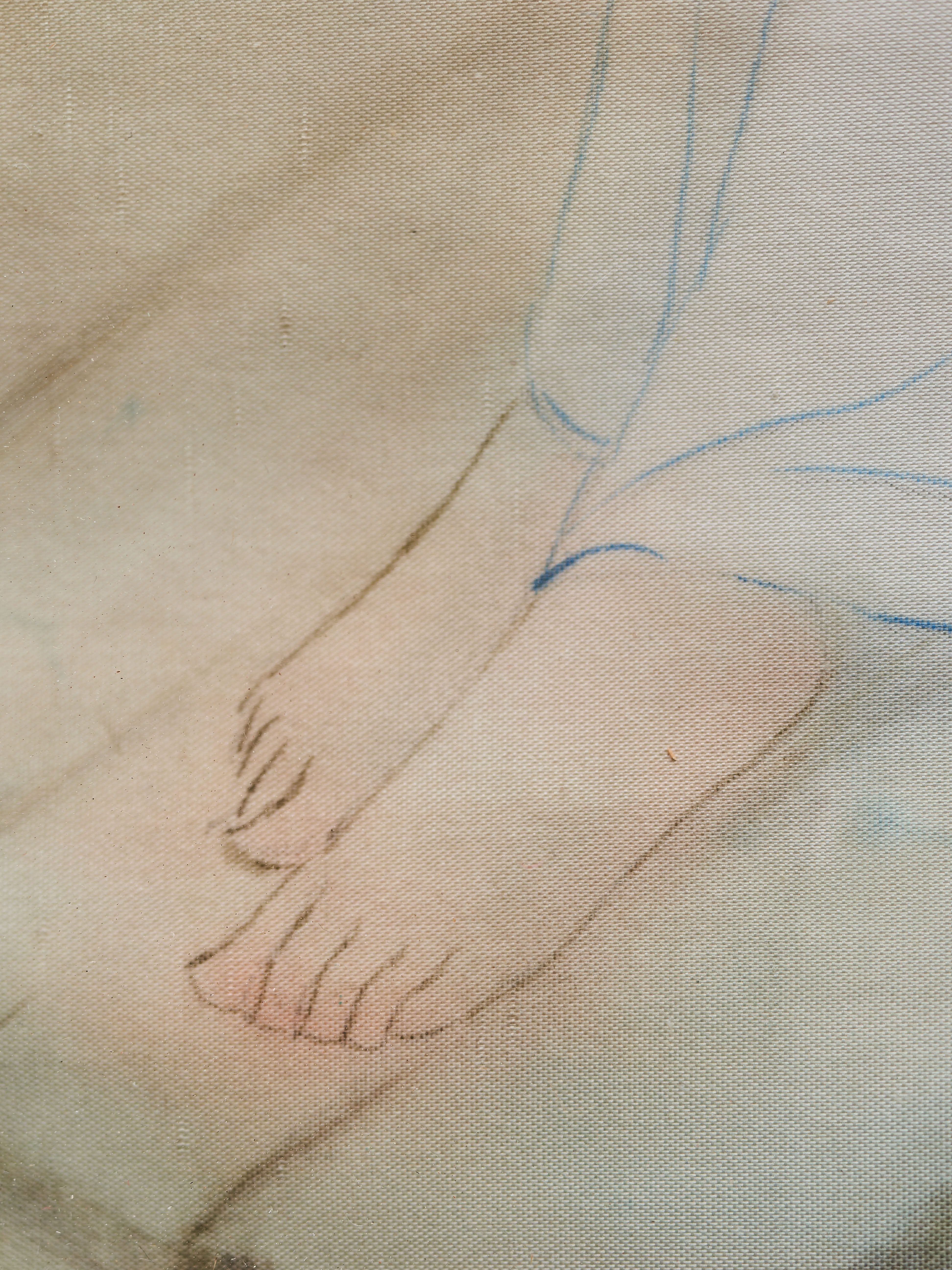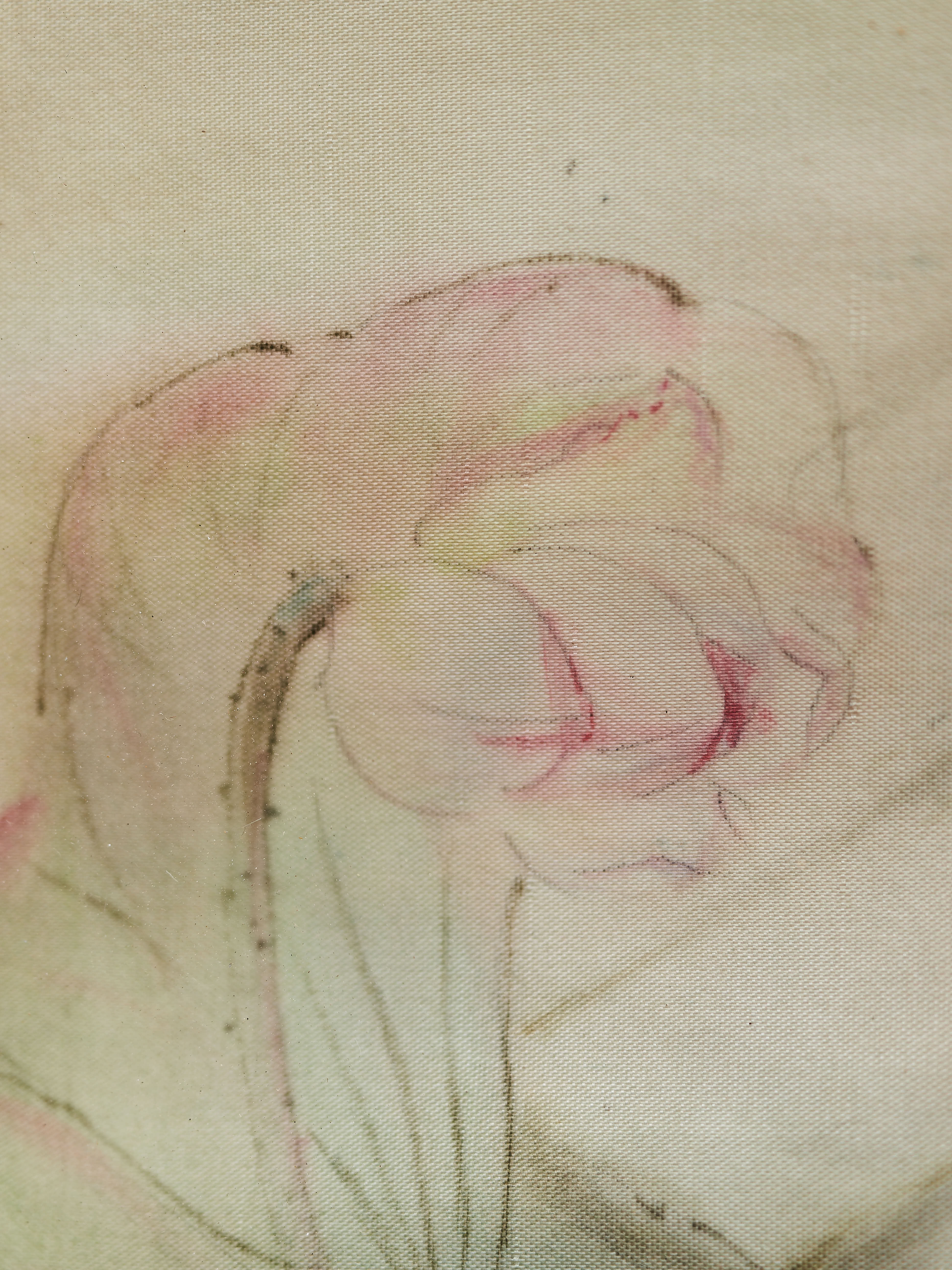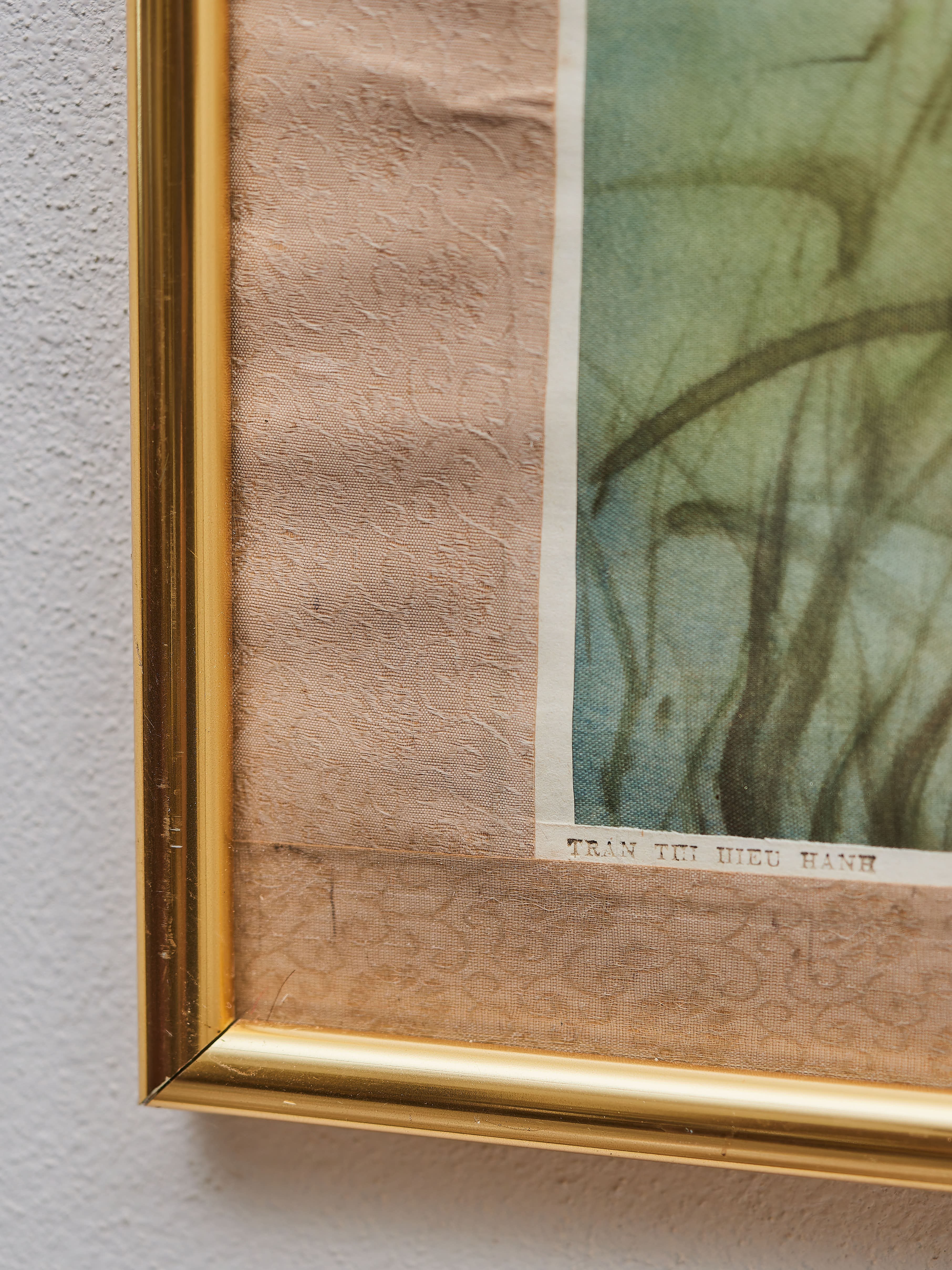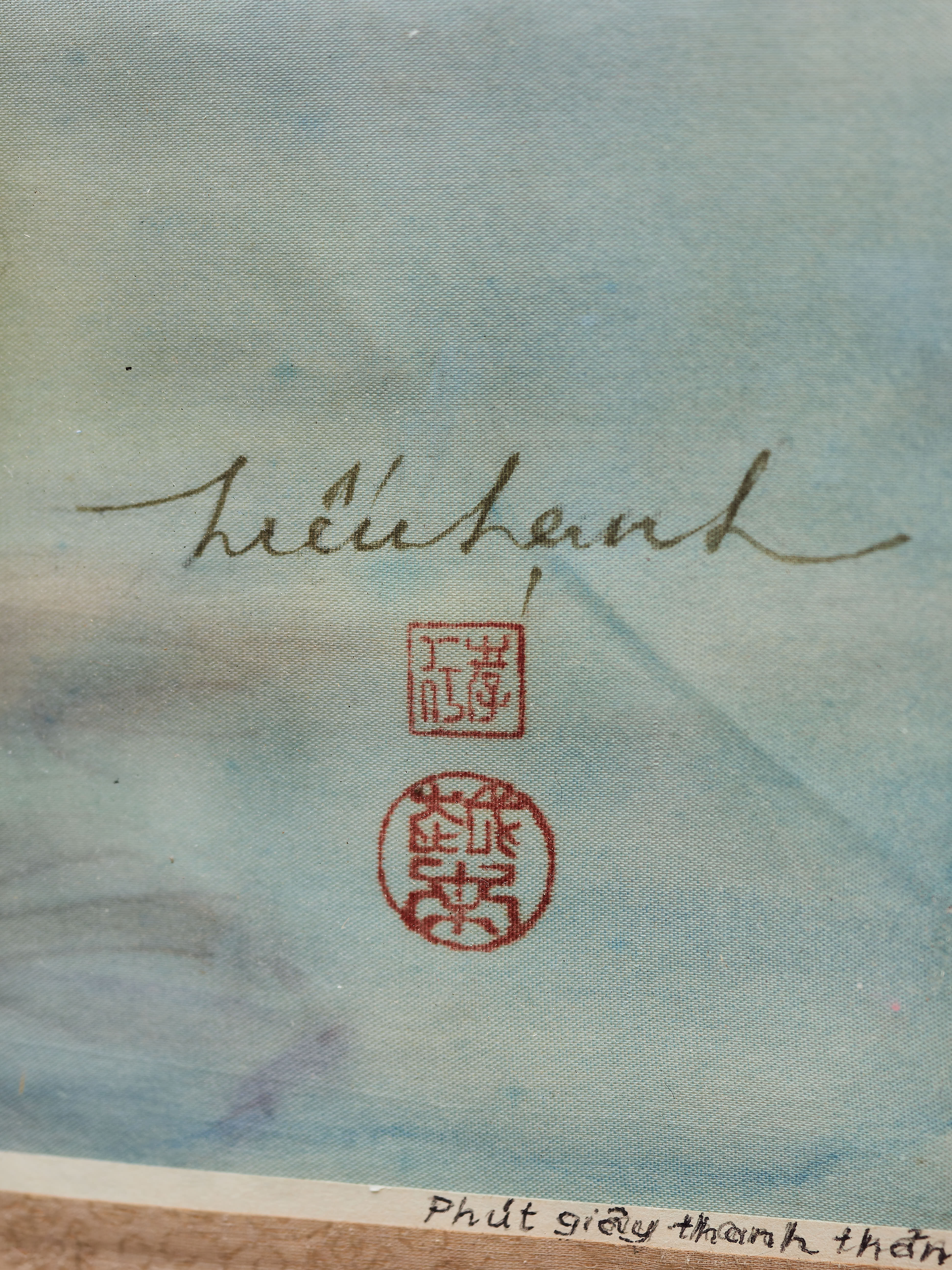 Technika malby na hedvábí je pro vietnamské výtvarné umění charakteristická – jemné akvarelové přechody, průsvitná struktura a subtilní linie dodávají obrazu éterickou atmosféru. Dílo je signováno jménem autorky, doplněno dvěma tradičními pečetěmi a působí velmi harmonicky a meditativně.