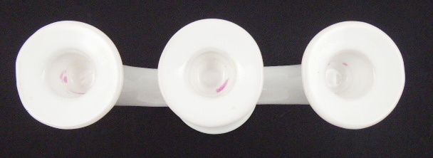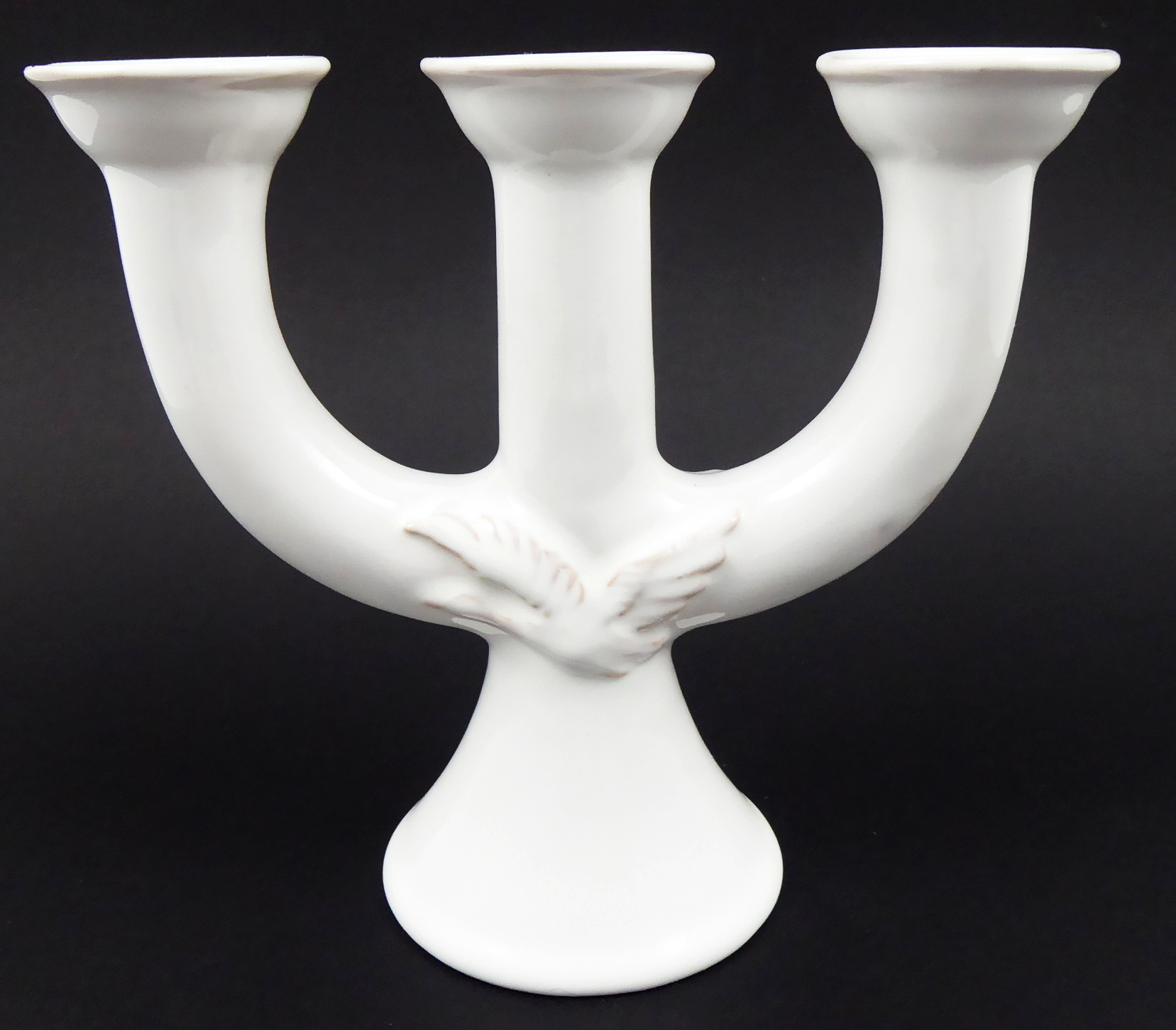 Umělecká keramika s bílou poloprůsvitnou glazurou. Klauzurní práce studentů Střední uměleckoprůmyslové školy v Bechyni. Keramický trojramenný svícen s letící figurou tažné Husy sněžní na obou stranách. Neznačeno. Československo, Bechyně, třetí třetina minulého století. Výška 18 cm, šířka 20 cm a průměr podstavce 9 cm.