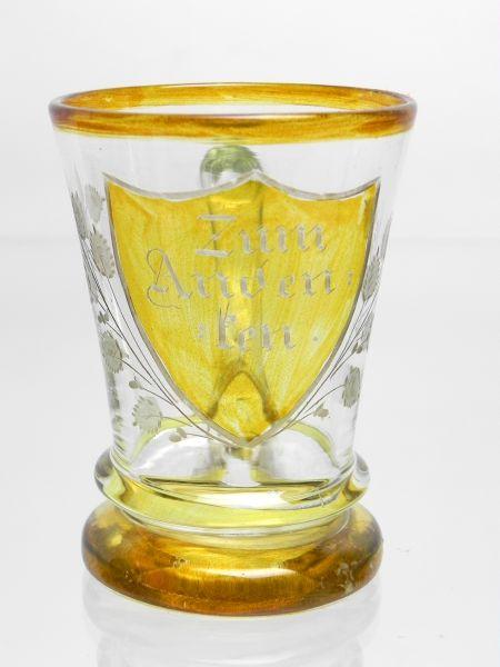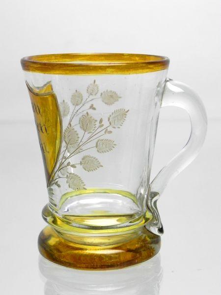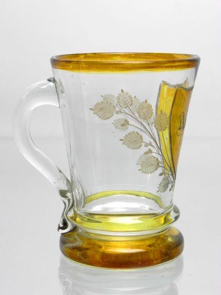 Materiál: čiré sklo, žlutá lazura, broušený dekor