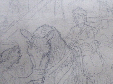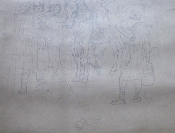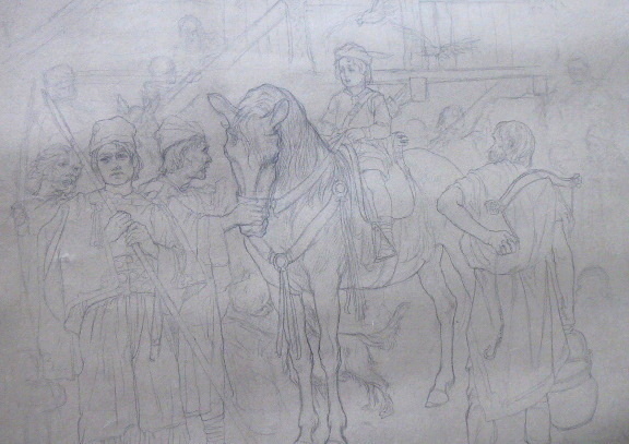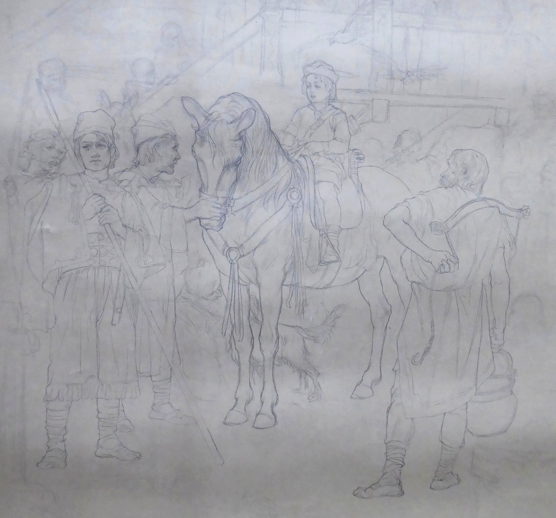 Čechy 1900 – 1910. Kresba tužkou na malířském kartonu 75 cm x 63 cm. Nesignováno. Vzadu přípis tužkou: Svatý Václav jako dítě na koni. Autor: František Urban (1868-1919). Nerámováno. Z umělecké sbírky Ladislava Šalouna.