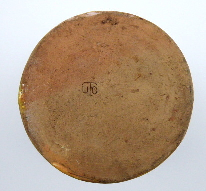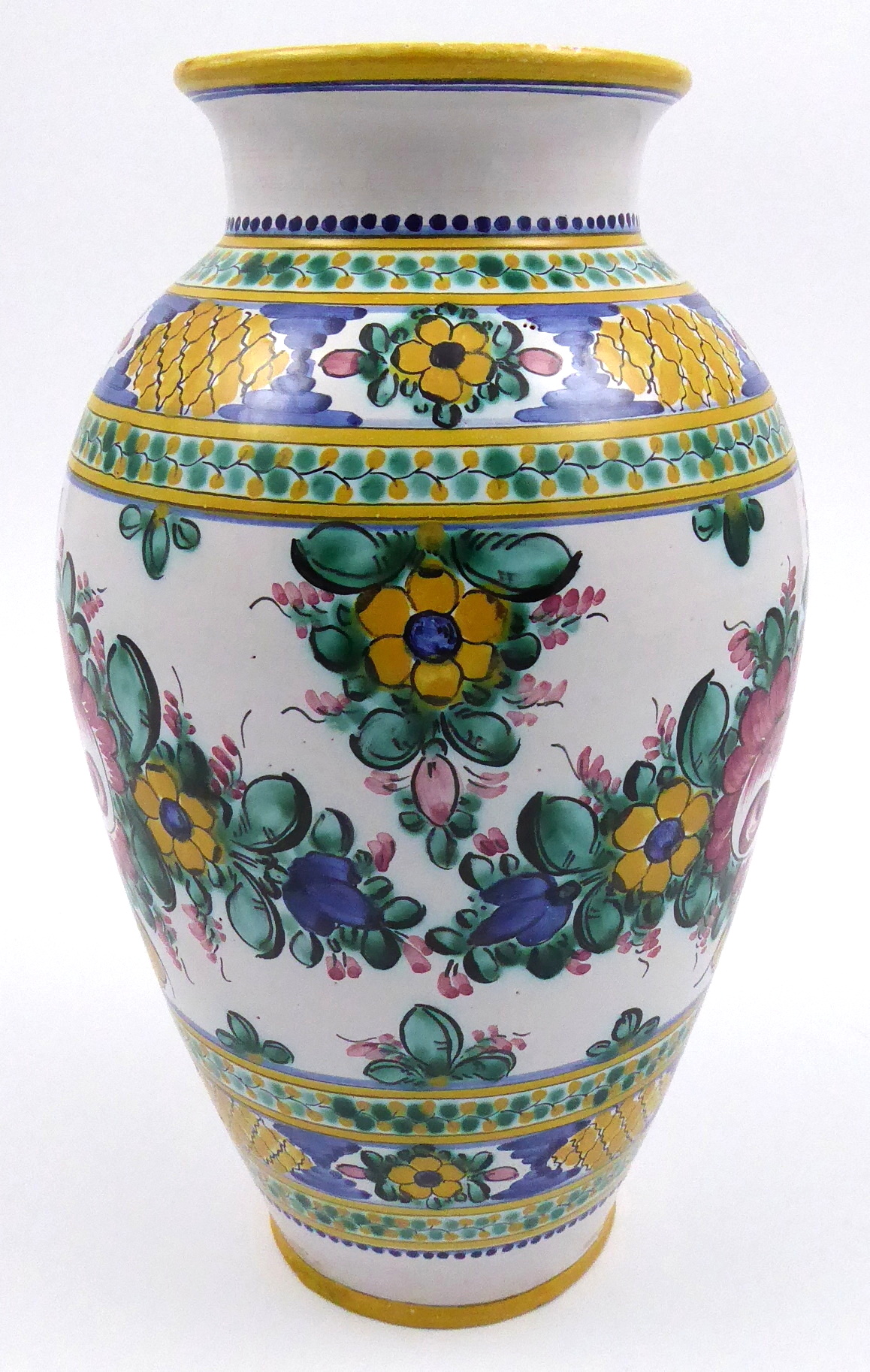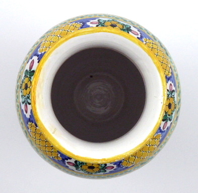 Ručně malovaná majolika. Vysoká majoliková váza z dílny Oldřicha Úředníčka. Váza s dekorem v tradičním duchu slováckého lidového umění s velkými květy, žlutými i modrými linkami a modrým punktováním. Značeno zespodu: značka výrobce UTO. Morava, Tupesy 1936 – 1947. Výška 31 cm.