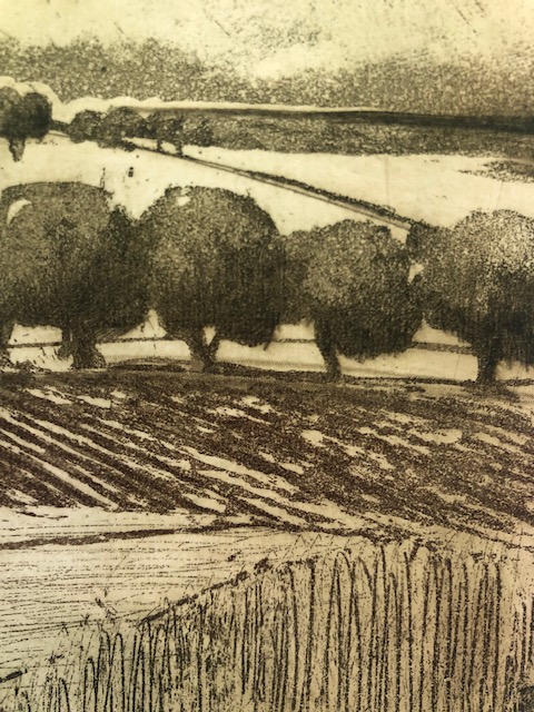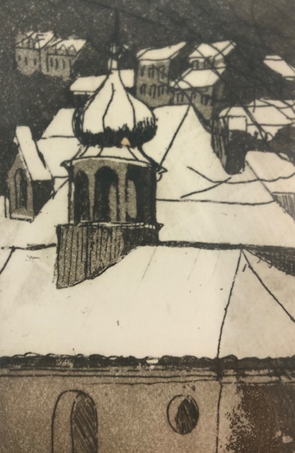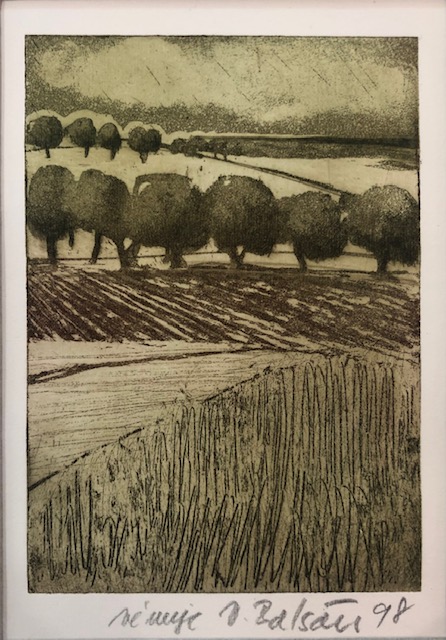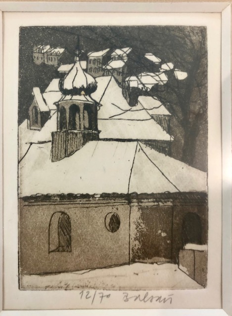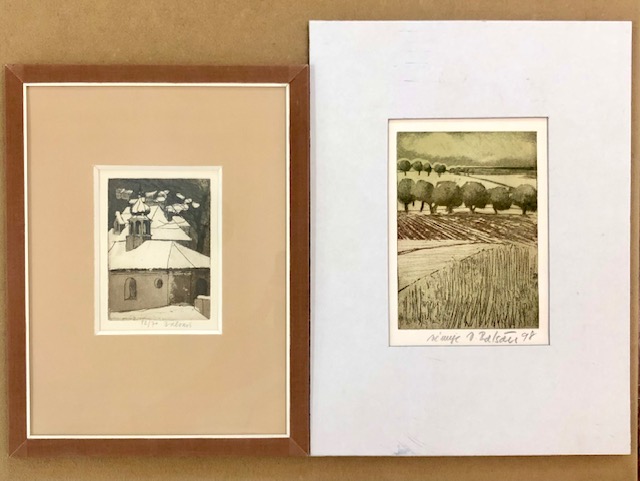Dva autorské tisky – litografie od malíře Václava Balšána. Litografie s vyobrazením kostela a krajiny.
