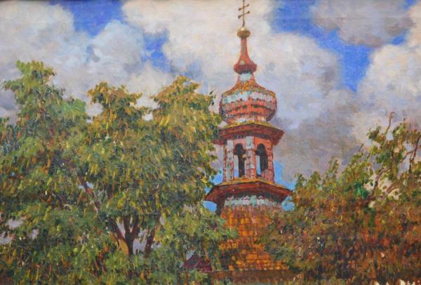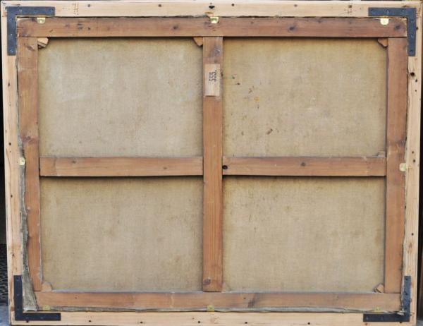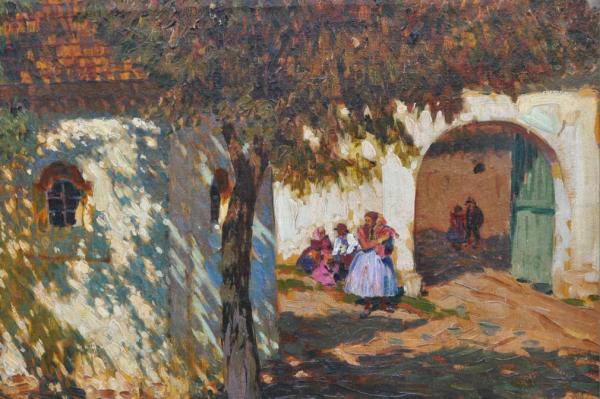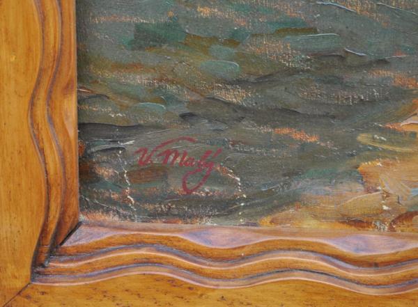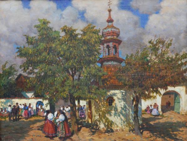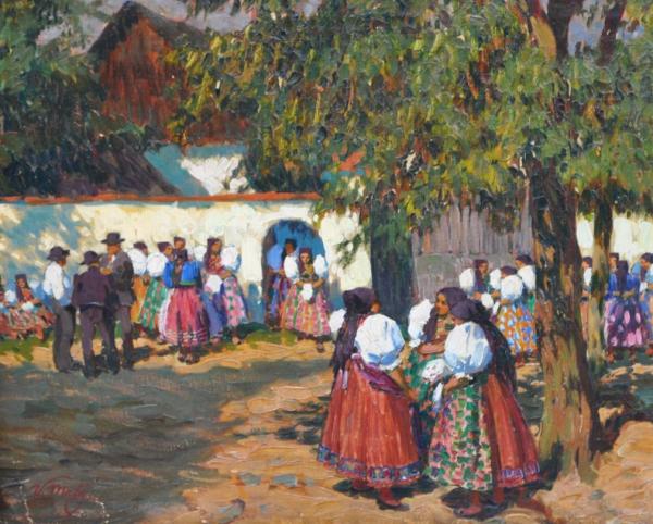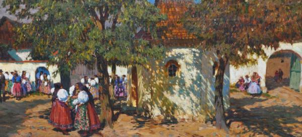 olej na plátně, malba zobrazuje přípravy na svatovavřineckou pouť na návsi u kapličky sv. Vavřince ve Stráži u Domažlic, signováno vlevo dole, kolem roku 1930; rozměr s vyřezávaným rámem 112×142 cm; vynikající autorova práce galerijní hodnoty