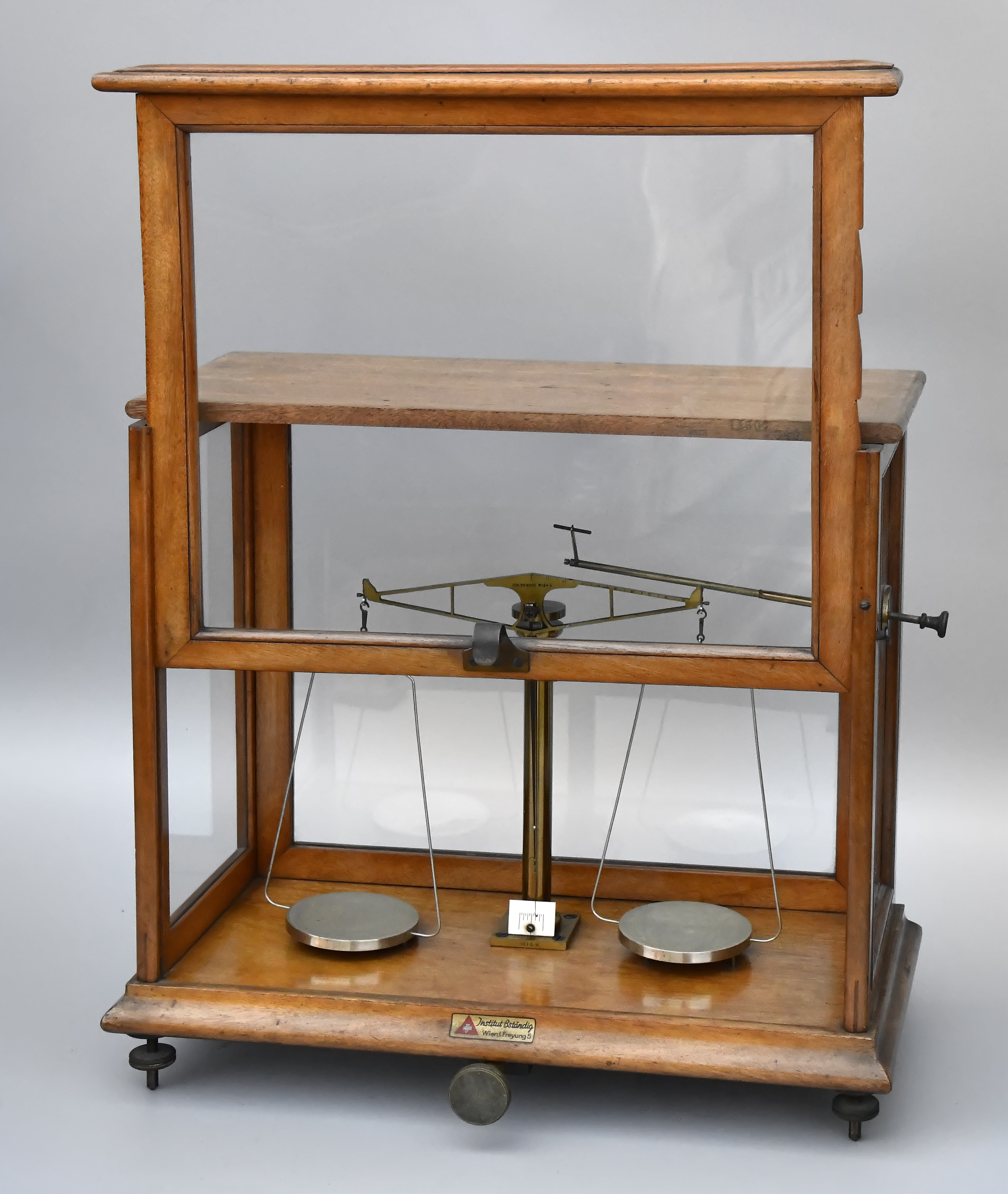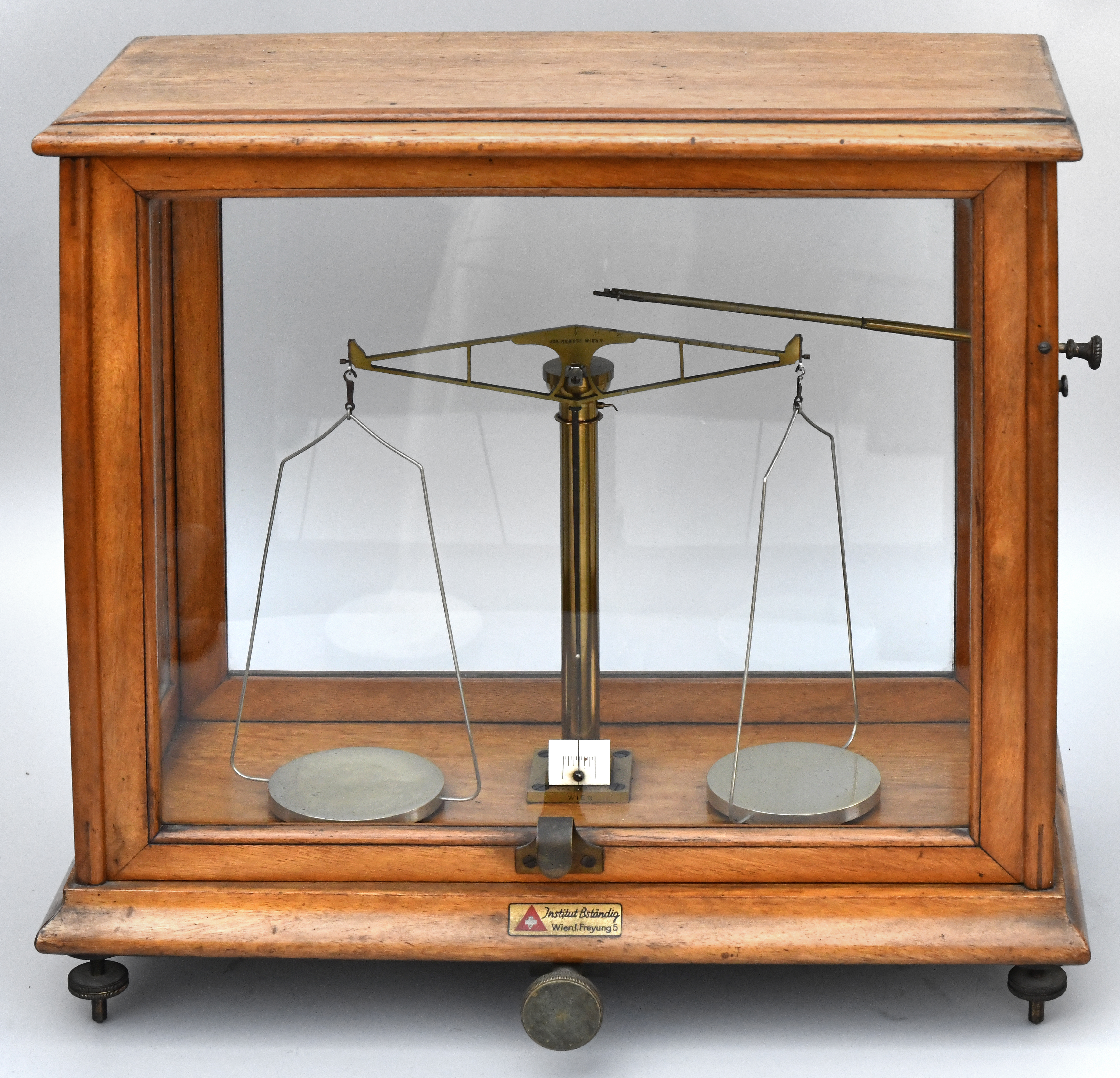 Laboratorní váhy, značeny na více místech Jos. Nemetz Wien, umístěny v prosklené skříňce z mahagonového dřeva – přední dvířka výsuvná, na třech výškově nastavitelných nožičkách, původní stav, 1890 – 1910.