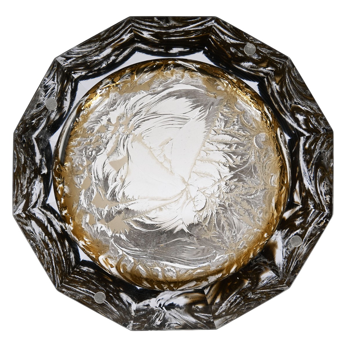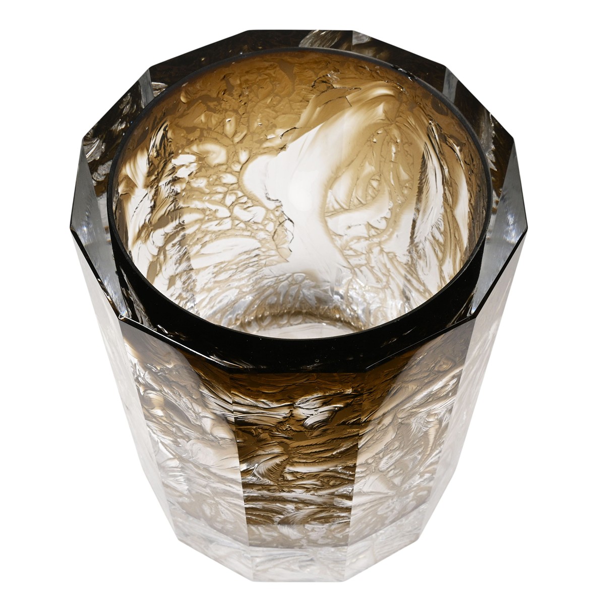 těžké, kvalitně zpracované umělecké sklo výška 25 cm, šířka 18,5 cm broušené hrany, vnitřní stěny ledované nesignováno výborný stav