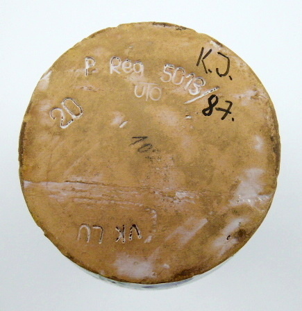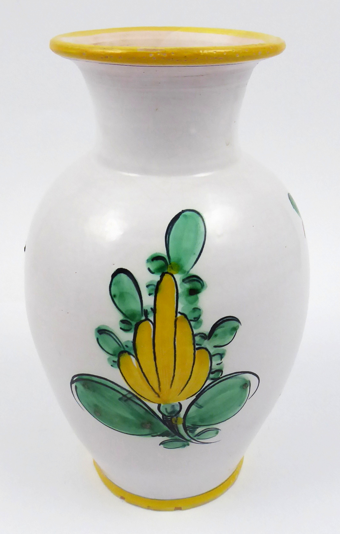 Světlá keramika ručně barevně malovaná. Dílna Oldřicha Úředníčka (1898-1984), Tupesy. Váza s ručně barevně malovanou květinovou kompozicí dozdobená žlutými linkami. Značeno zespodu: vtlačená písmena UTO, signatura malíře výzdoby K.J., vtlačená písmena P REA a čísla. Morava, Tupesy, 30. až 40. léta minulého století. Výška 20 cm.