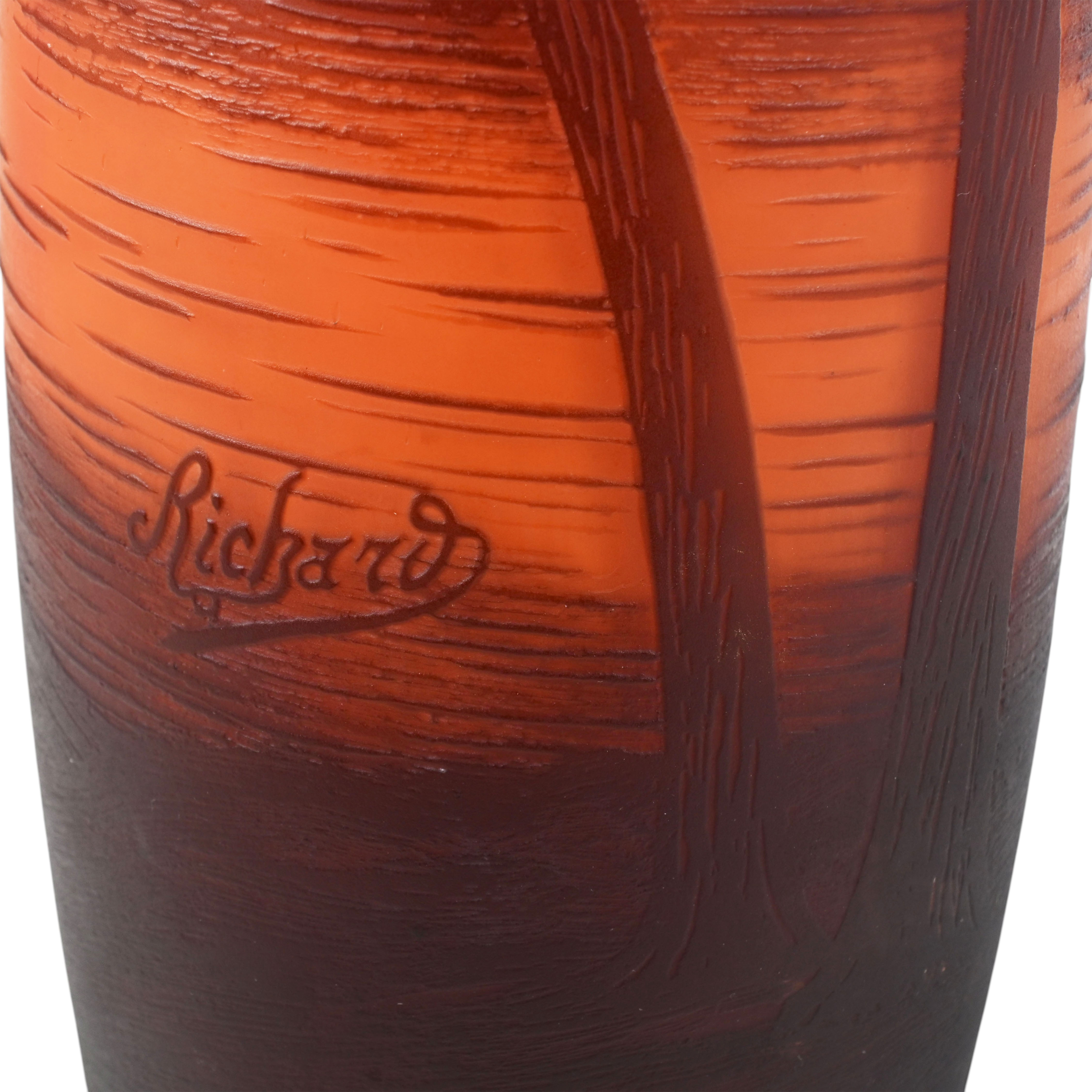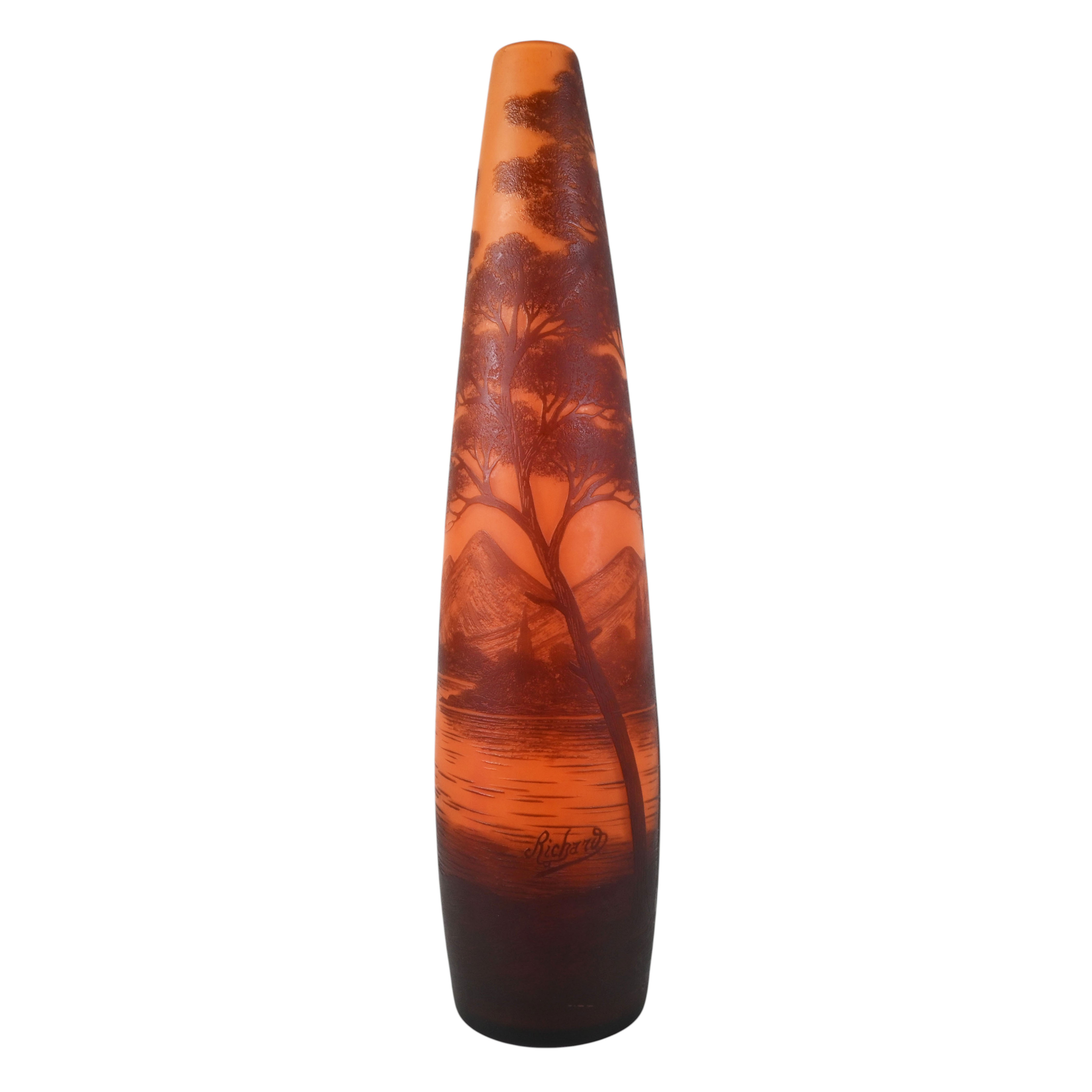 Leptané sklo | výška 39 cm | Klášterský mlýn, značeno \“Richard\“ | 20. léta 20. století | Firma Loetz vyráběla kamejové sklo pod značkou „Richard“ ve 20. letech 20. století, aby uspokojil poptávku po kamejovém skle na pařížském trhu | výborný stav