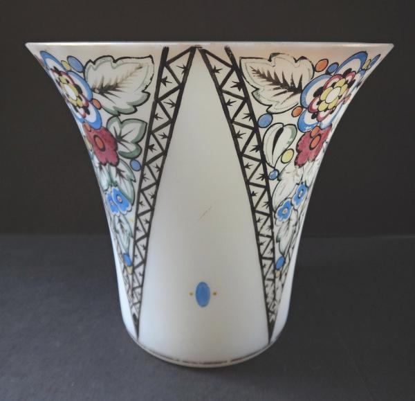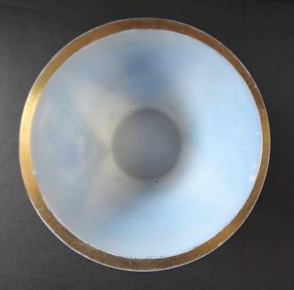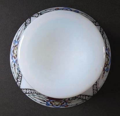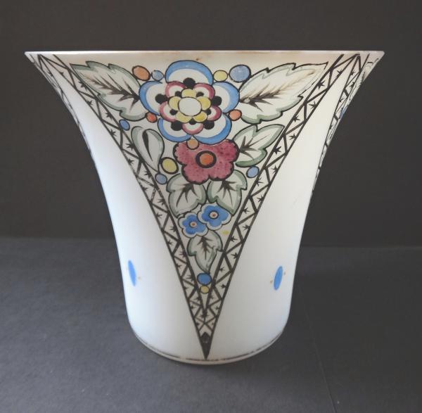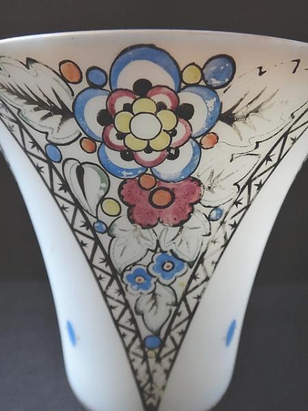 Mléčné kostní sklo s malovaným vzorem. Trychtýřovitého tvaru, spodní část kulatá, válcovitá, horní projmutá rozšířená. Zdobená po obvodu čtyřmi trojúhelníky střídavě s malovaným květinovým art deco a v prázdných trojúhelnících malovanými modrými oválky se dvěma žlutými tečkami. Zlacený horní okraj. Čechy, Kamenický Šenov? 1920 – 1940. Výška 11 cm, šířka 12 cm.